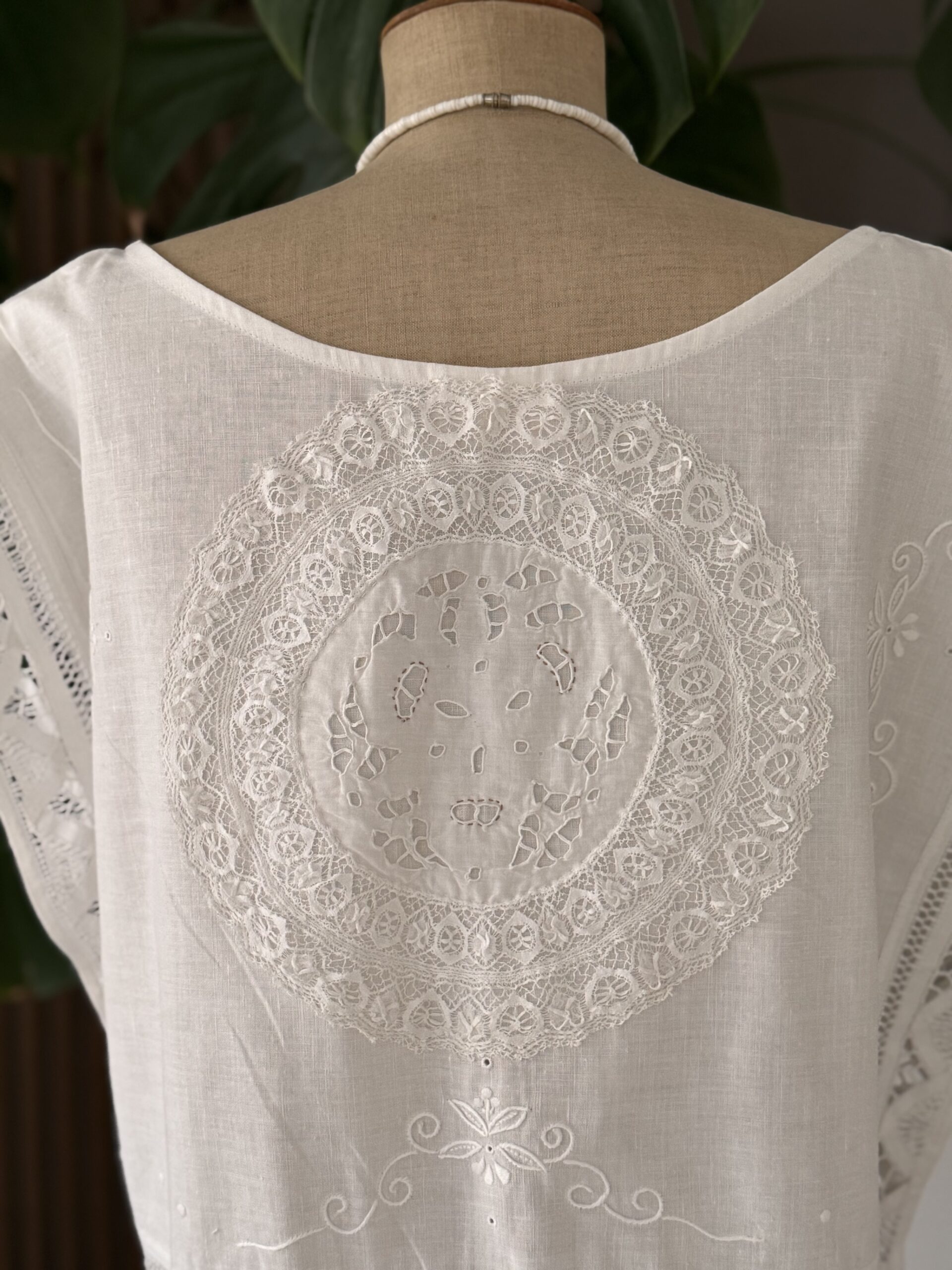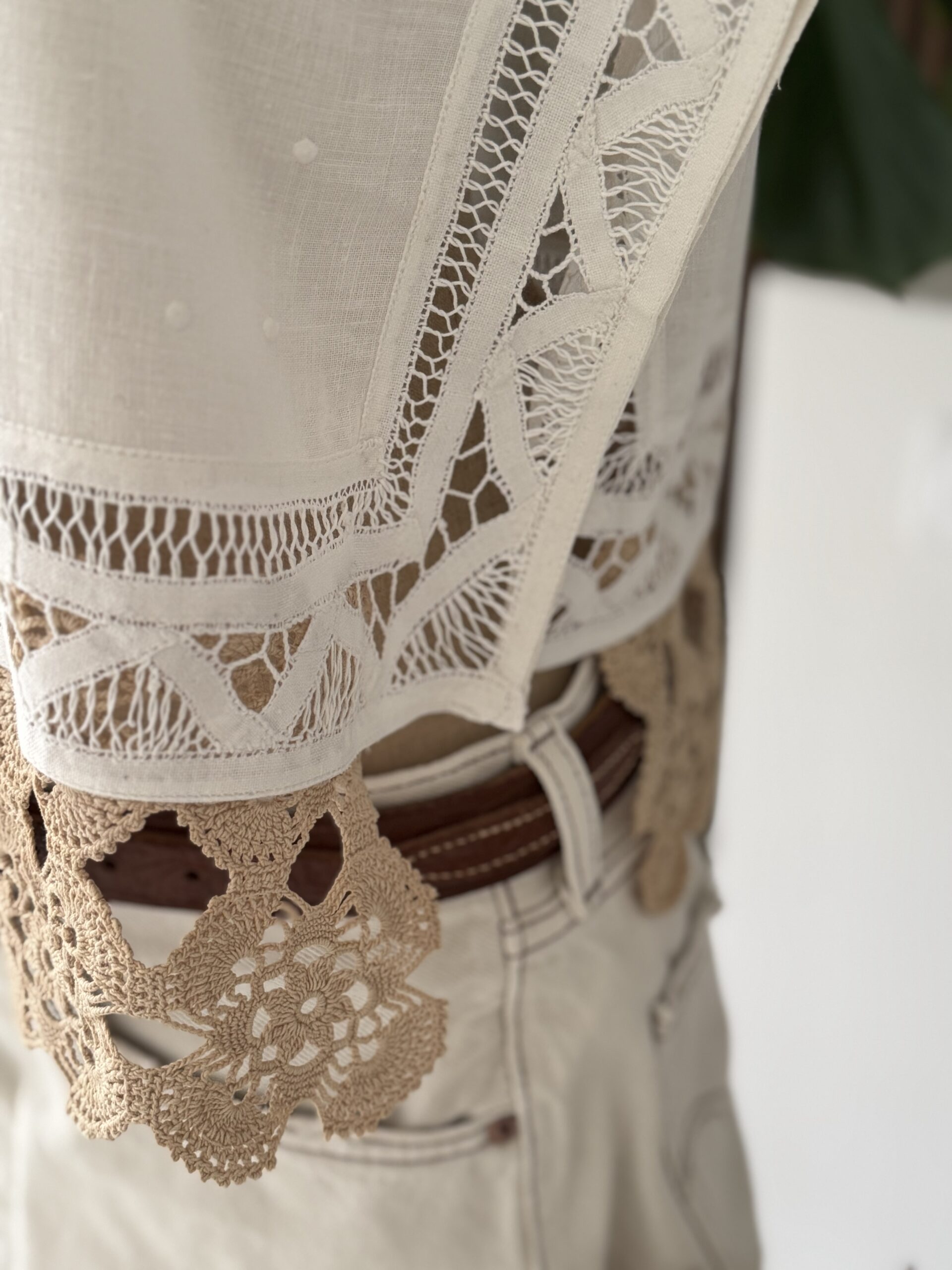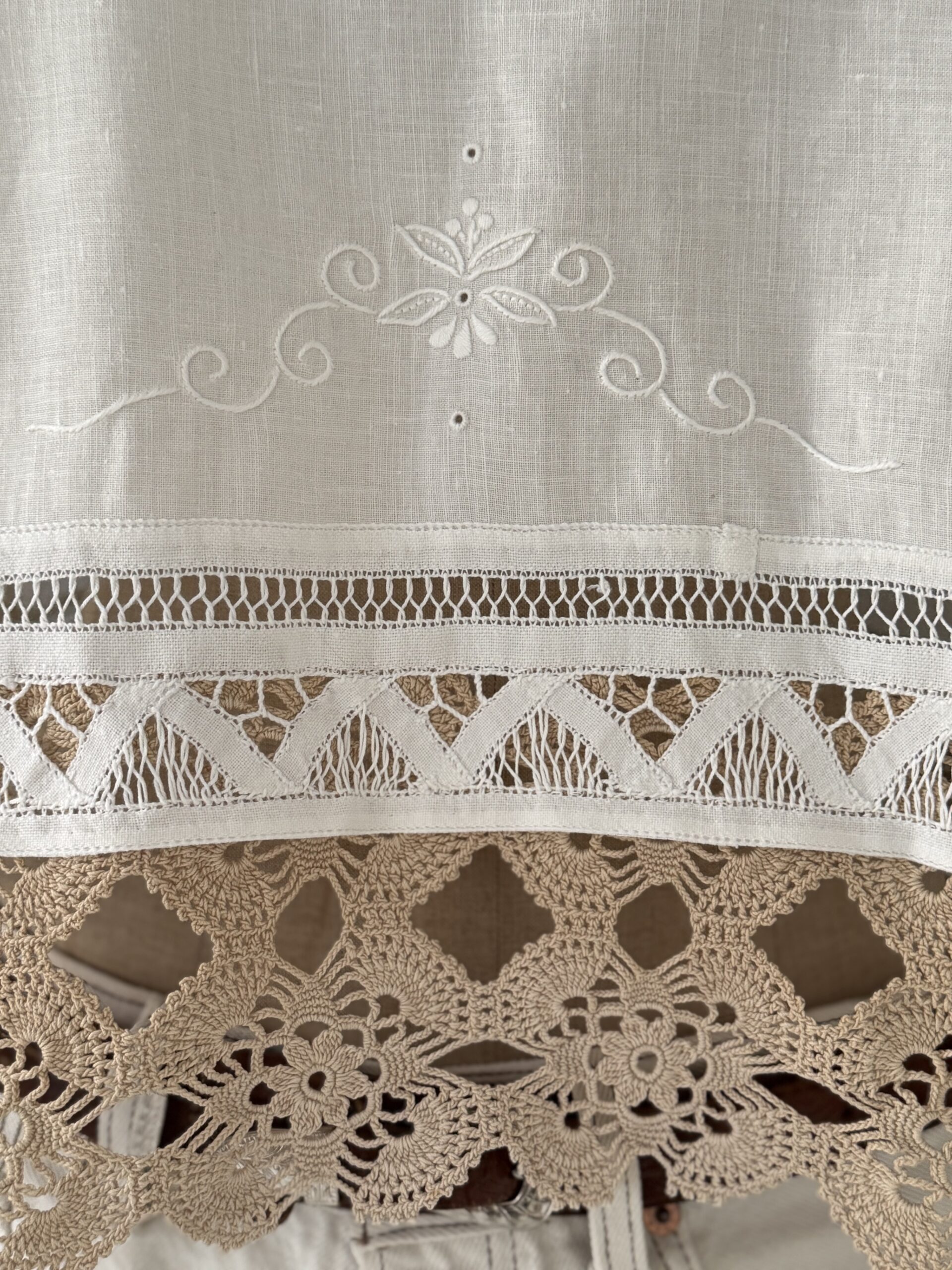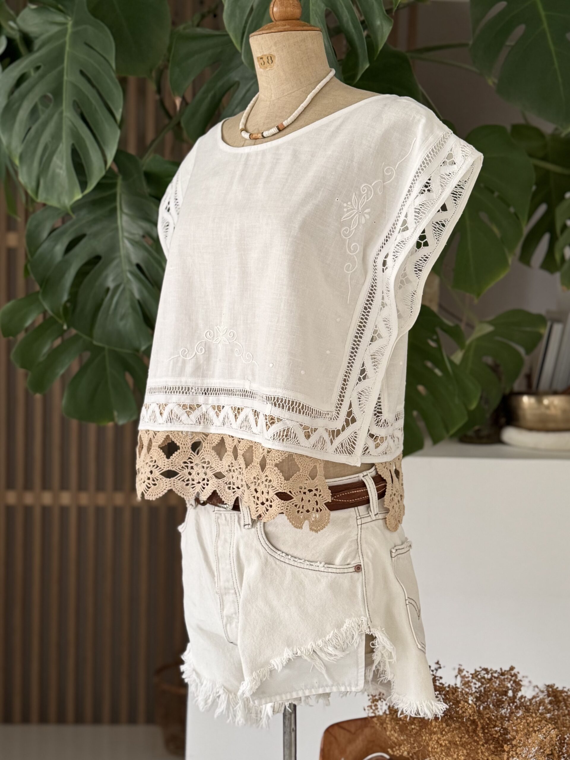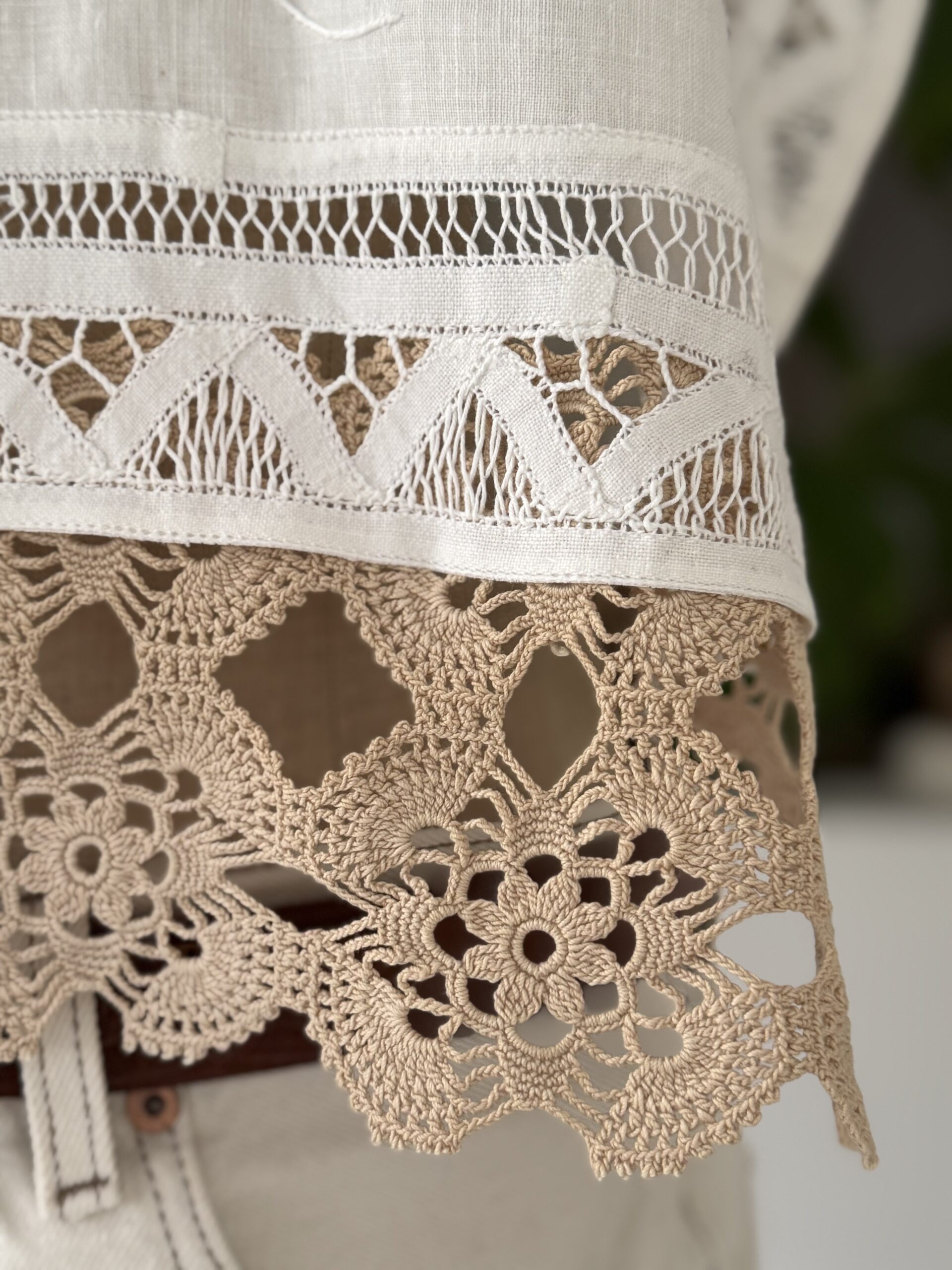 Blouse upcyclée confectionnée dans un travers de table ancien en coton datant du 20ème siècle & finition bas en crochet coton coloris beige. Empiècement dos en dentelle piqué main.