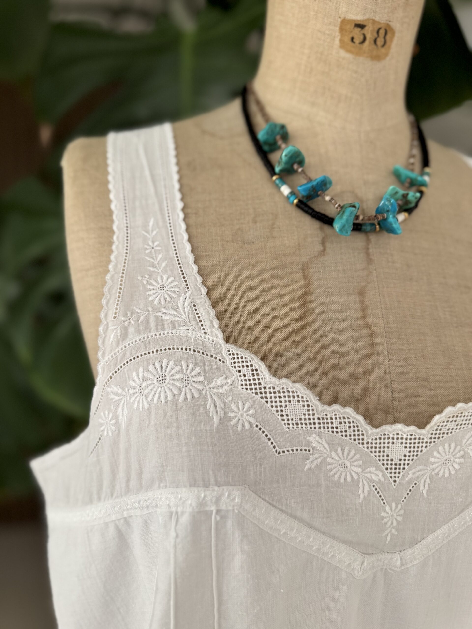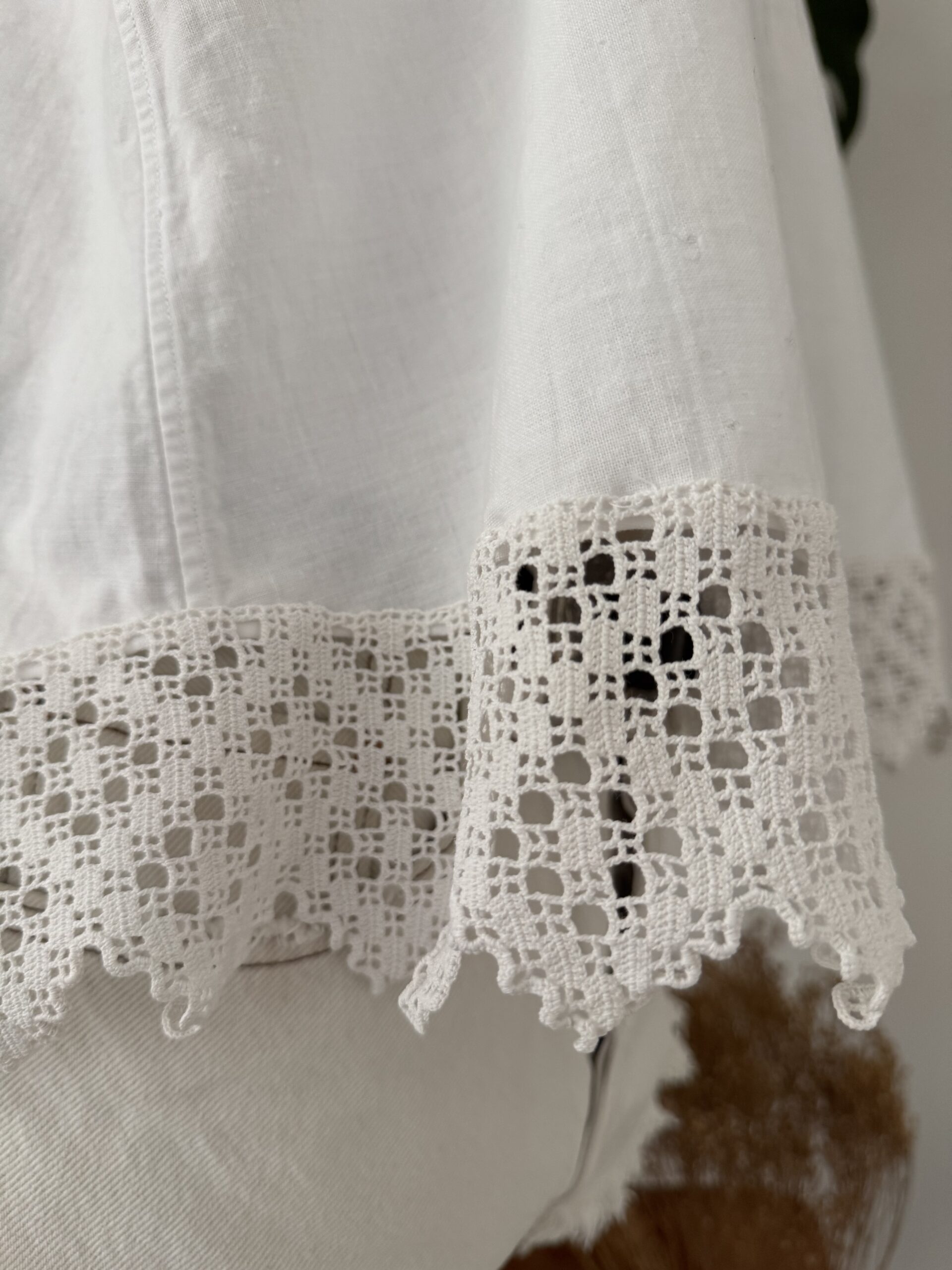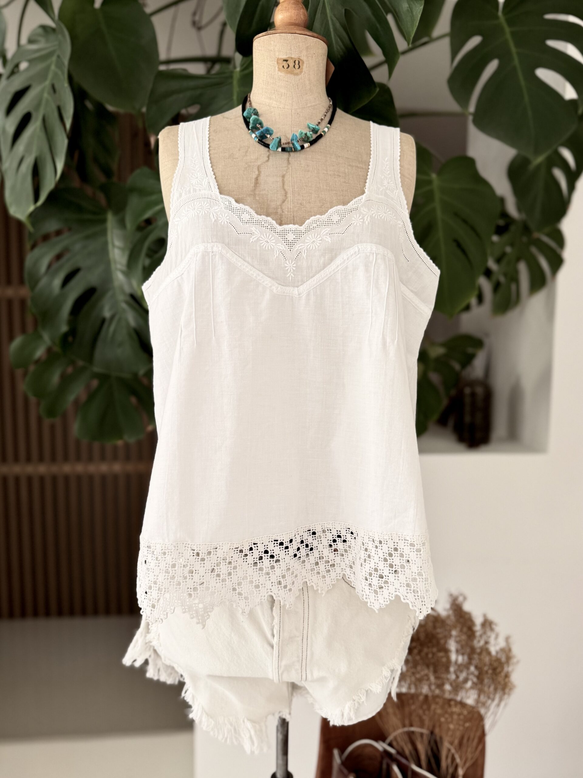 Débardeur vintage en coton tissé datant de la fin du 19ème siècle, finition nervures et broderies d’époque. Empiècement de dentelle aux bretelles et en bas de vêtement. Les éventuelles irrégularités dans le tissage du coton sont liées à l’histoire et l’authenticité de la blouse. Une pièce unique!