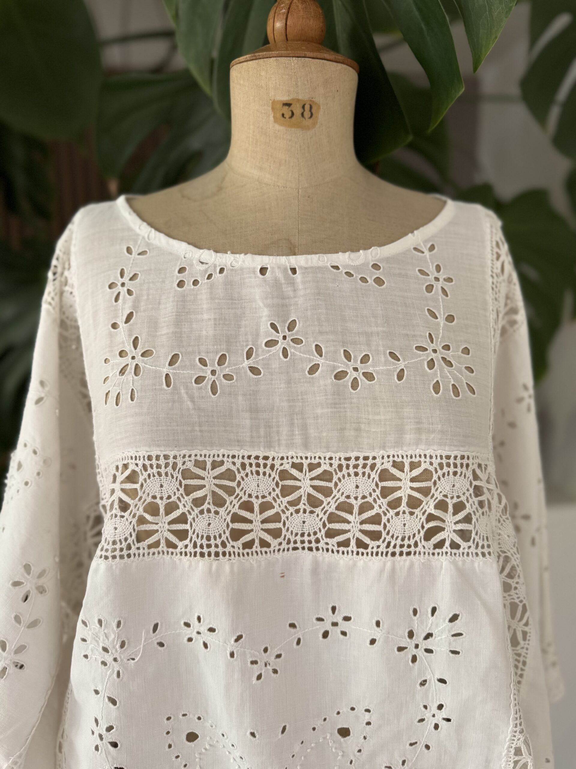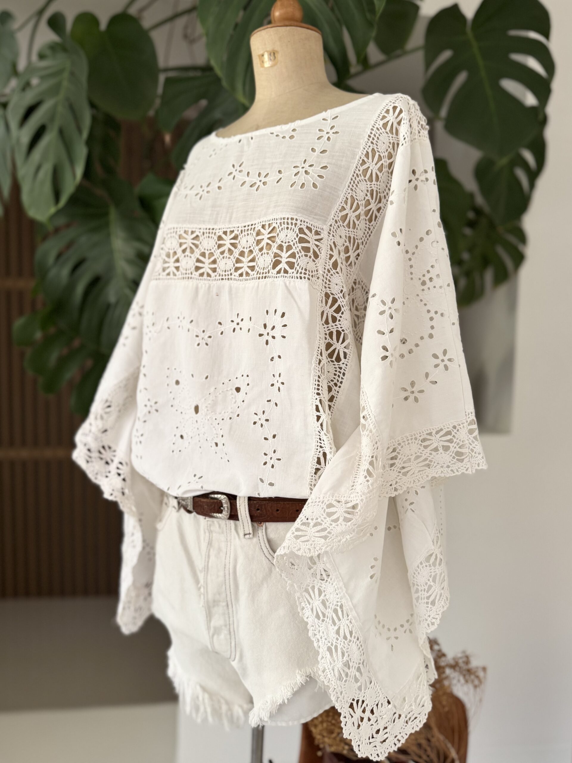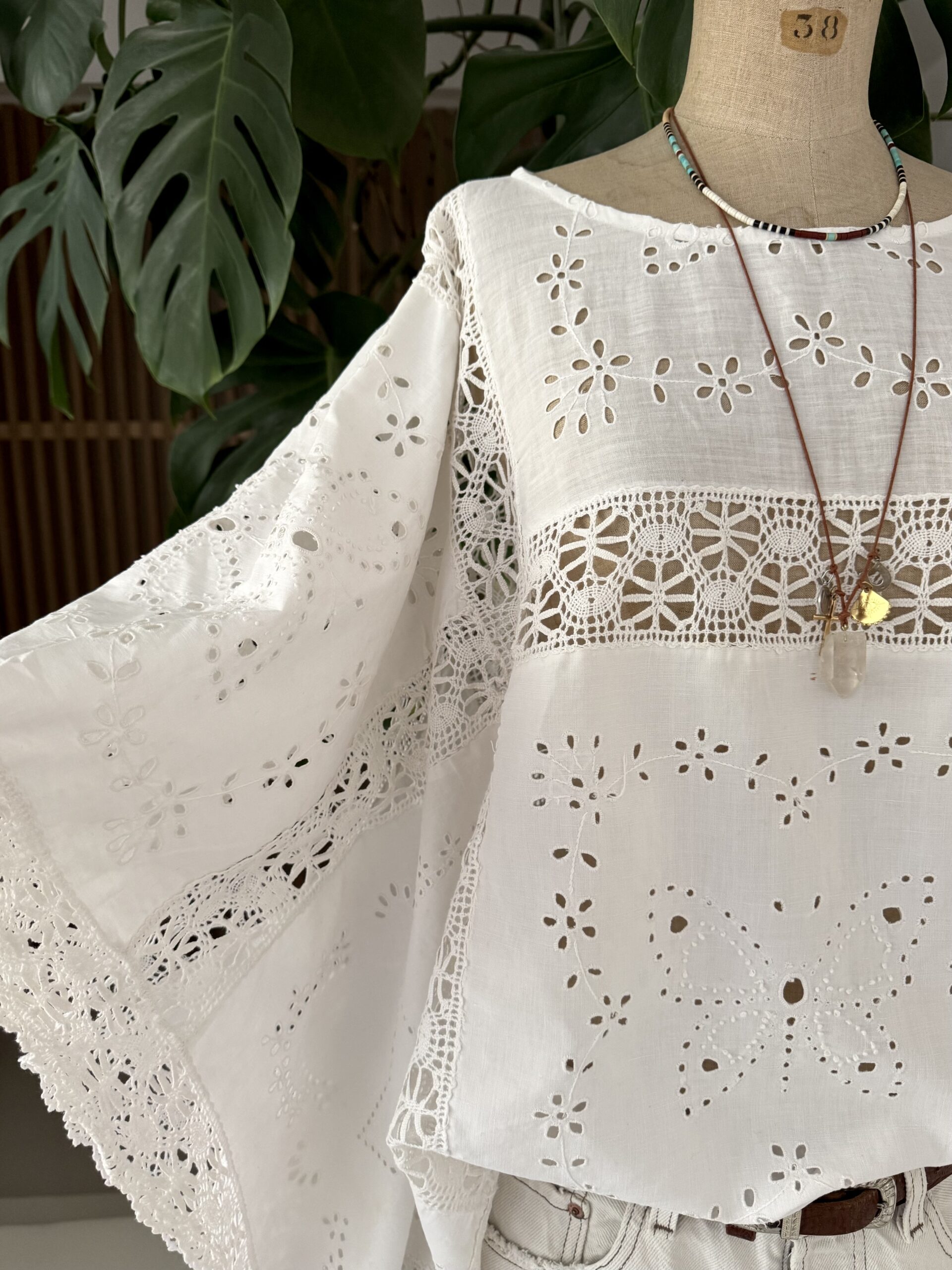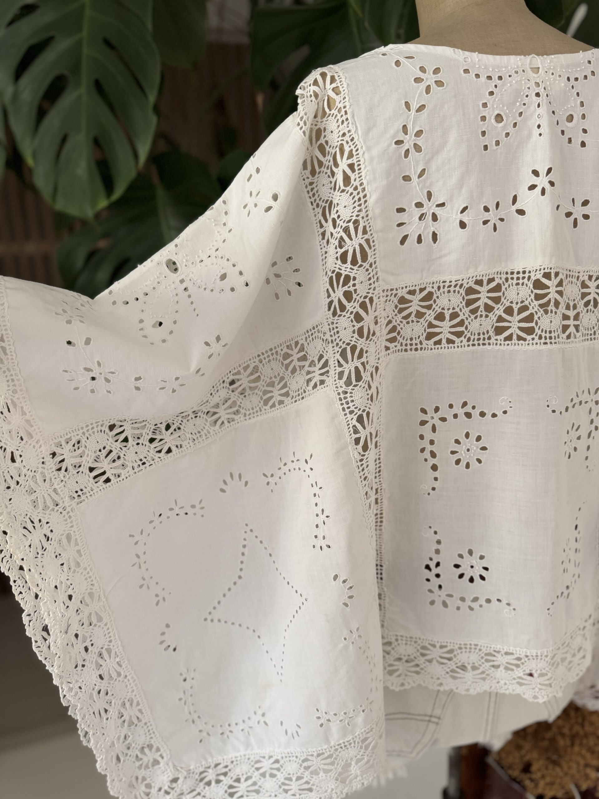 Blouse en forme de Poncho confectionnée dans du linge en dentelle entièrement confectionnée de manière artisanale datant du 19ème siècle. La pièce est vendue avec le débardeur de dessous. Une pièce unique! Les quelques imperfections sur le tissu et la dentelles témoignent de l’authenticité du produit.