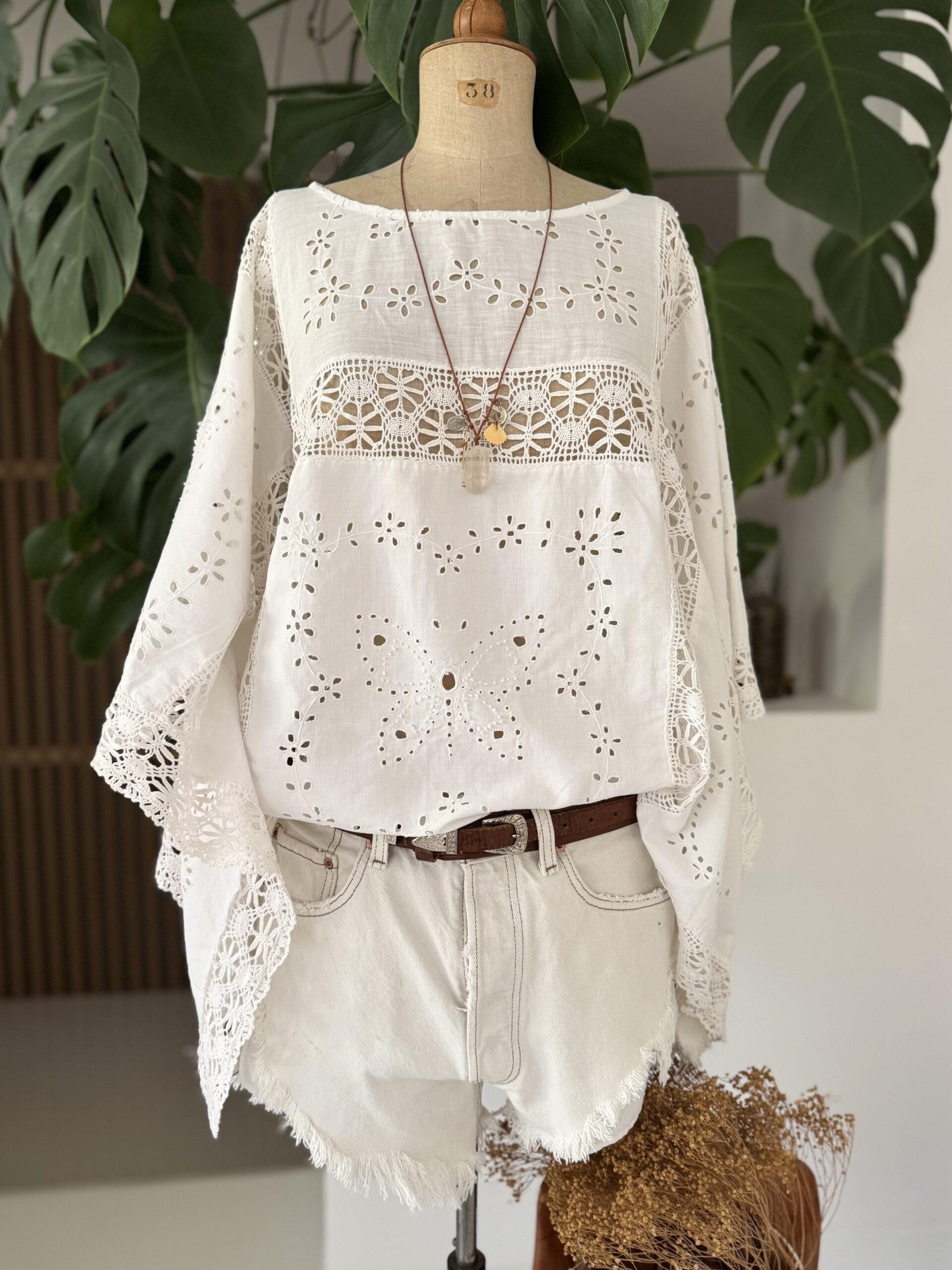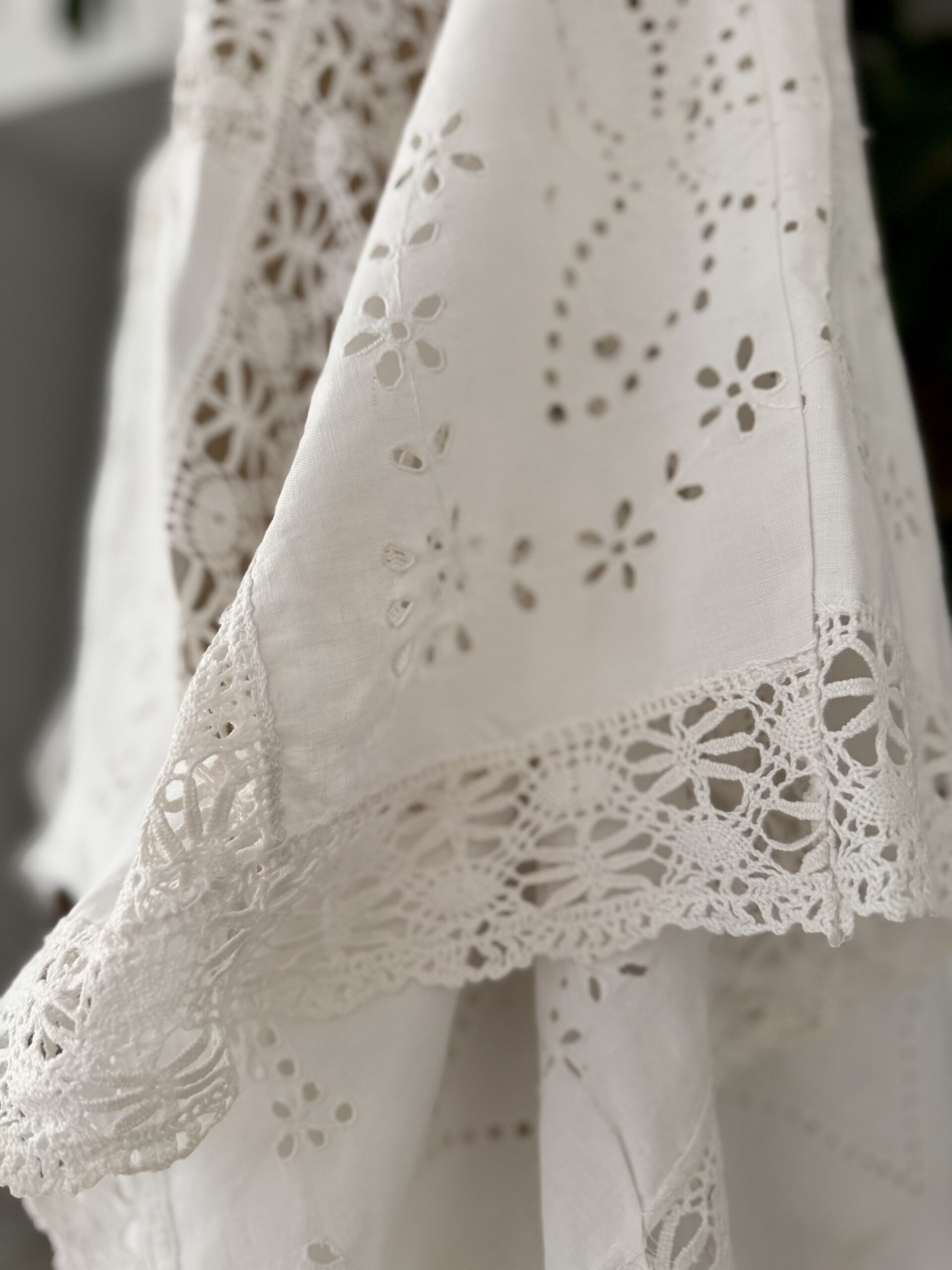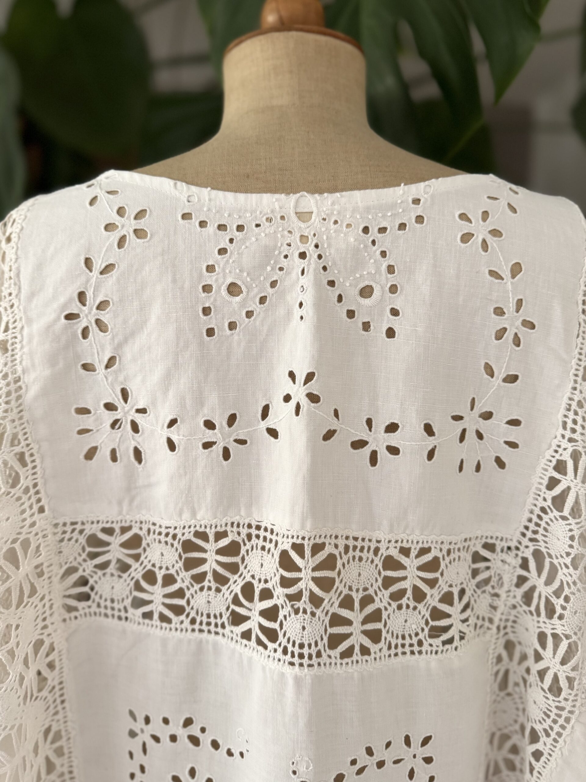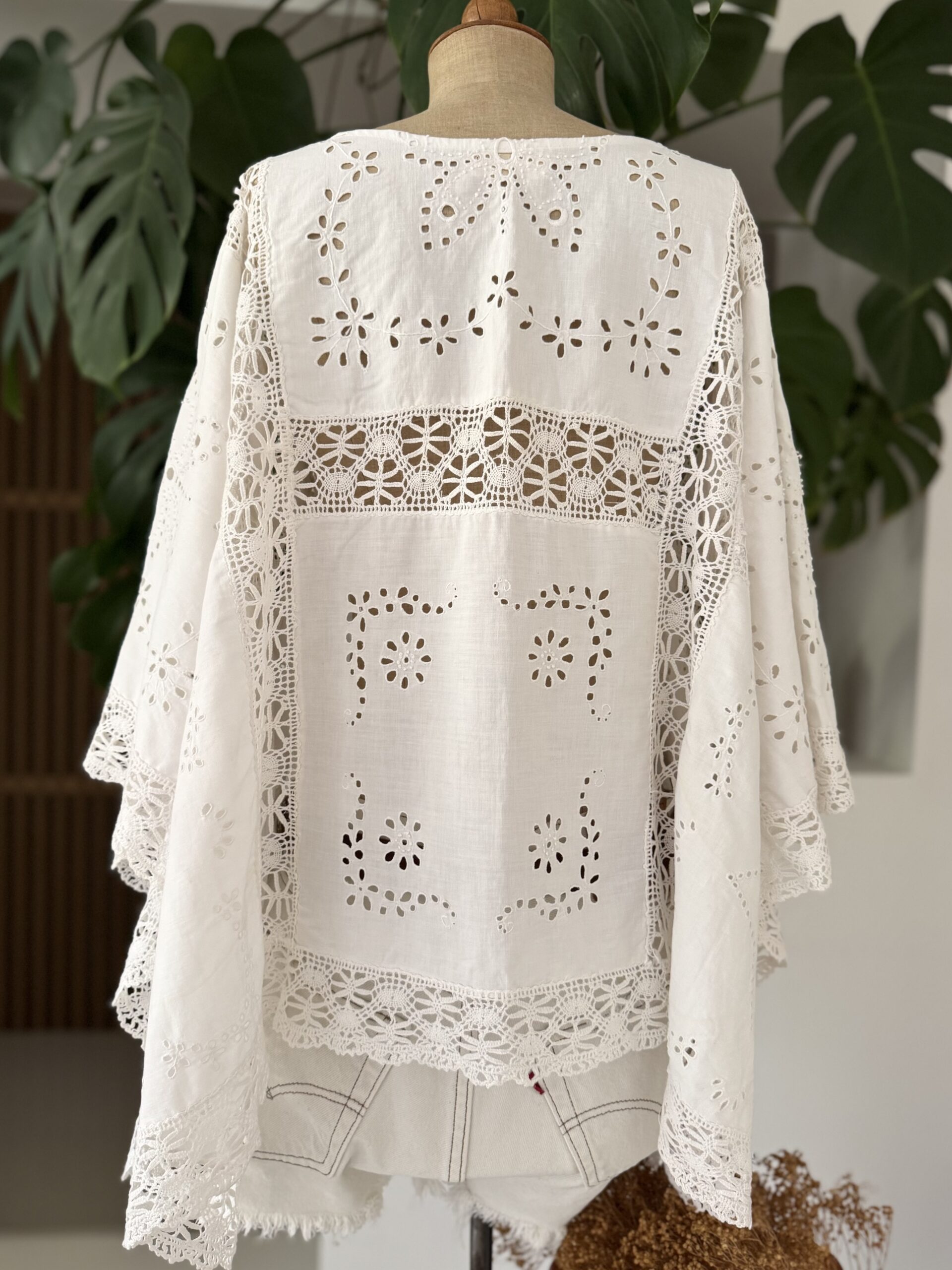 Blouse en forme de Poncho confectionnée dans du linge en dentelle entièrement confectionnée de manière artisanale datant du 19ème siècle. La pièce est vendue avec le débardeur de dessous. Une pièce unique! Les quelques imperfections sur le tissu et la dentelles témoignent de l’authenticité du produit.