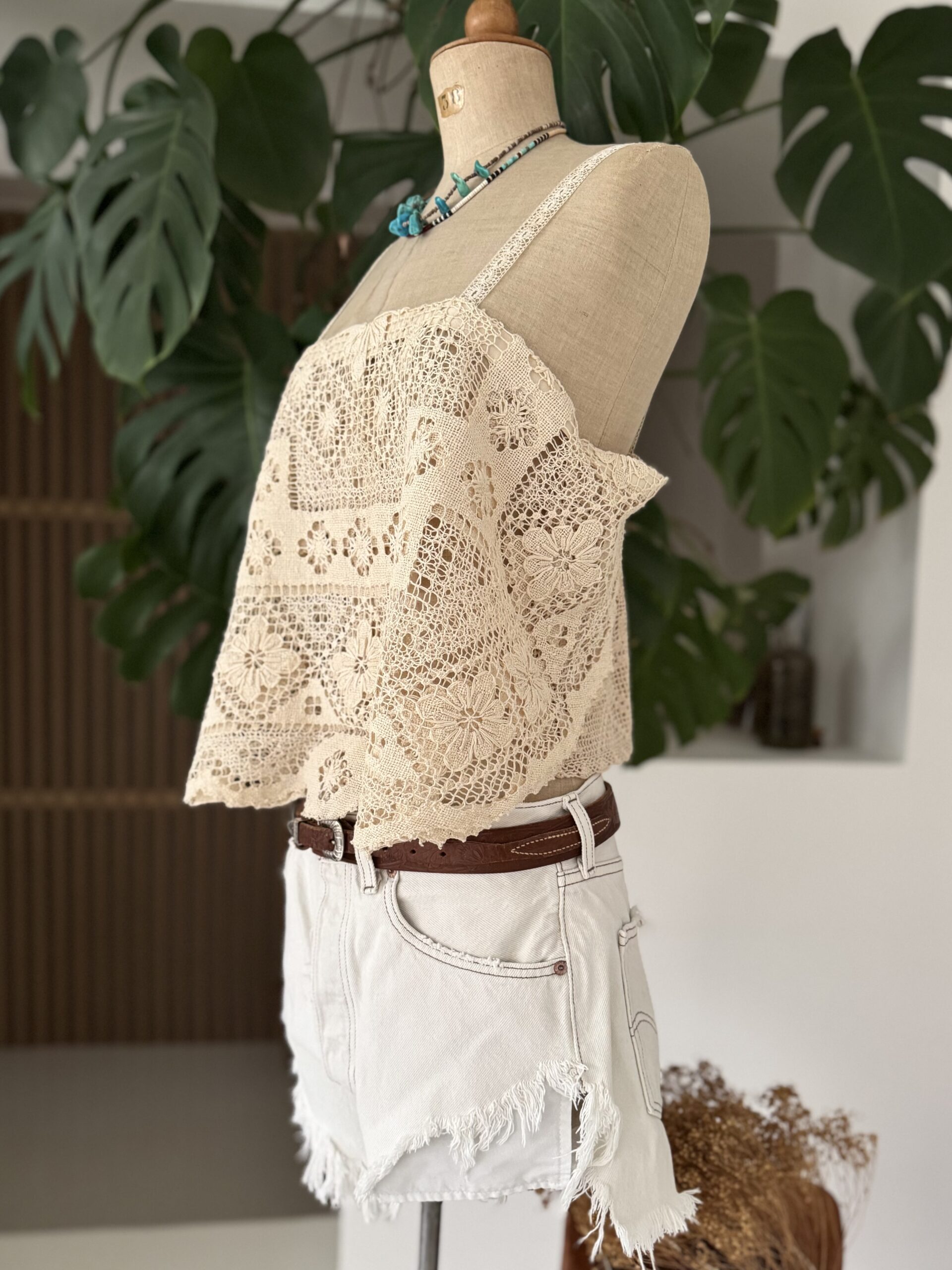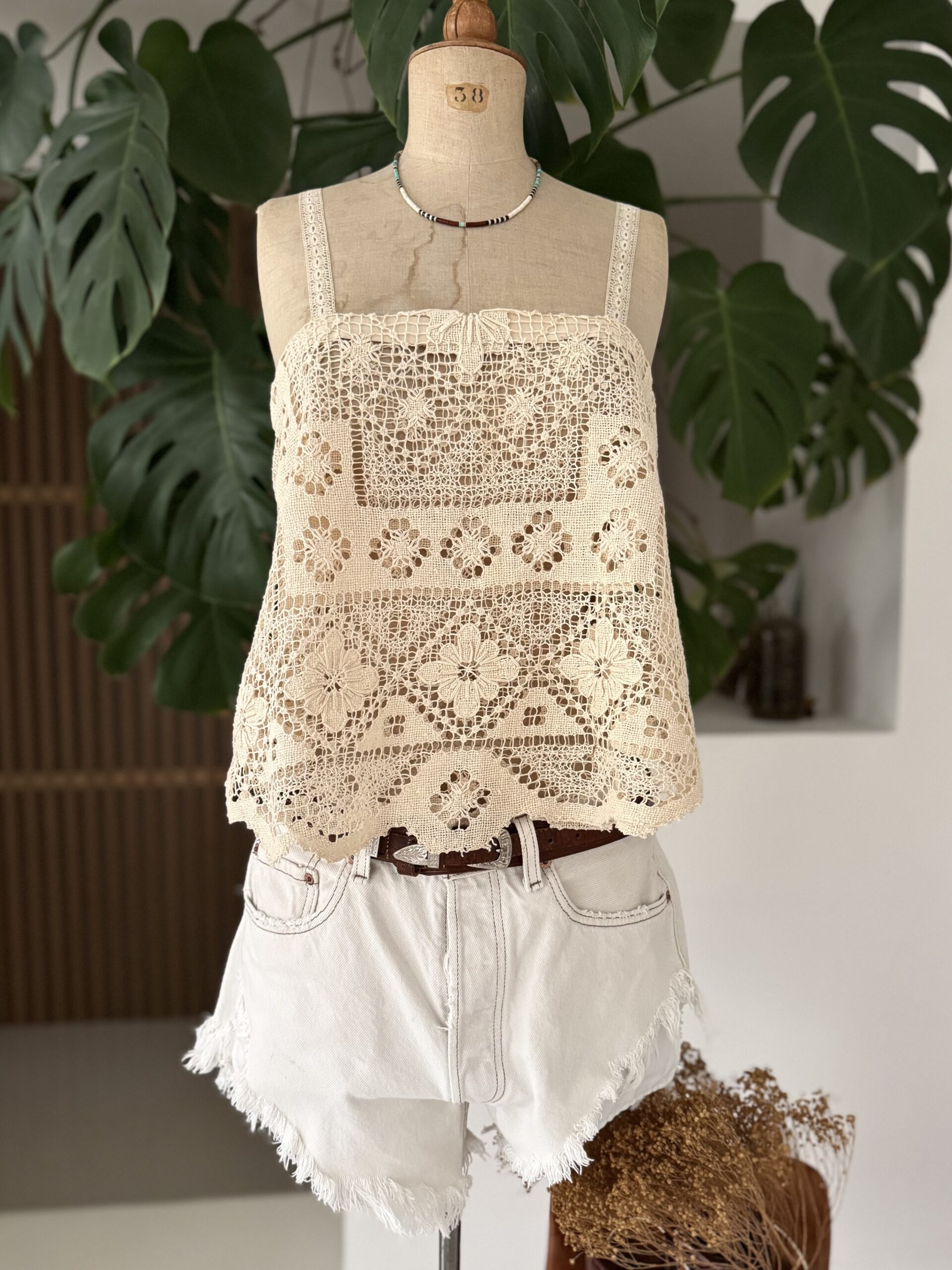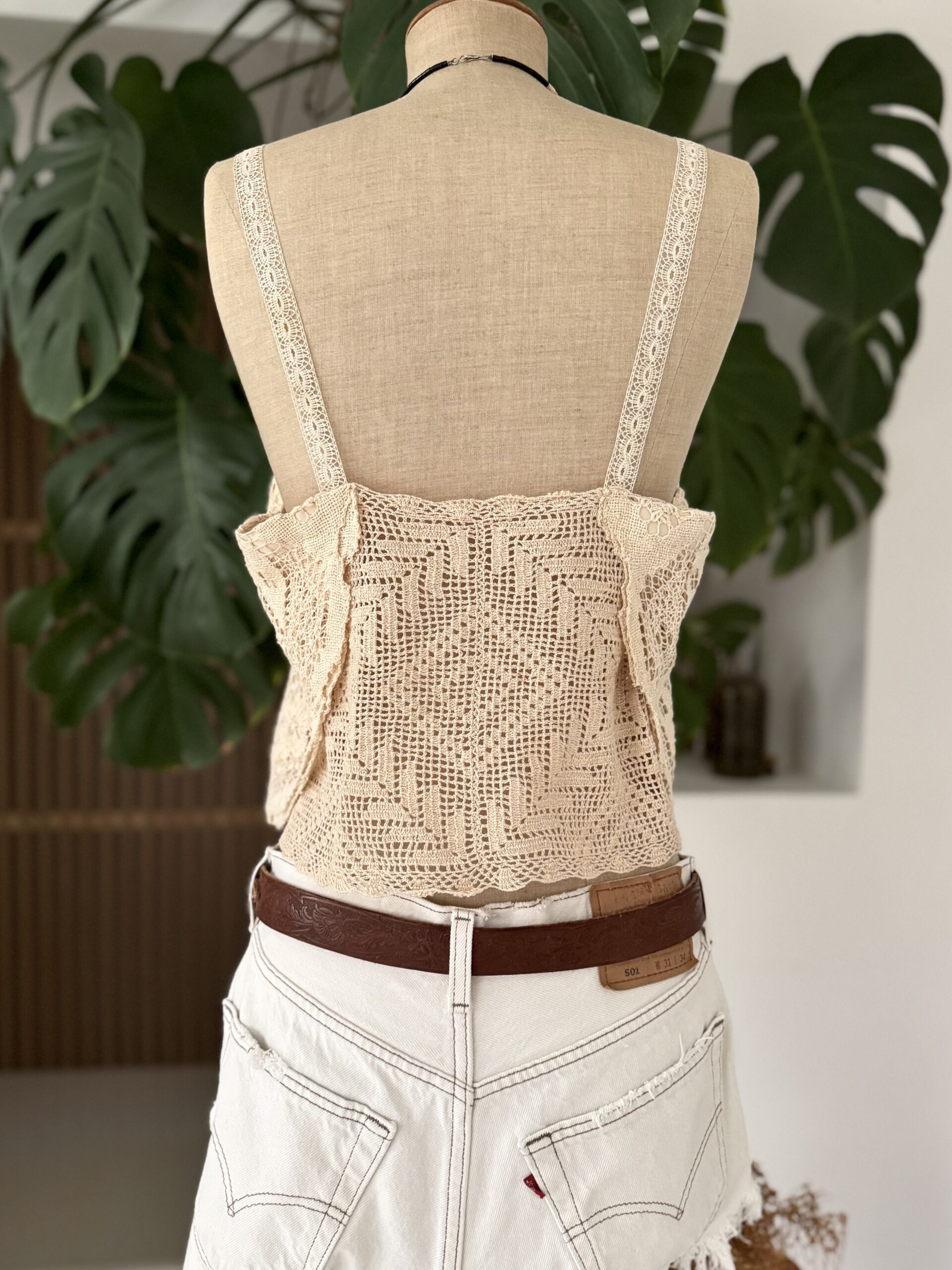 Sublime débardeur vintage cousue main dans de la dentelle écru au filet datant de la fin du 19ème siècle, bretelle en Ruben de dentelle d’époque. Une pièce unique!