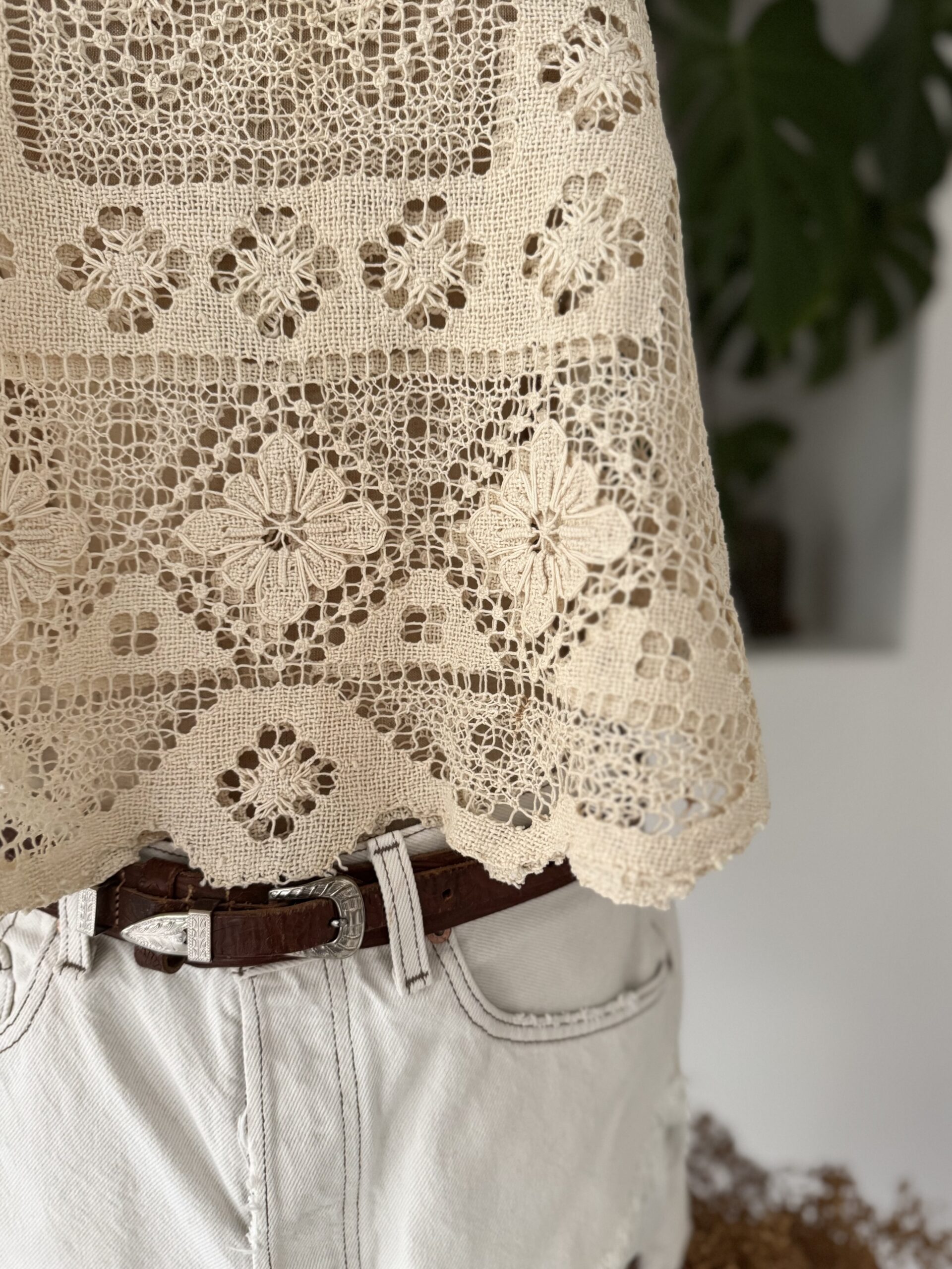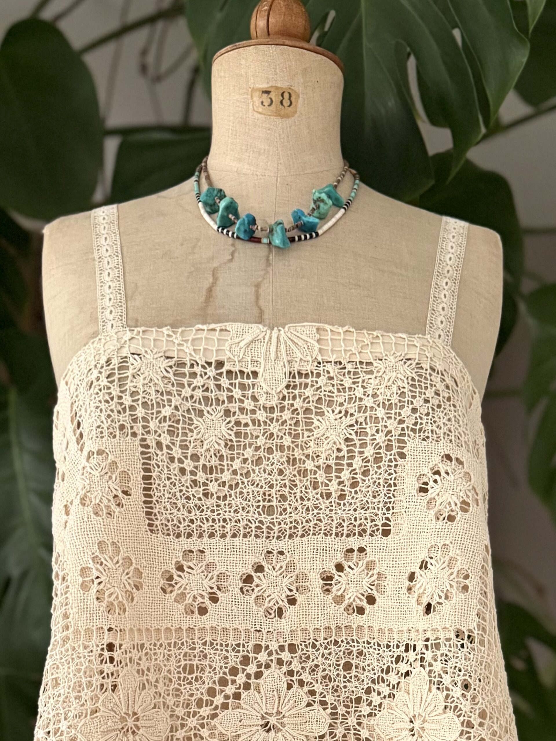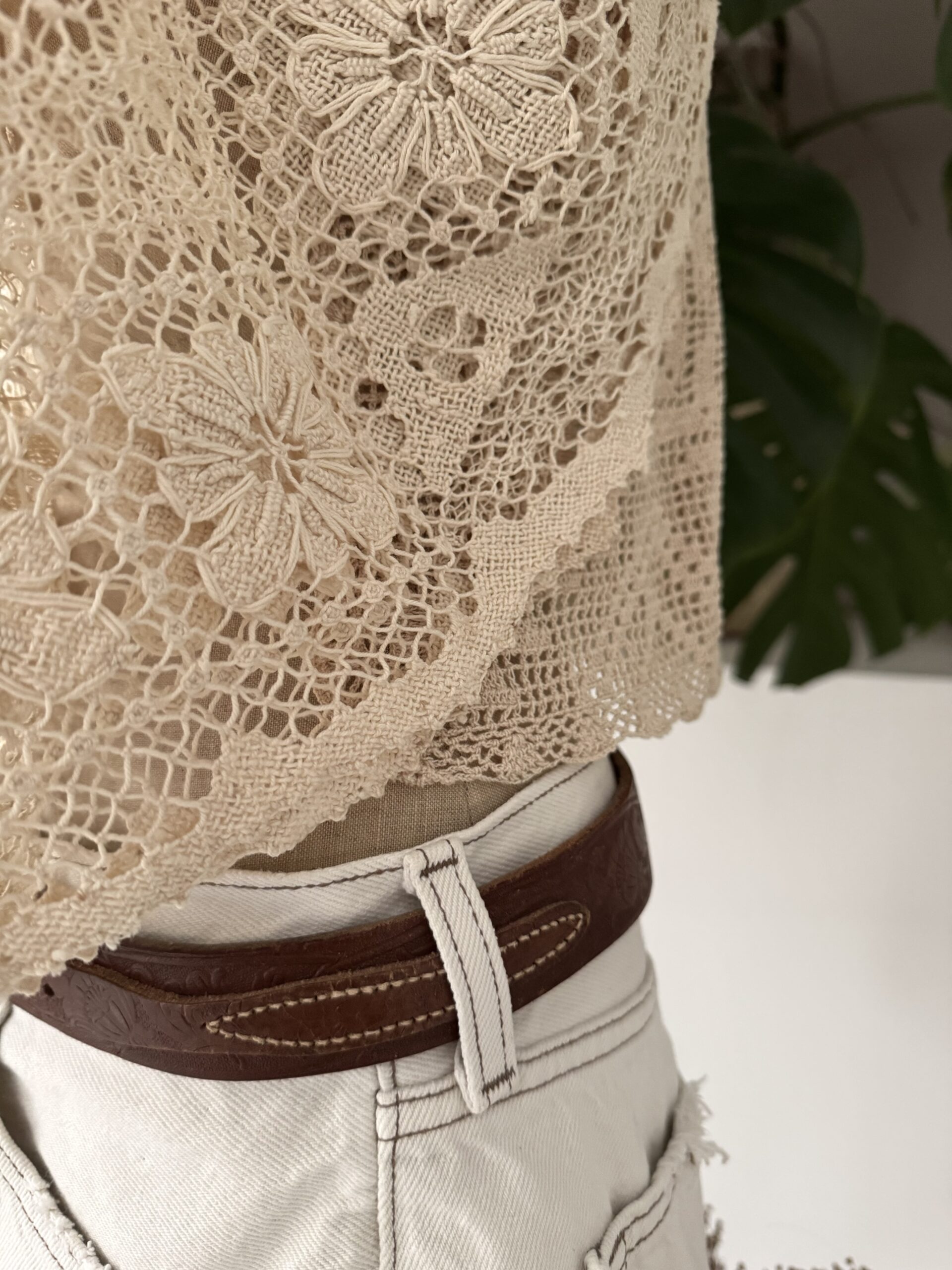 Sublime débardeur vintage cousue main dans de la dentelle écru au filet datant de la fin du 19ème siècle, bretelle en Ruben de dentelle d’époque. Une pièce unique!