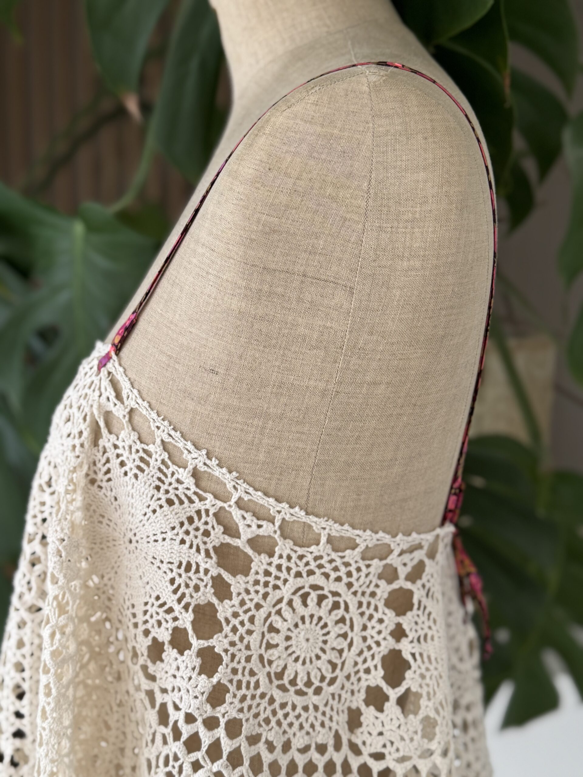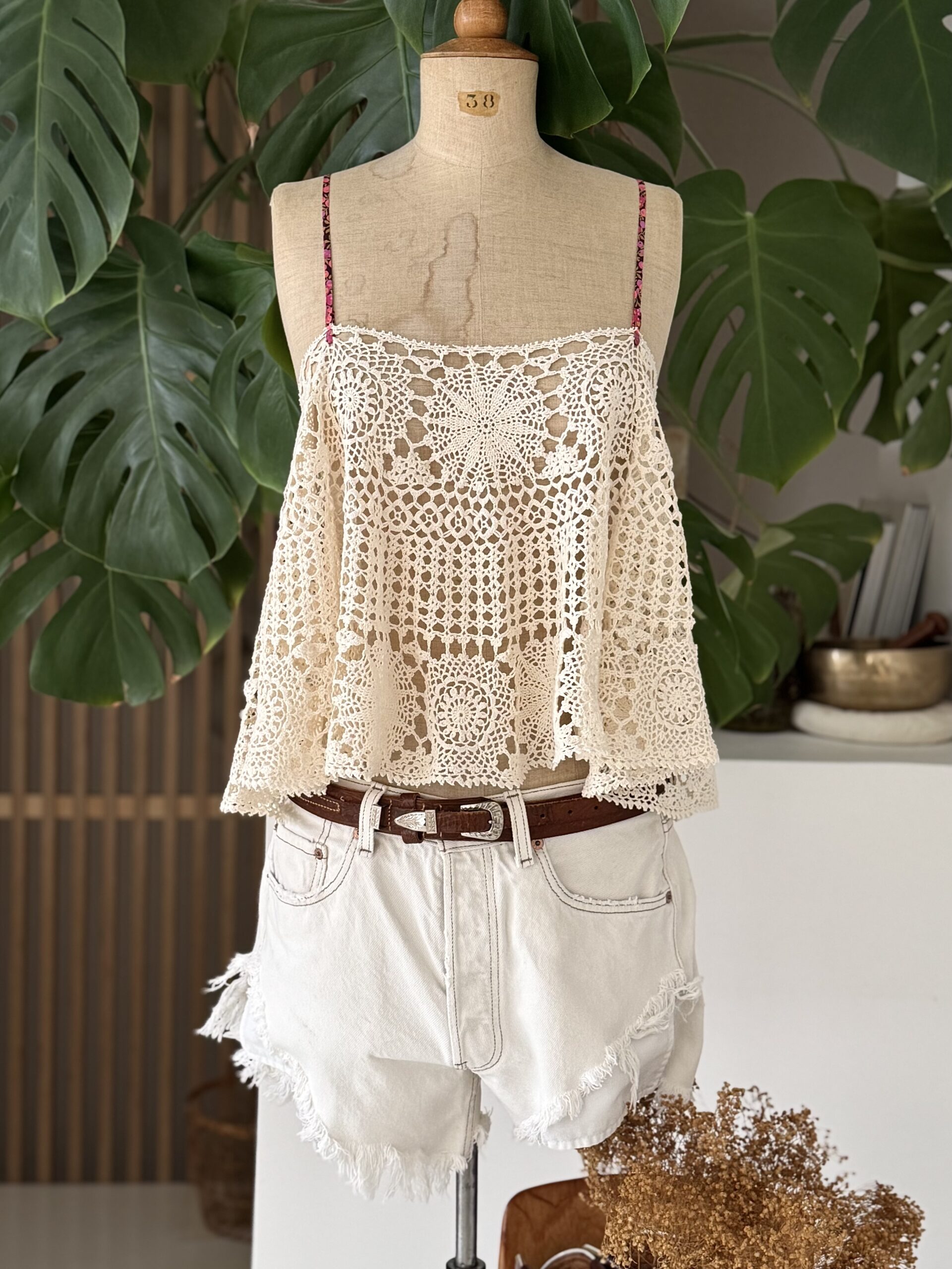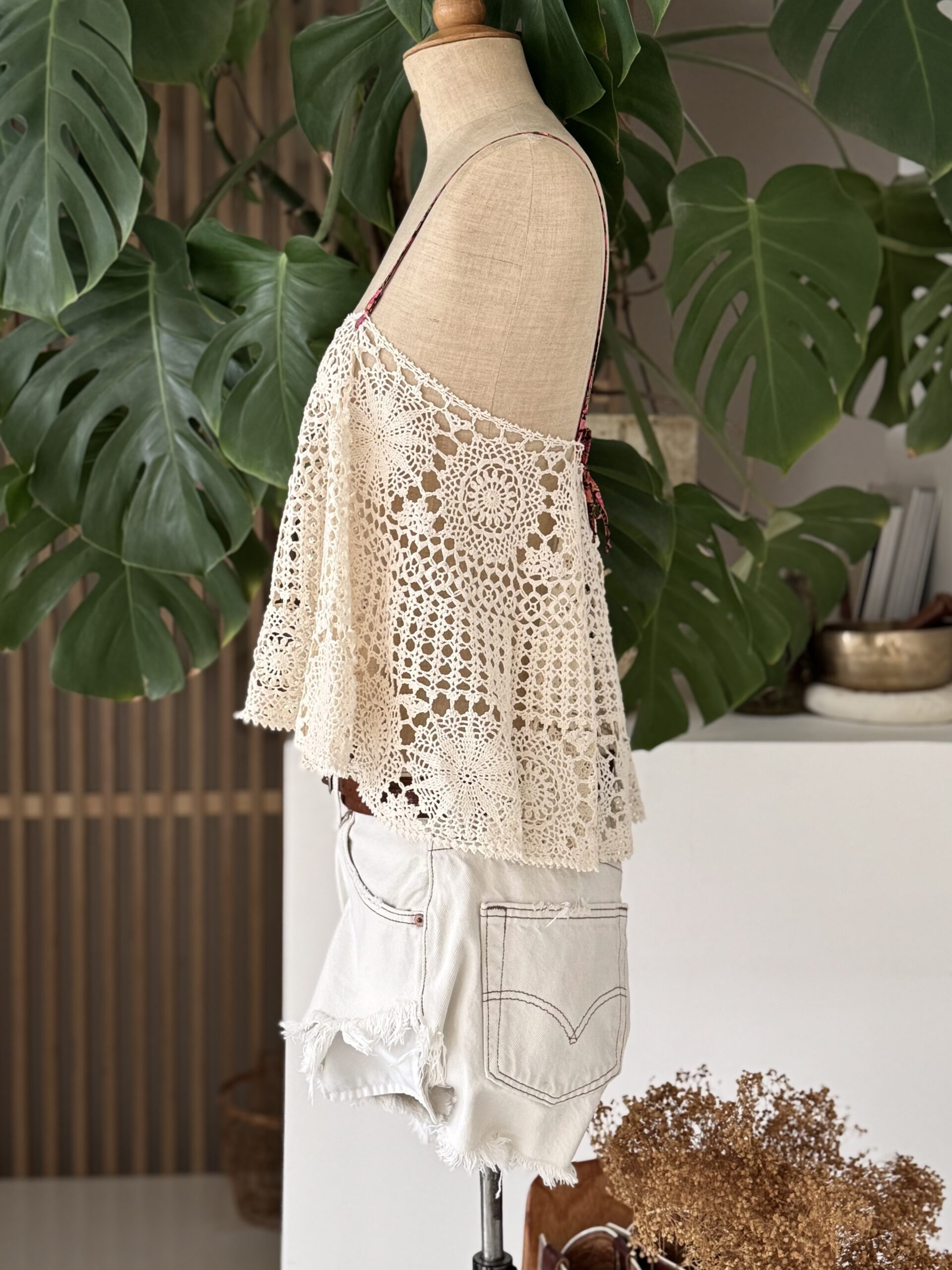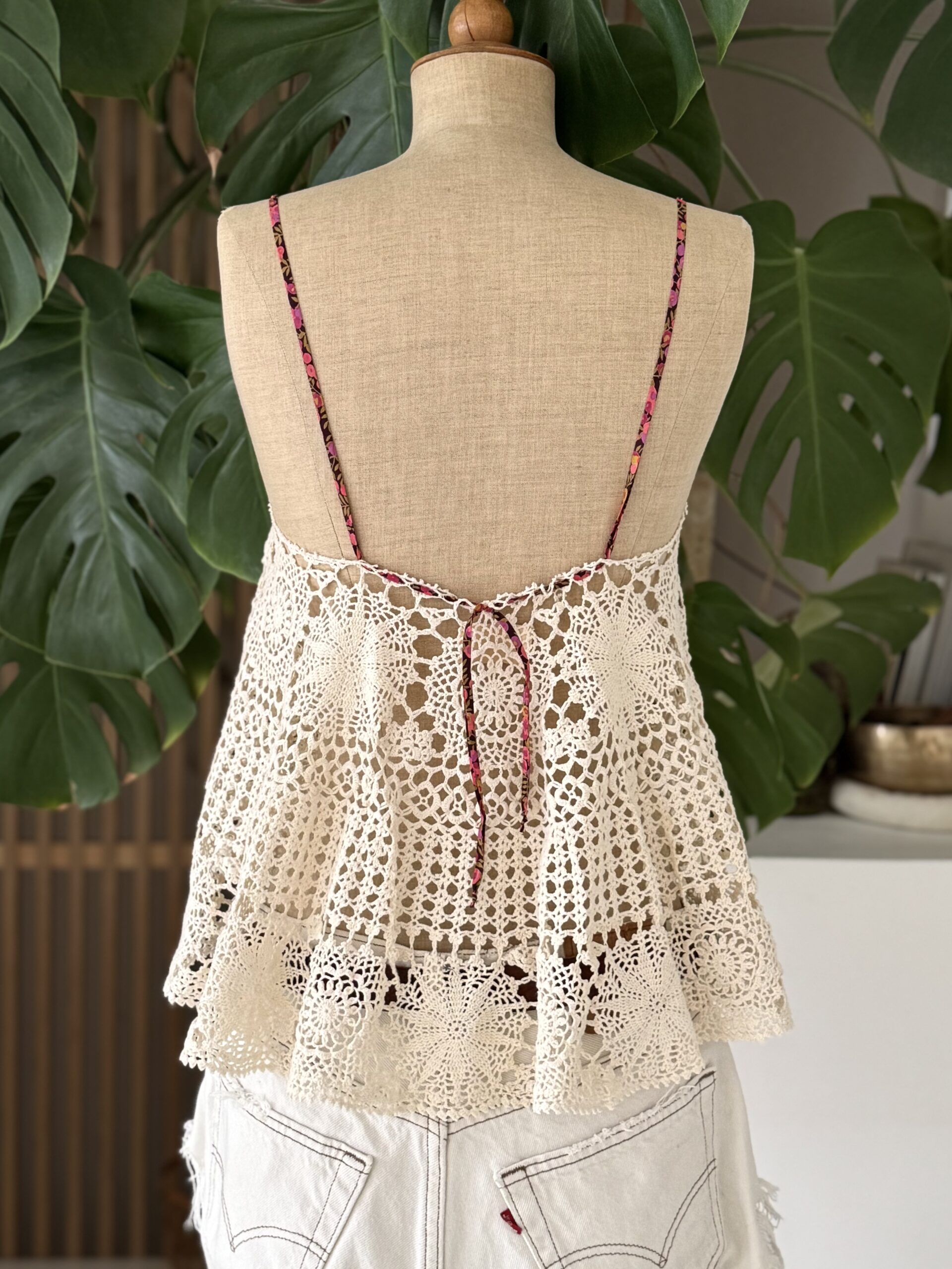 Débardeur vintage en crochet antique coloris beige, bretelles en ruban de Liberty. Une pièce unique!