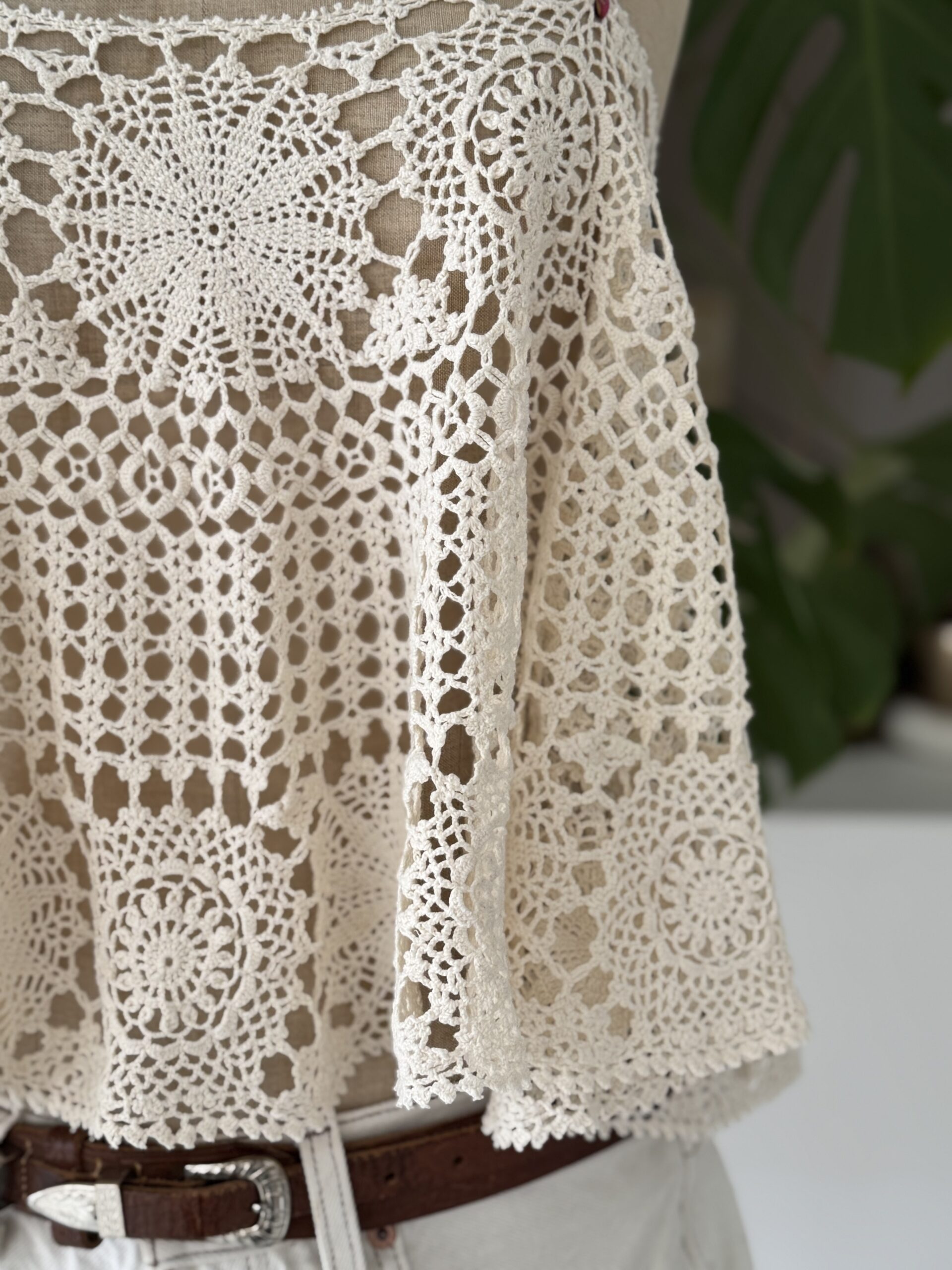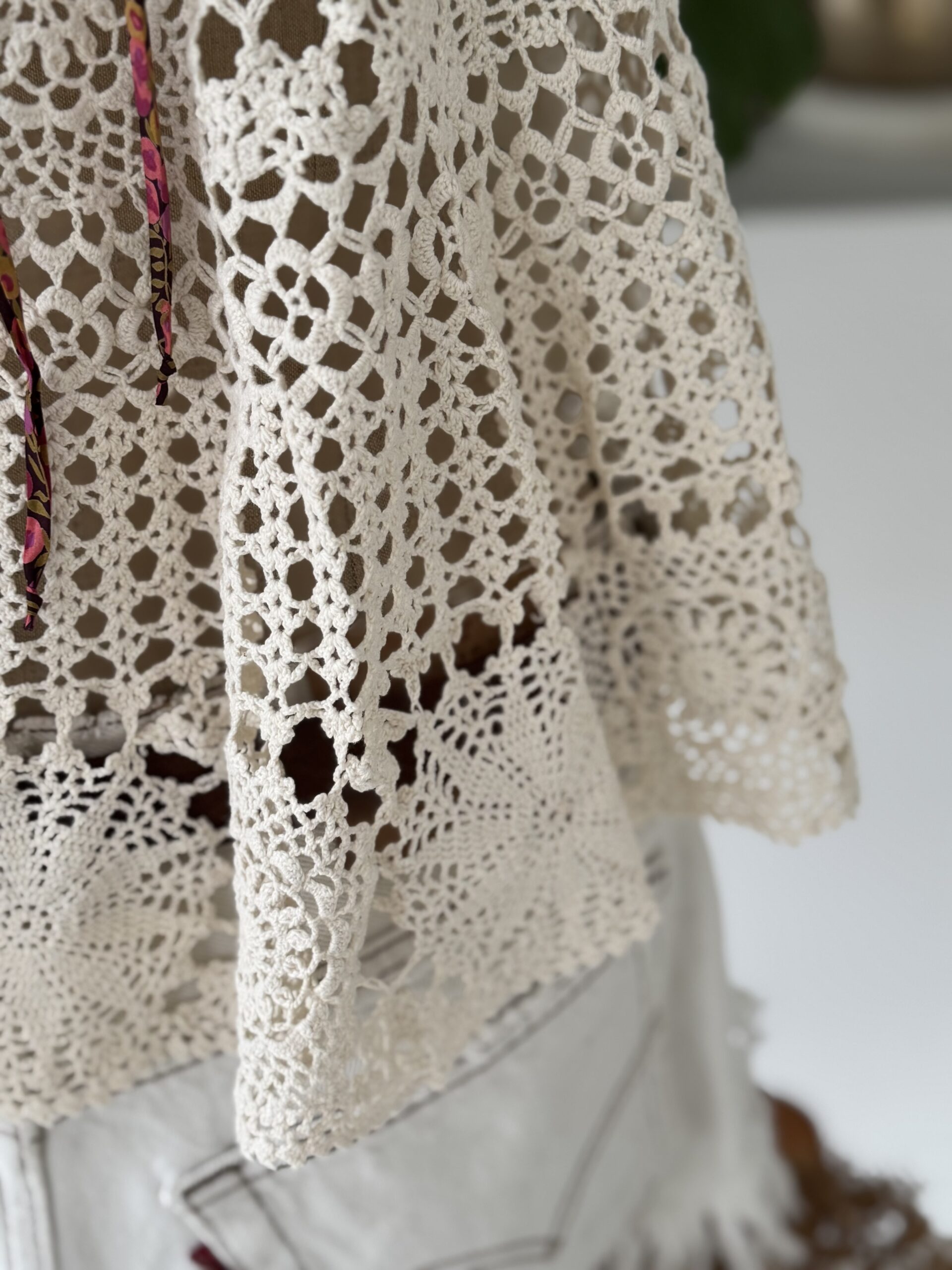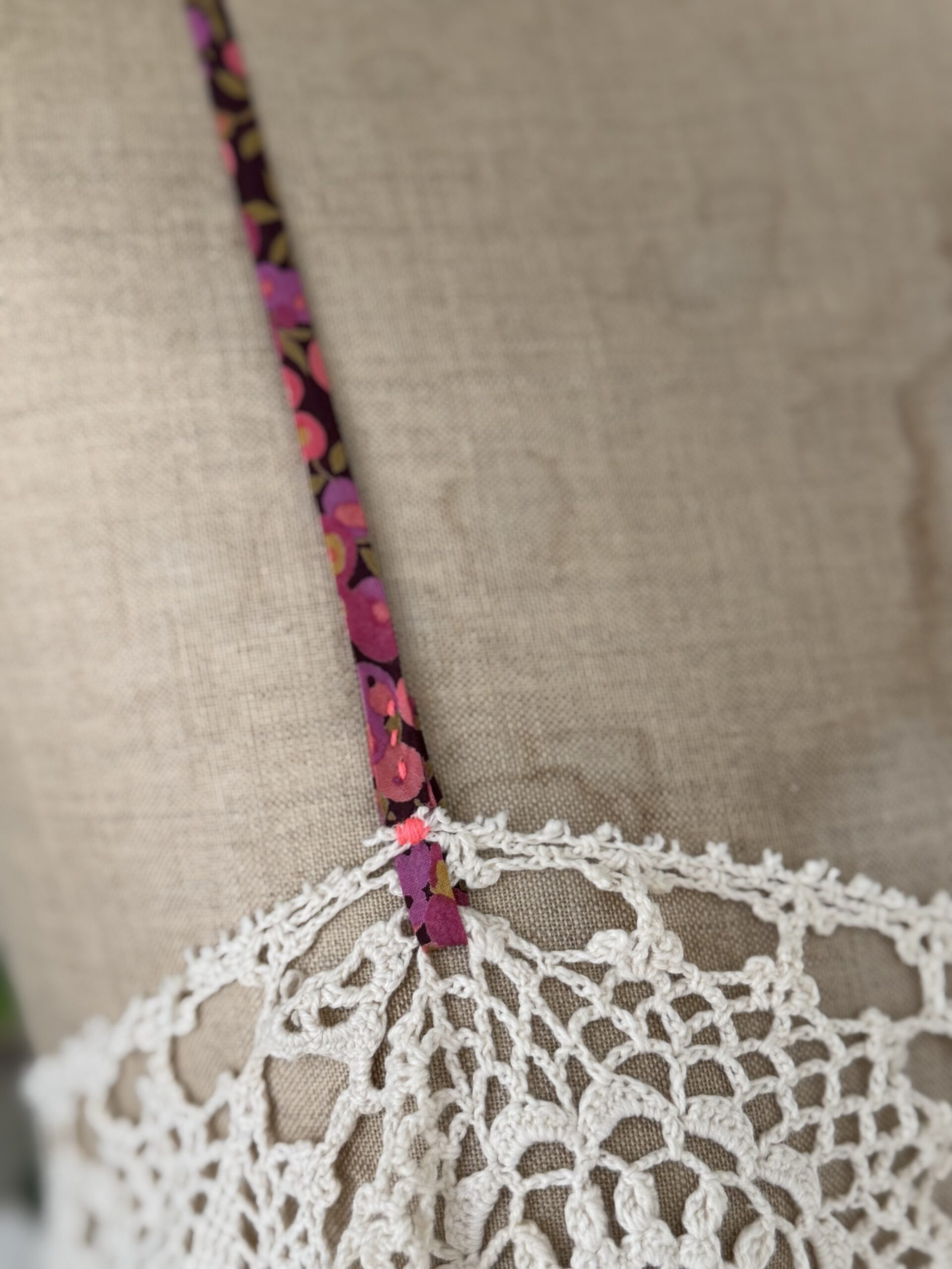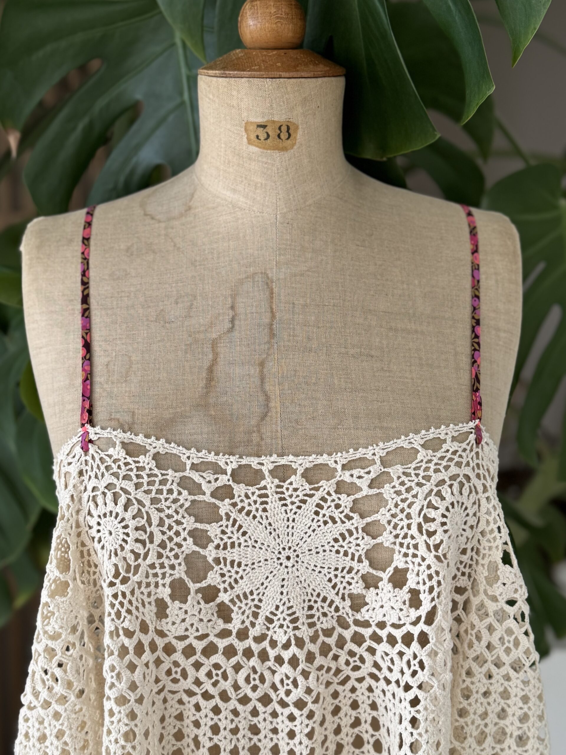 Débardeur vintage en crochet antique coloris beige, bretelles en ruban de Liberty. Une pièce unique!