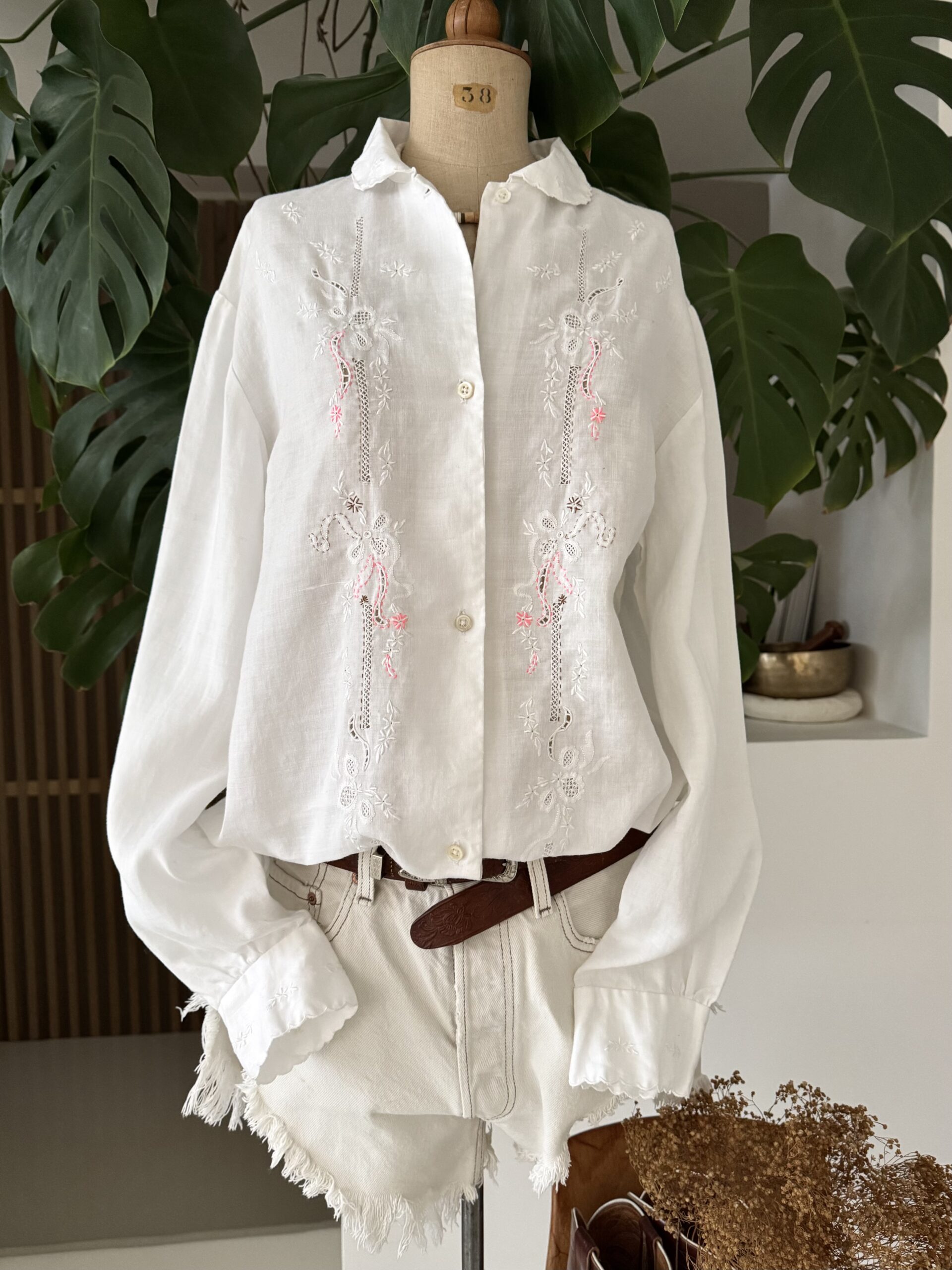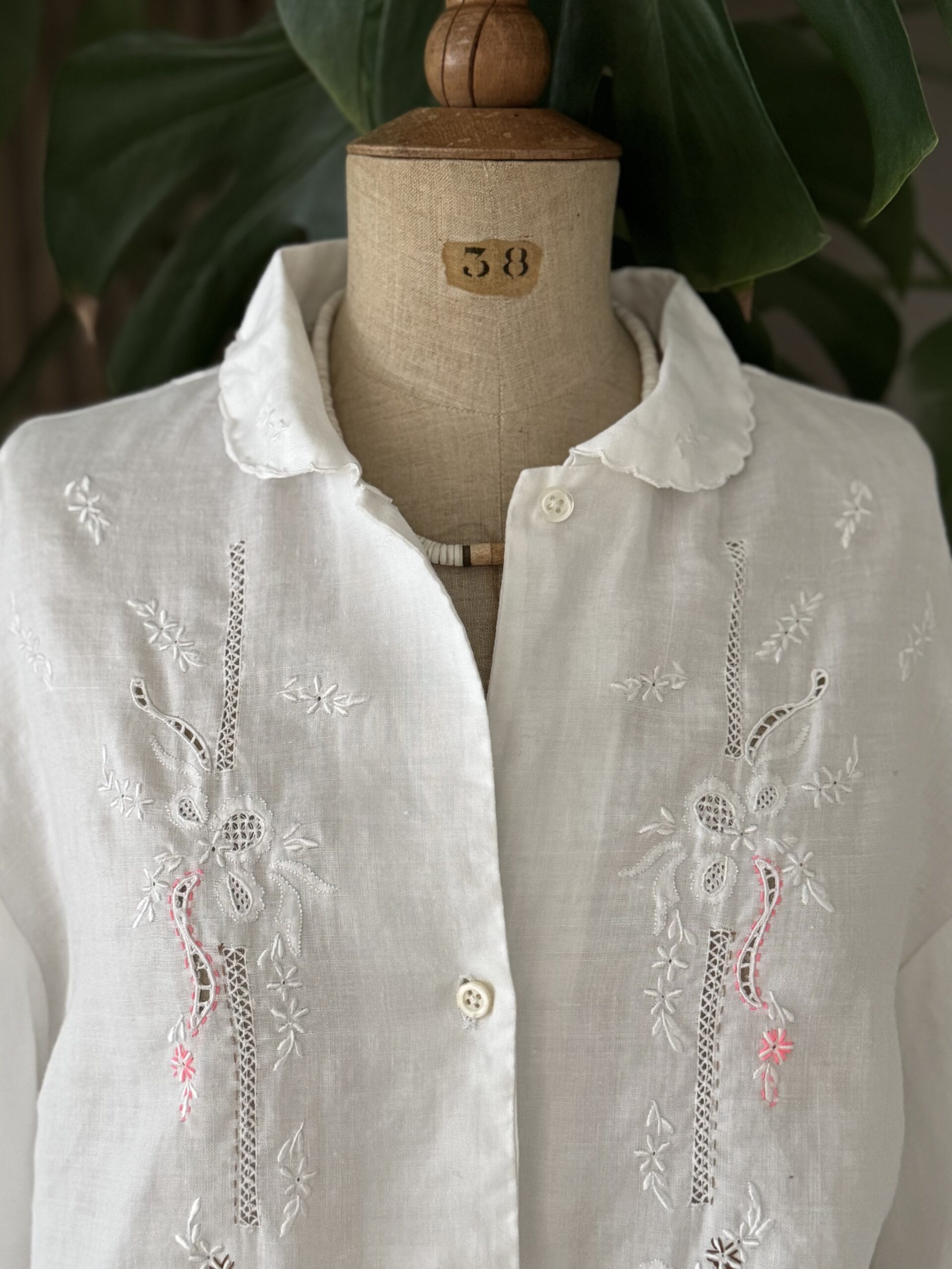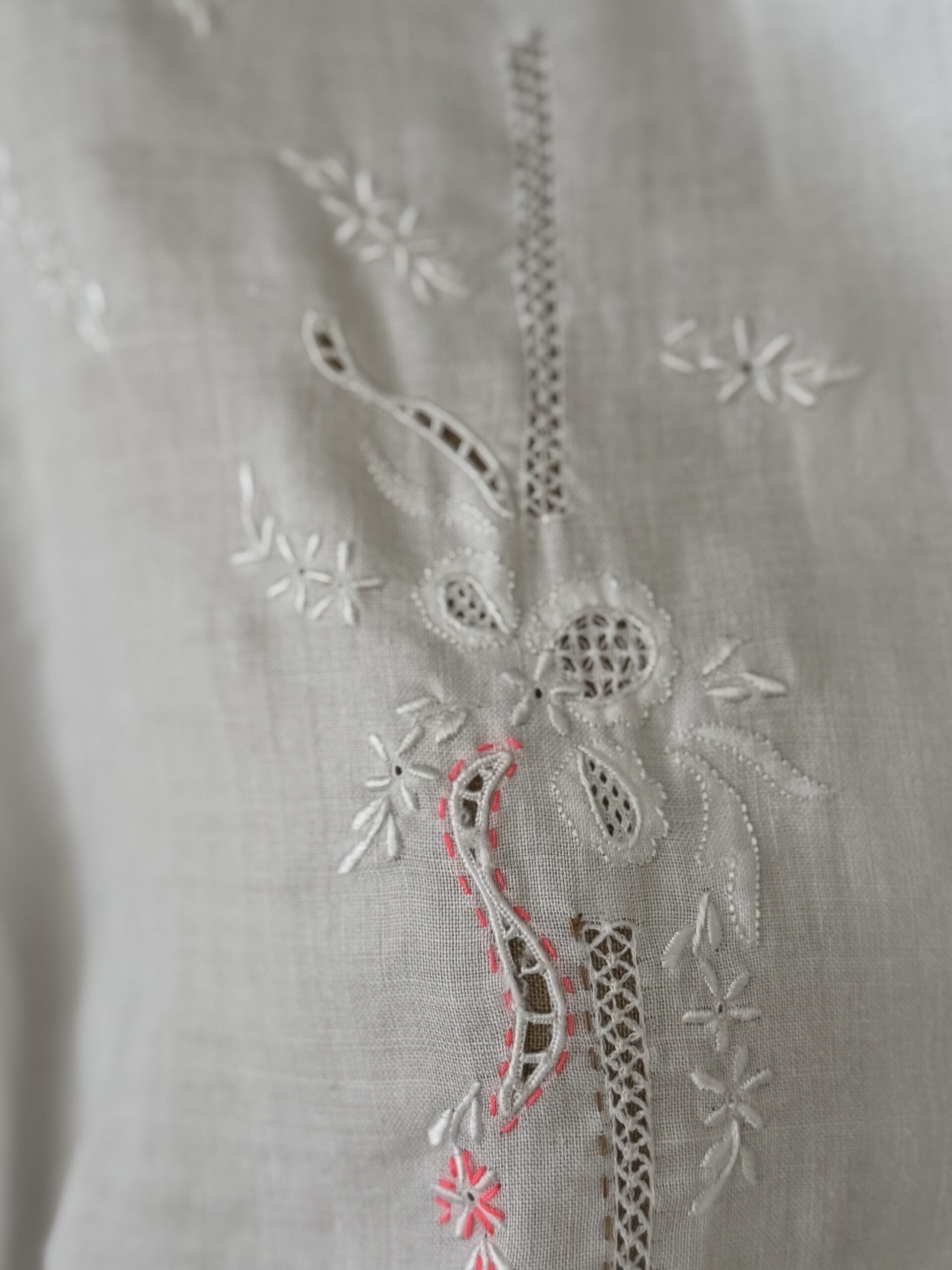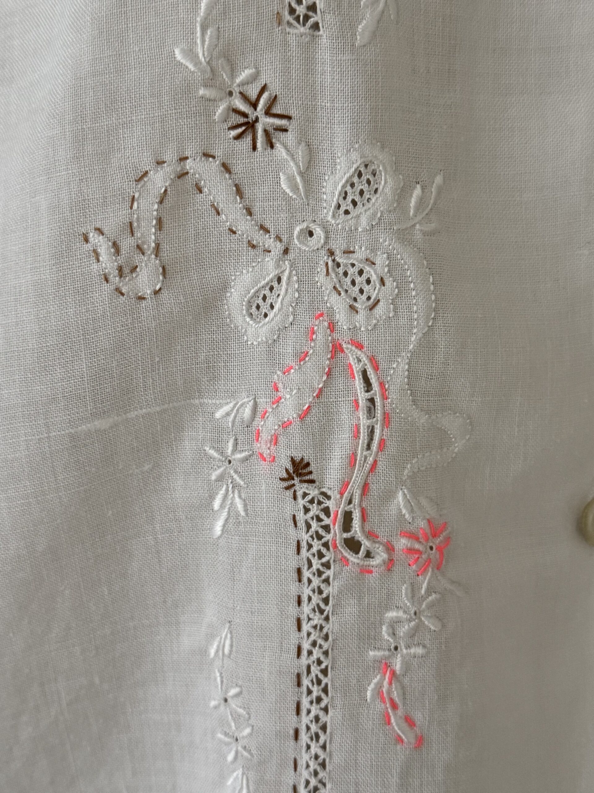 Blouse upcyclée en lin datant du 20ème siècle, broderies d’époque avec points selliers colorés.