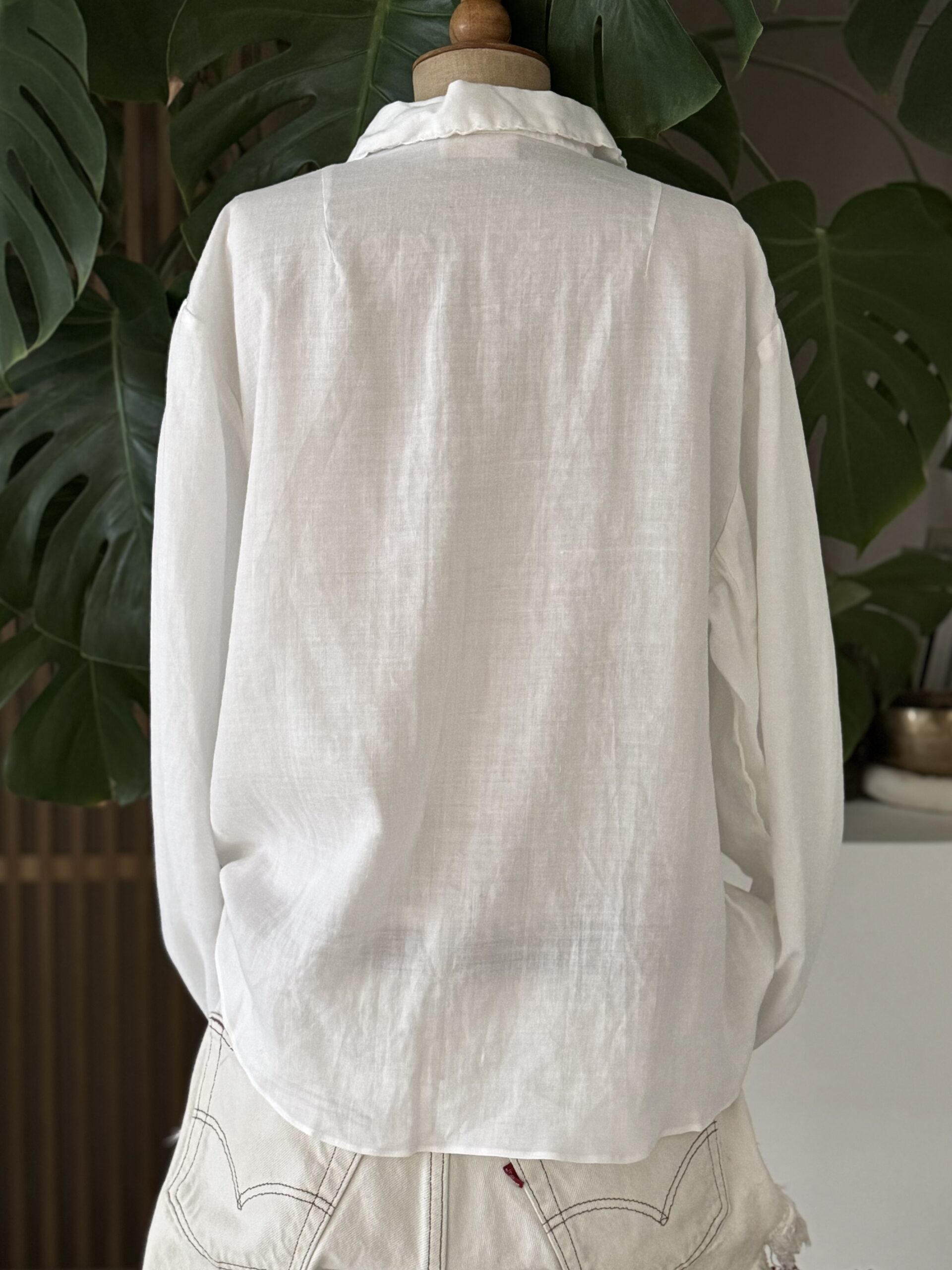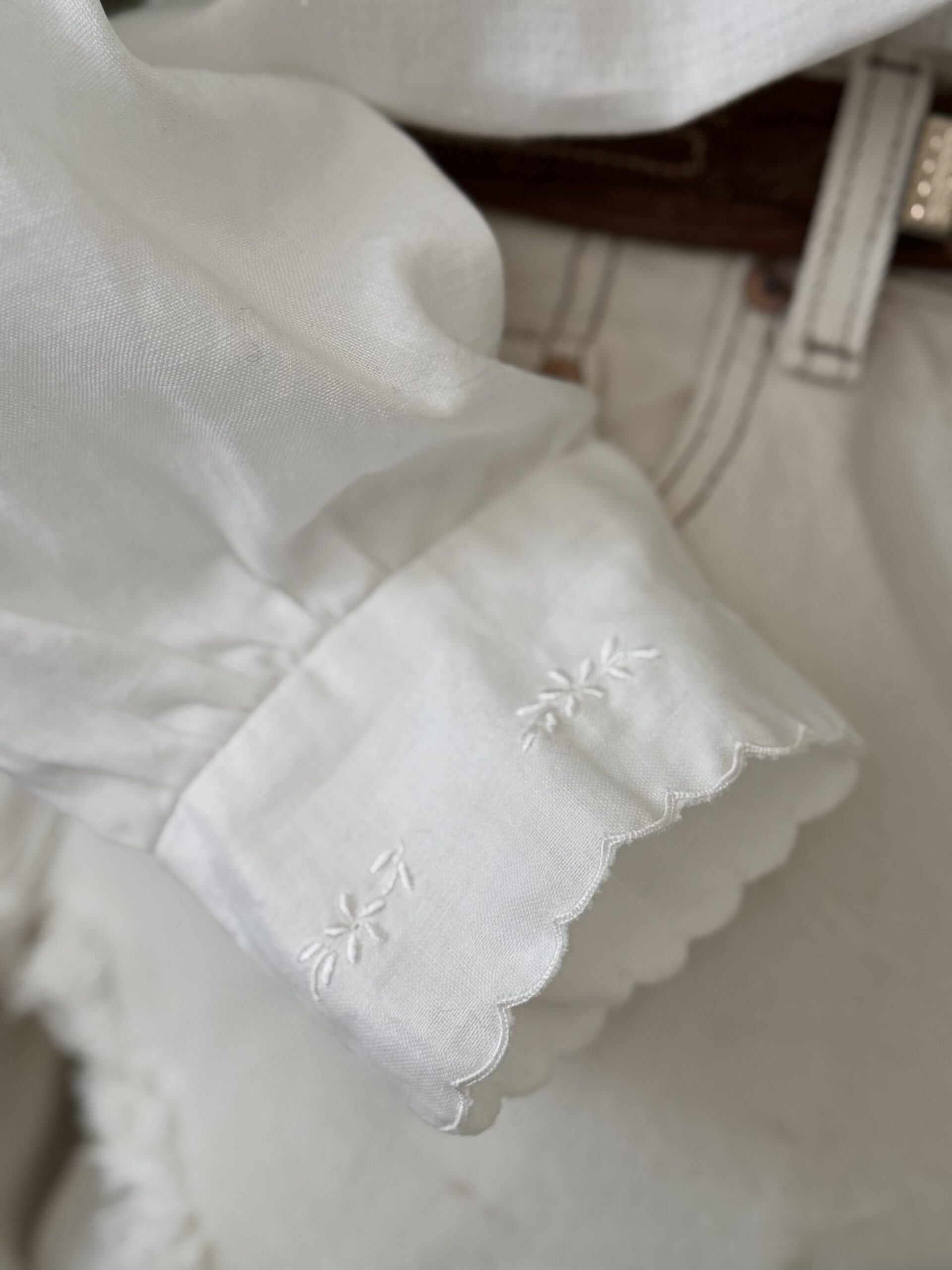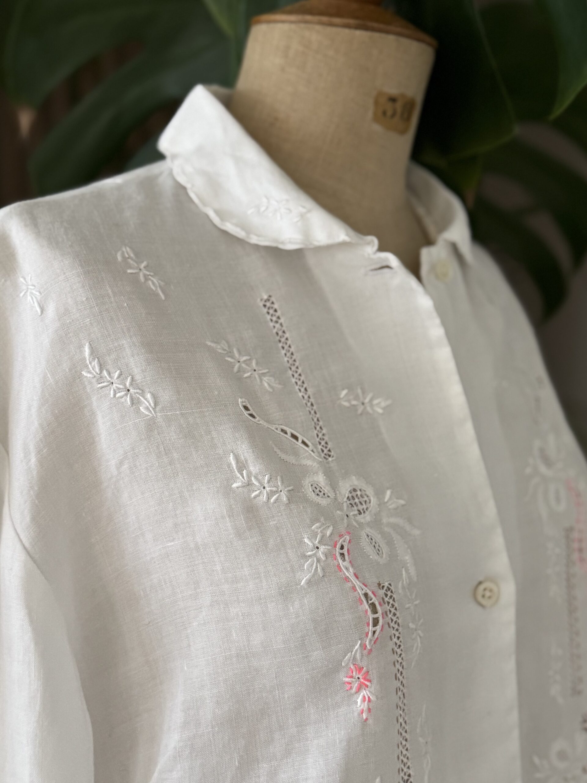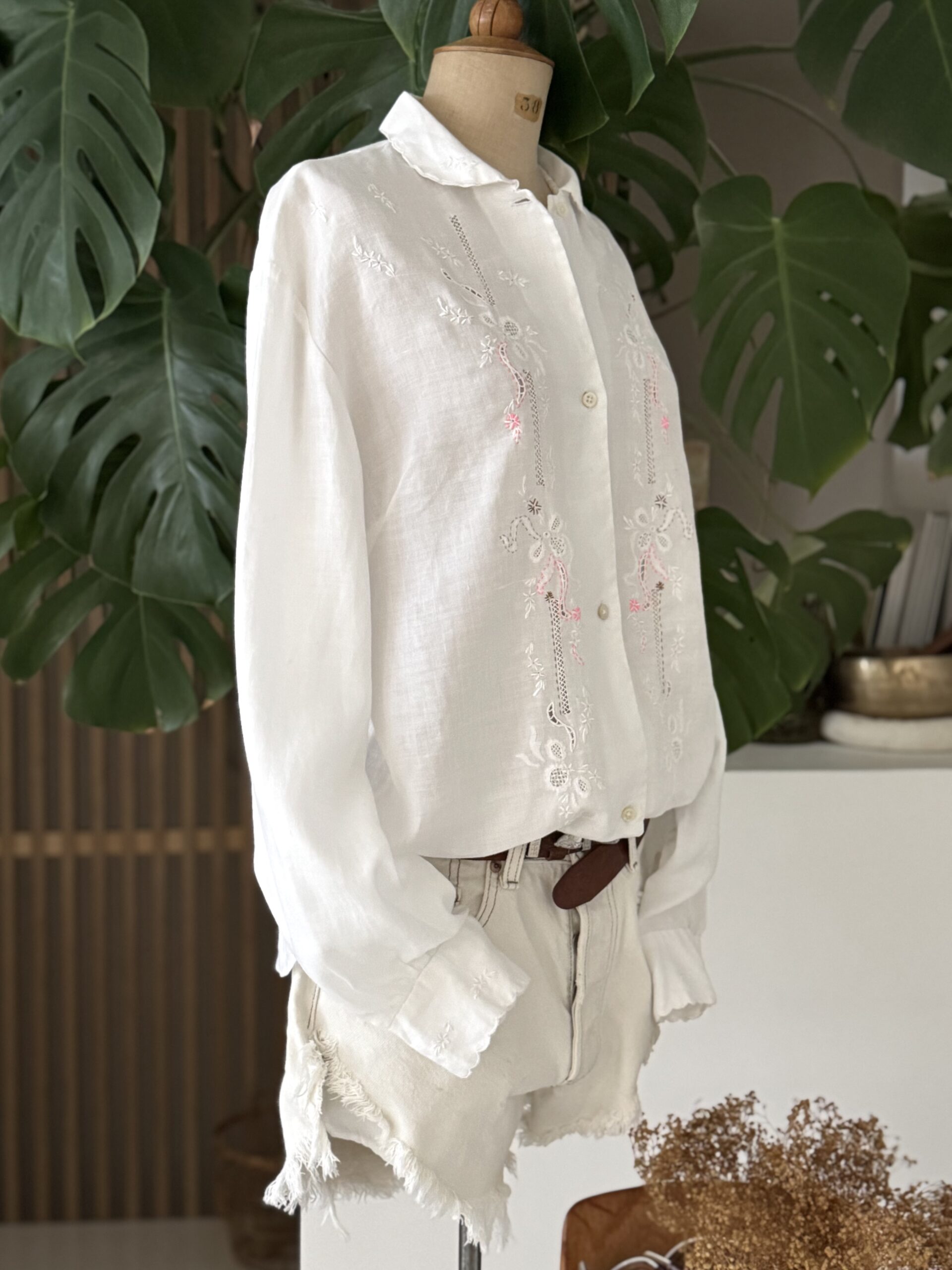 Blouse upcyclée en lin datant du 20ème siècle, broderies d’époque avec points selliers colorés.