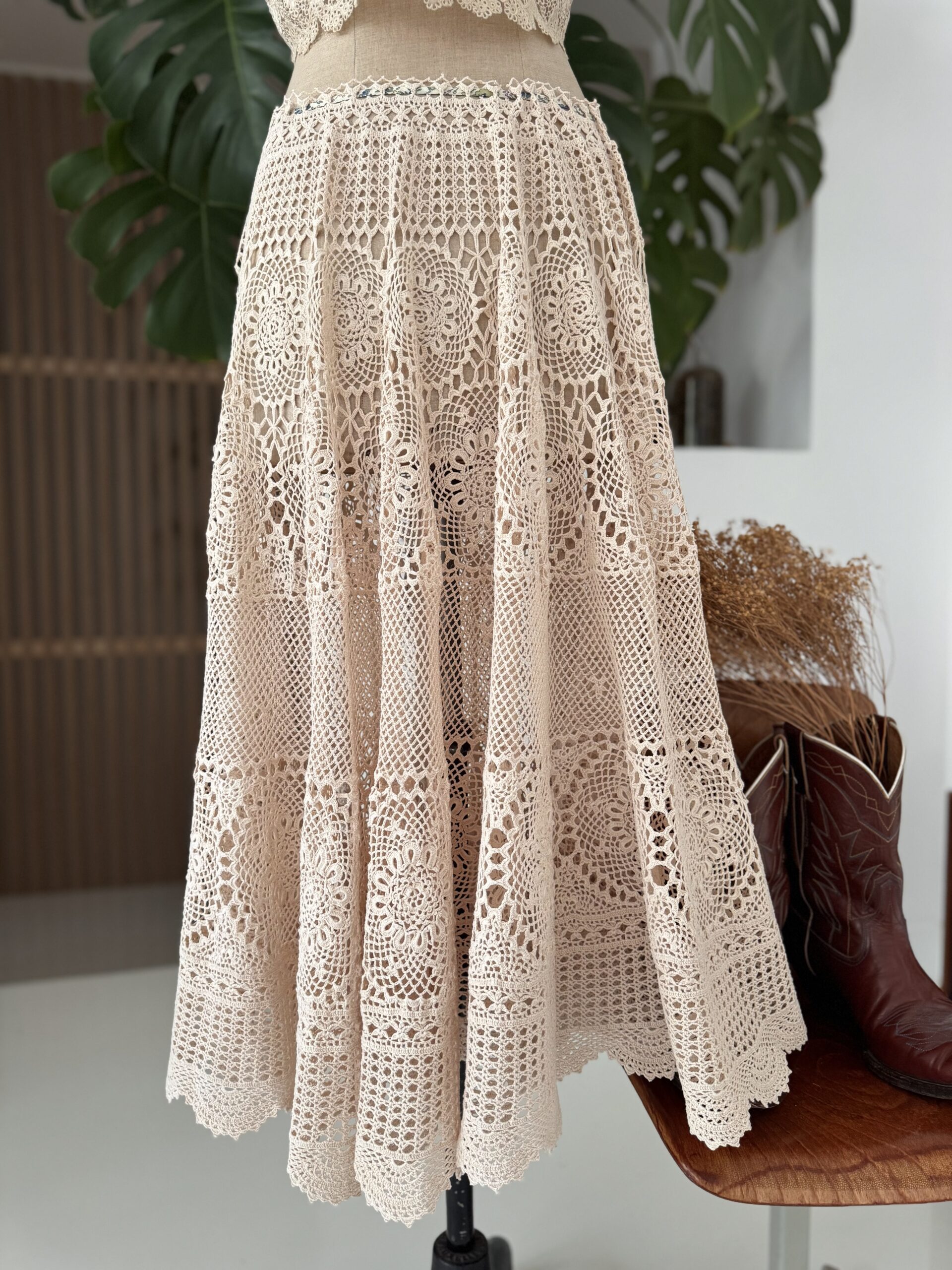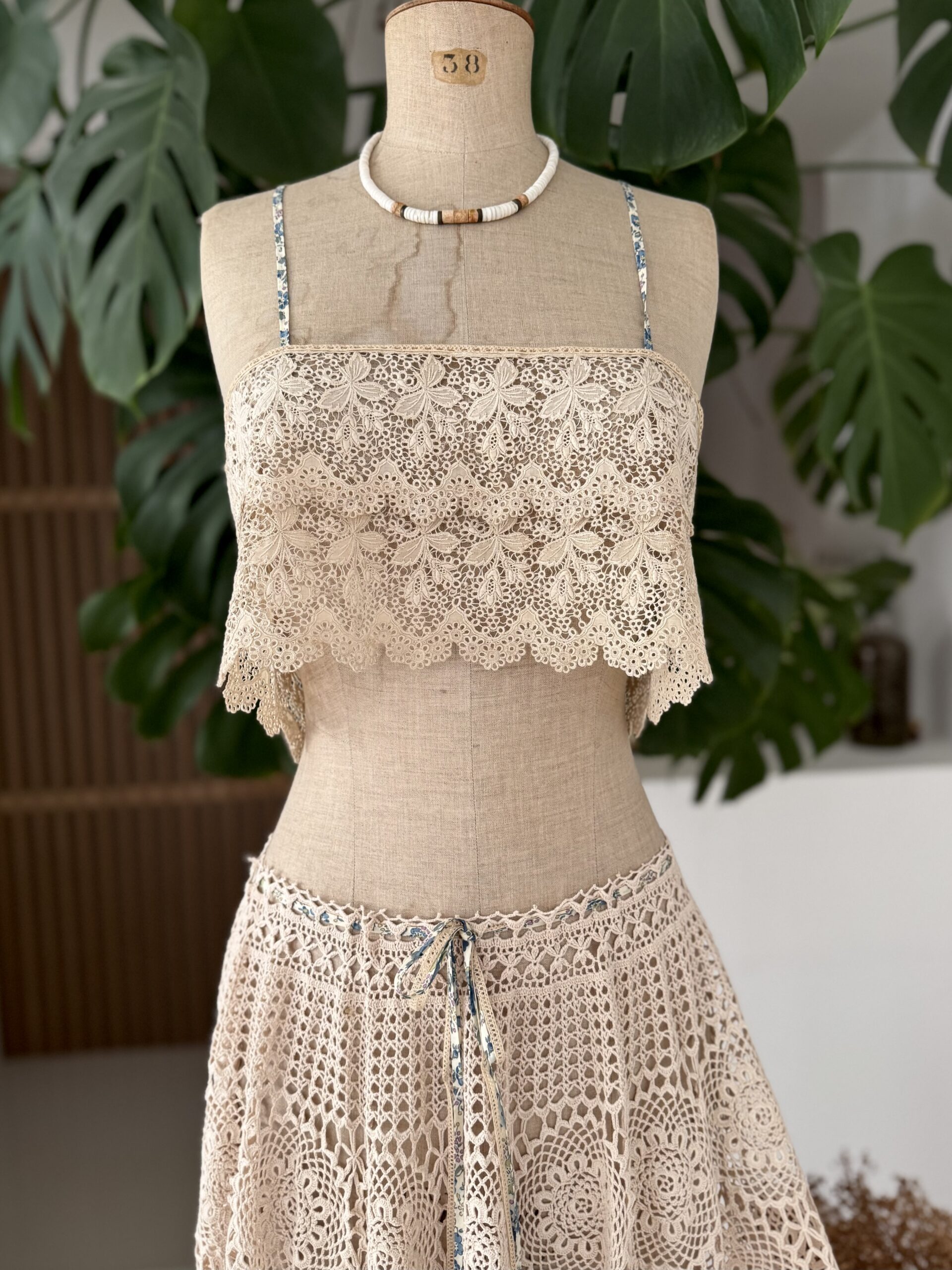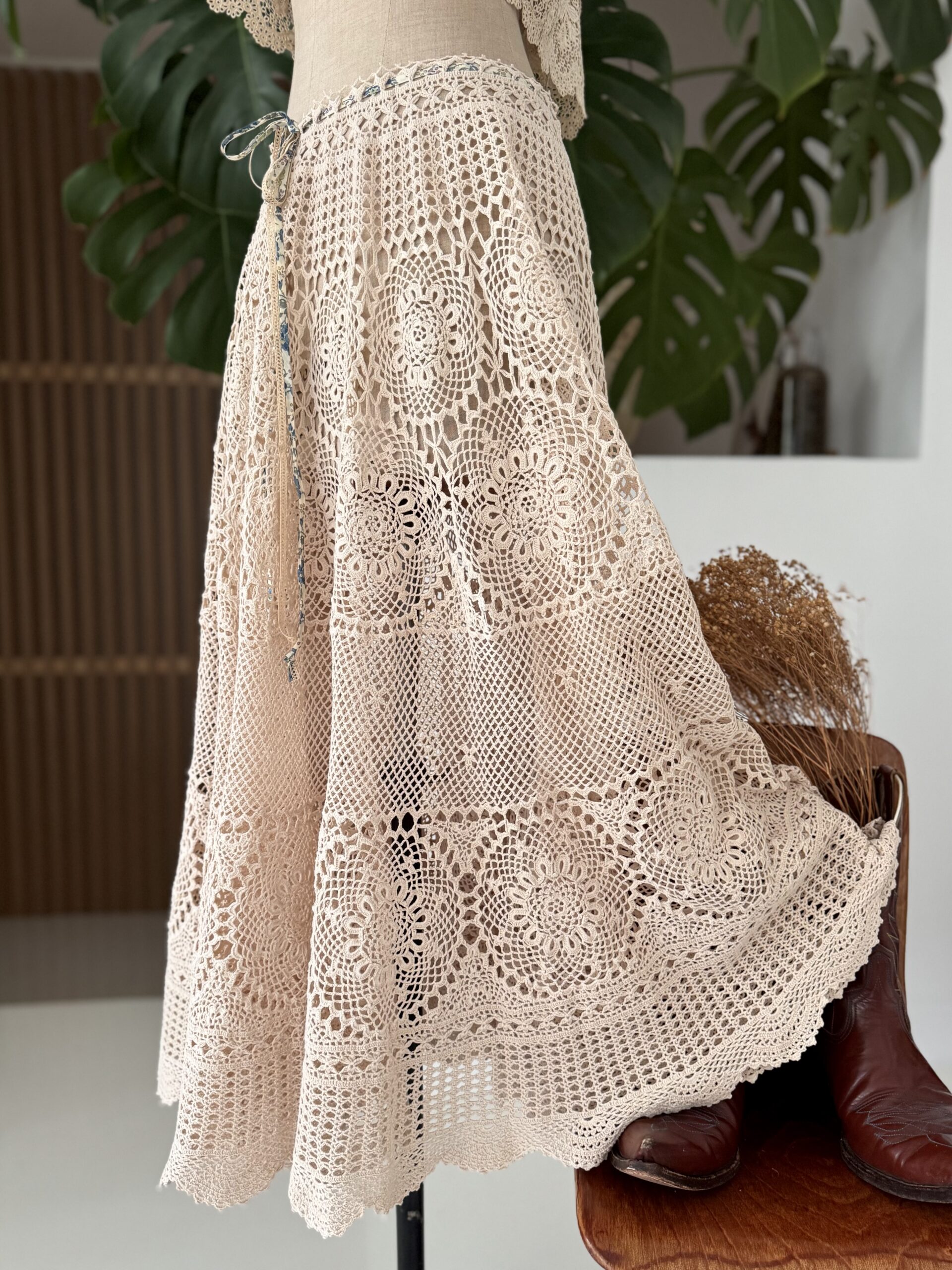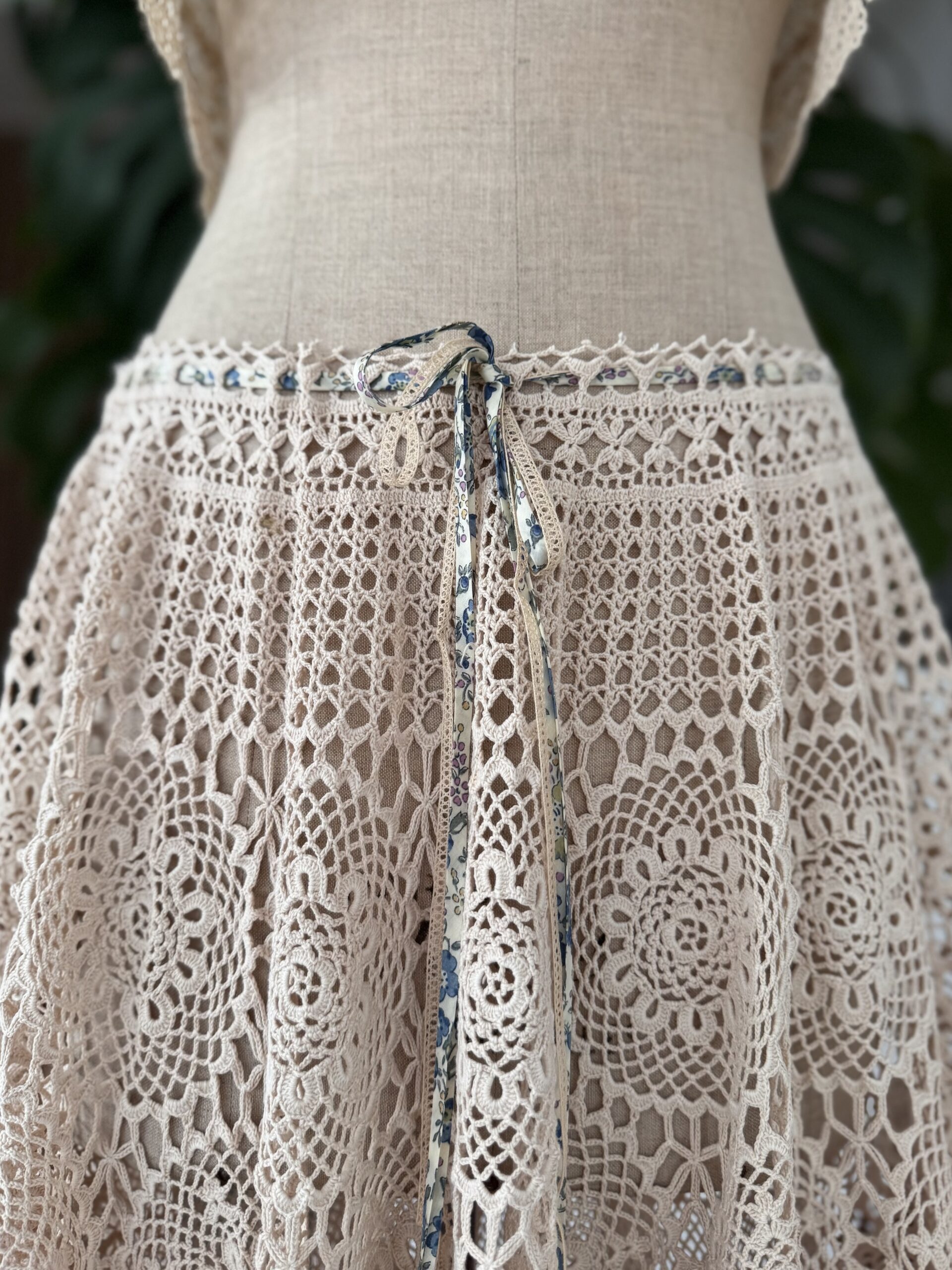 Jupon vintage monté dans de la dentelle au crochet écru datant de la fin du 20ème siècle, lien coulissant à la taille en ruban de dentelle et bais plat Liberty . Une pièce unique!