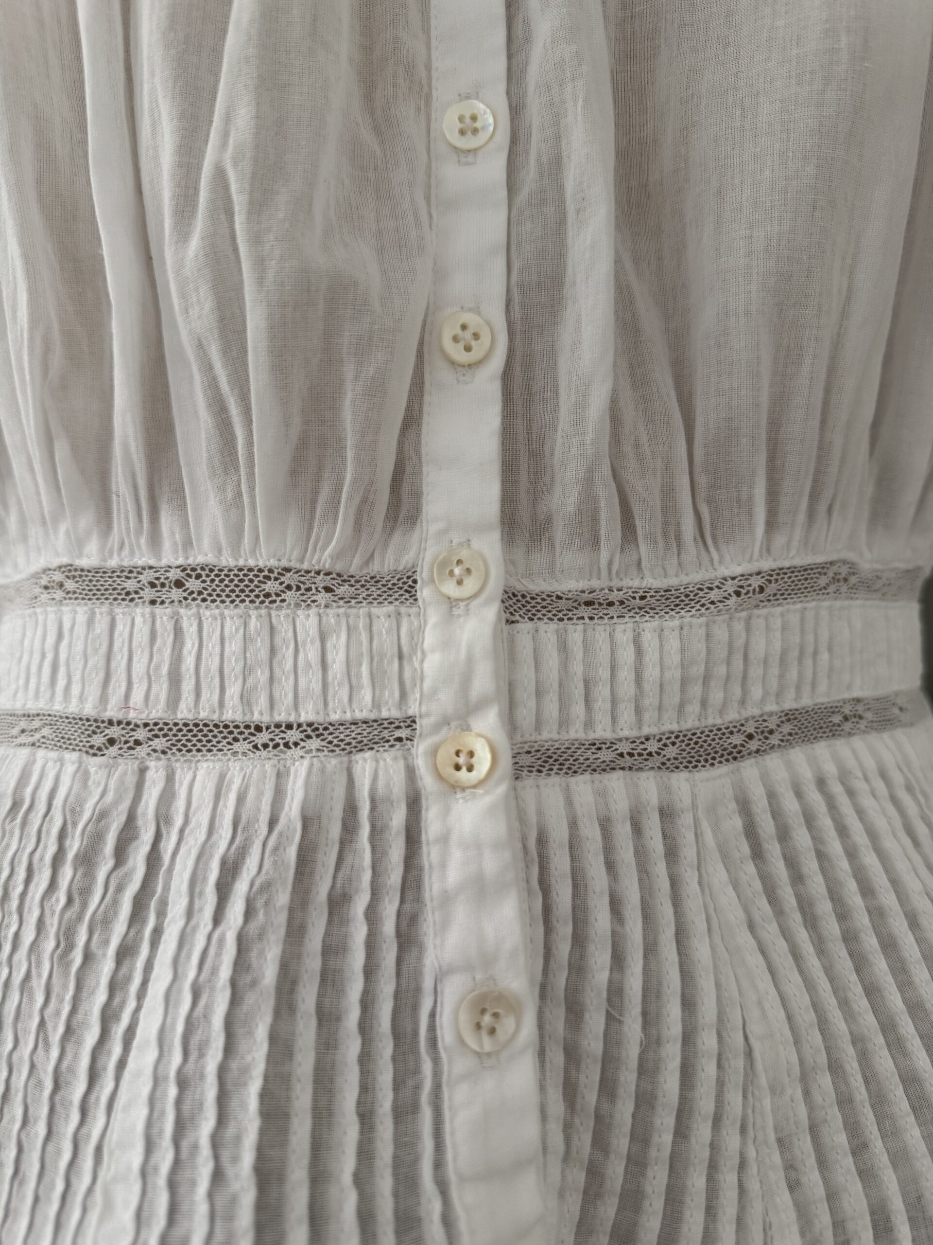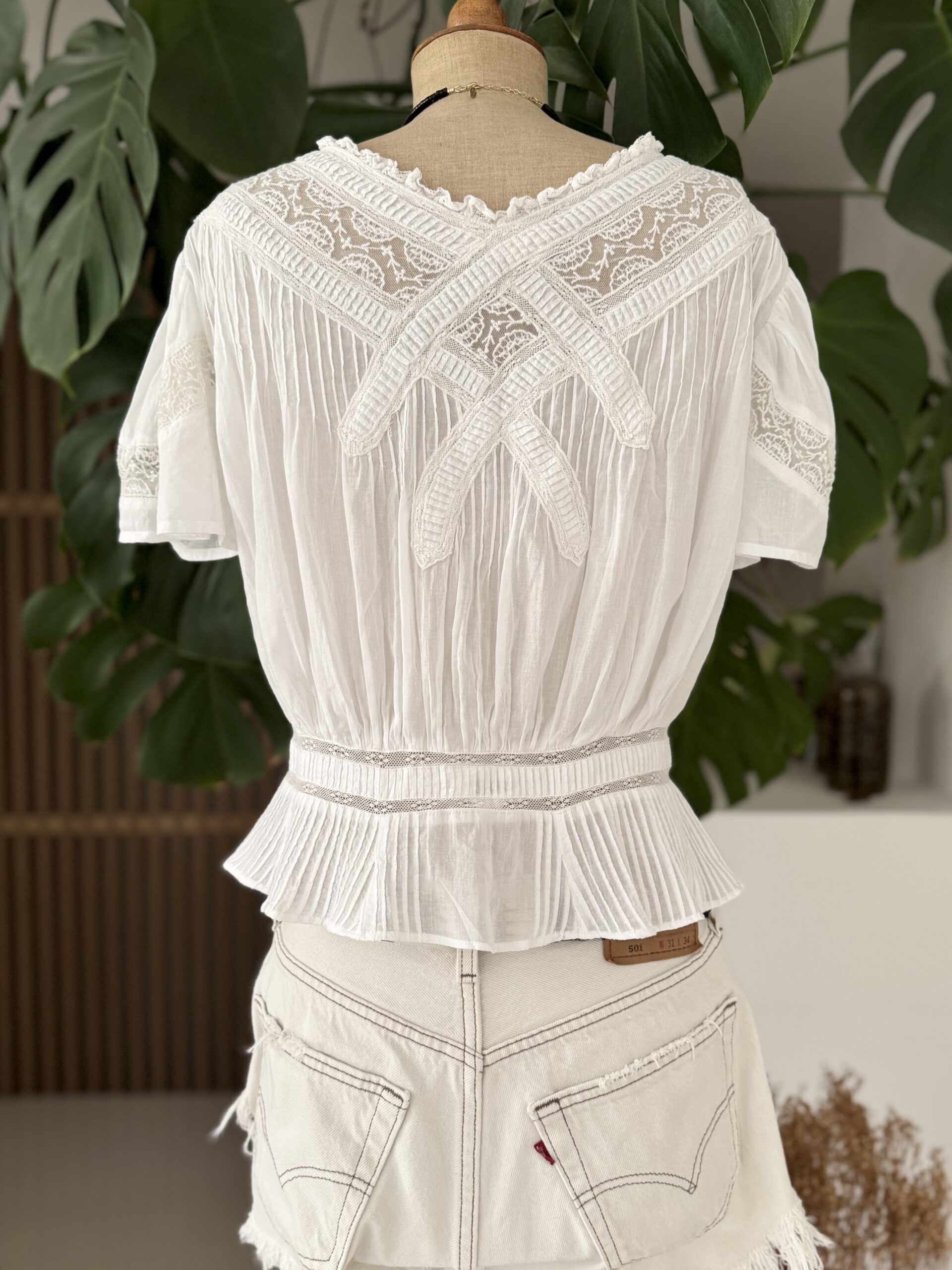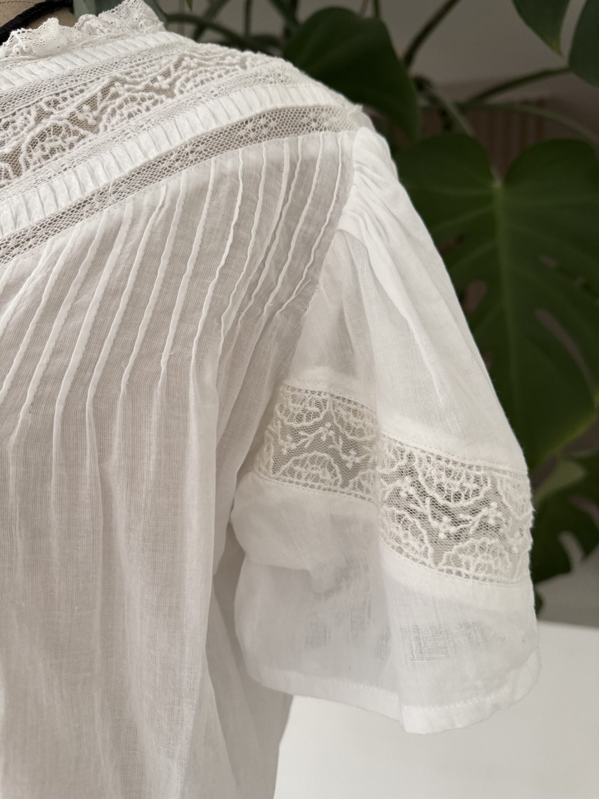 Blouse manches courtes en voile de coton incrusté d’empiècements de dentelles et jeu de broderies devant et dos. cintrage taille. Boutonnage devant. Une pièce unique!