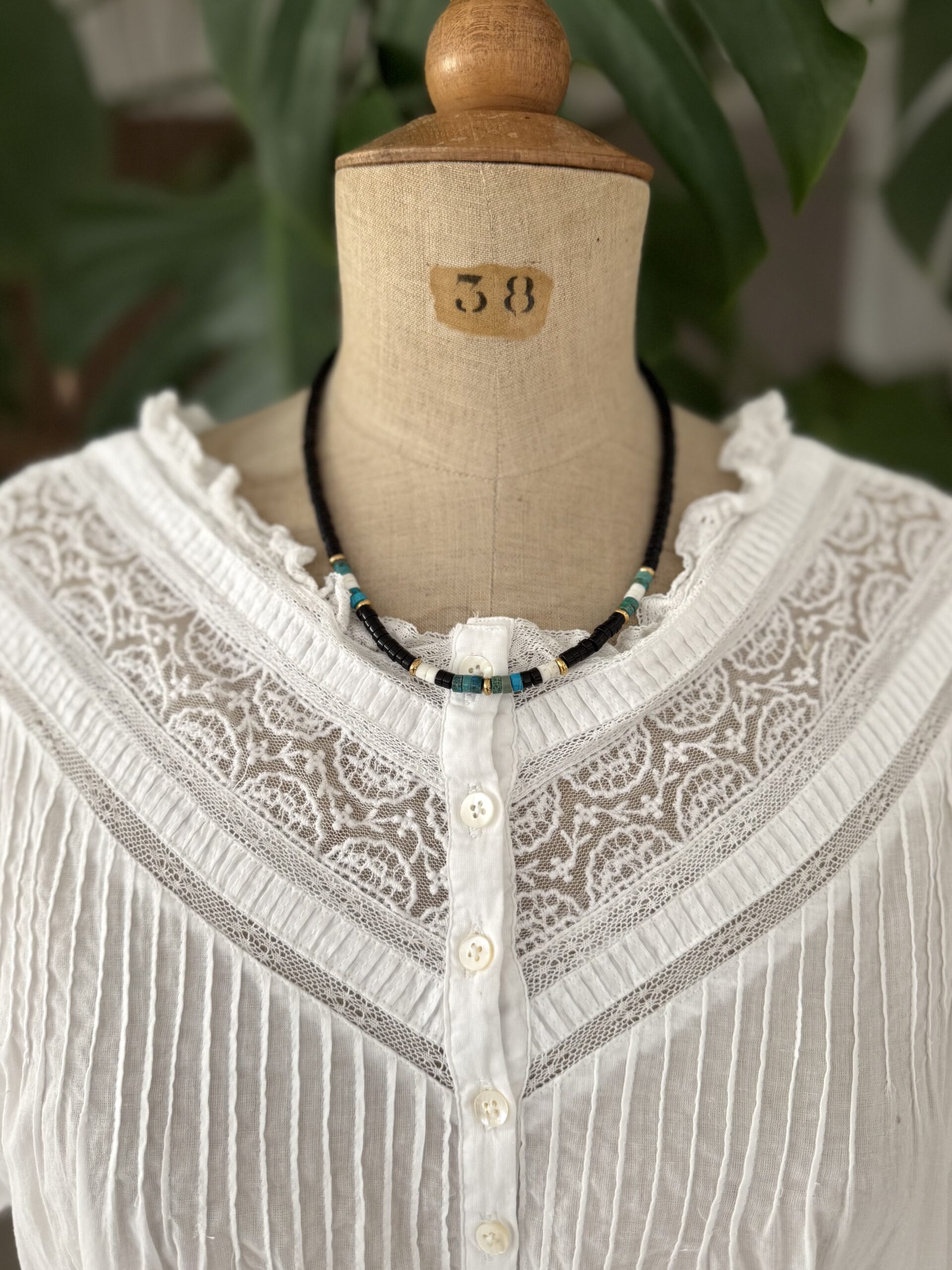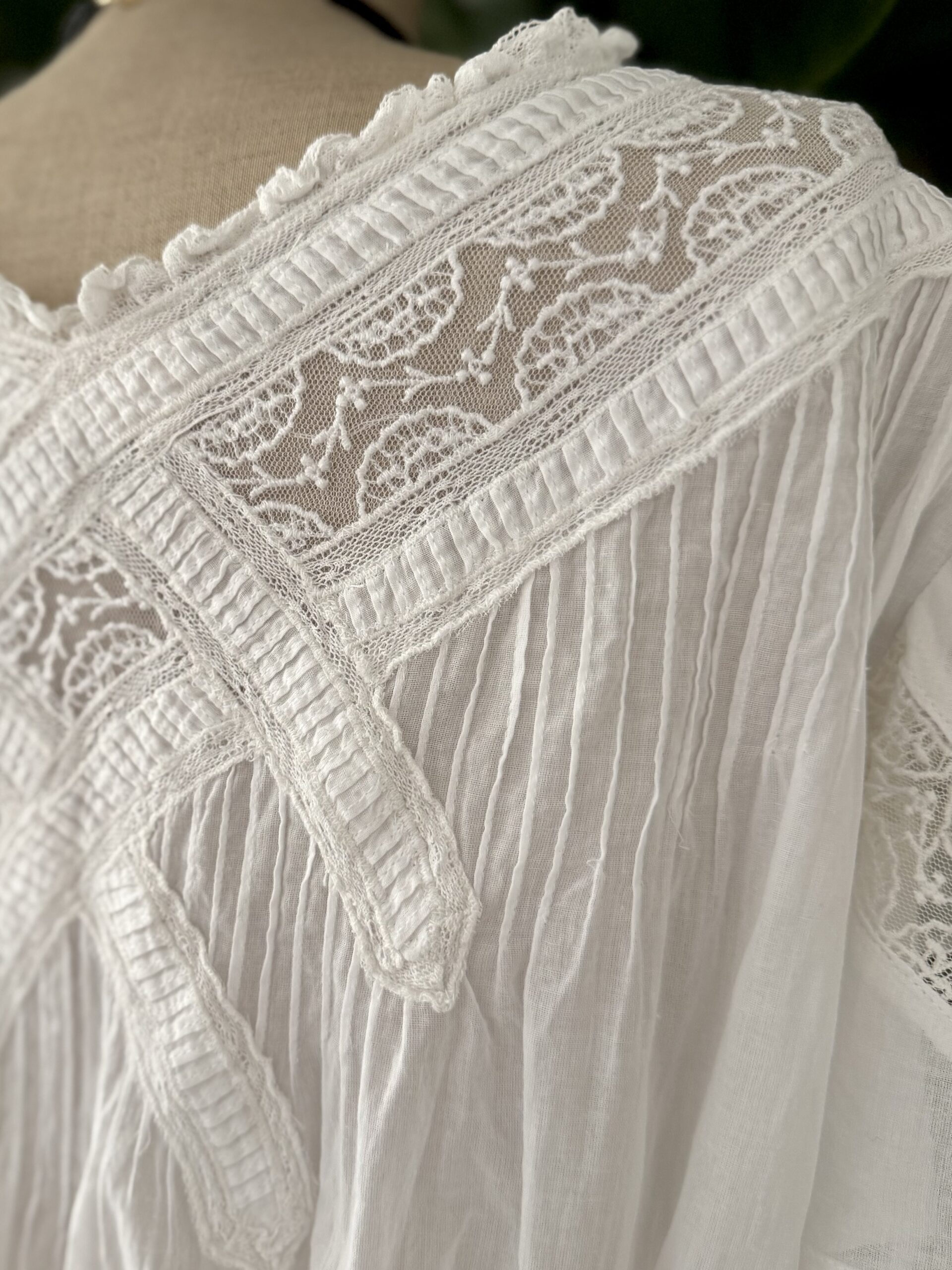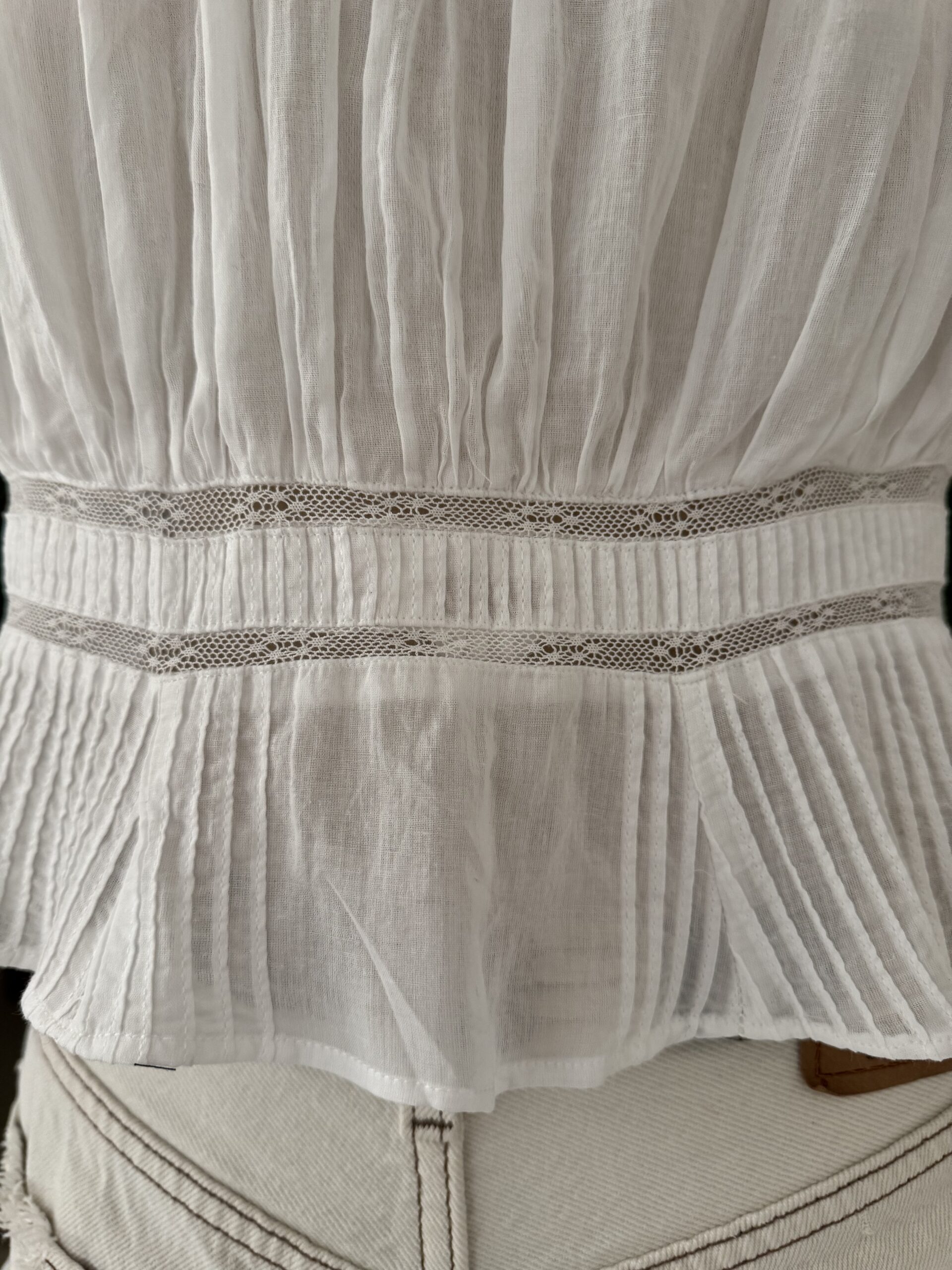 Blouse manches courtes en voile de coton incrusté d’empiècements de dentelles et jeu de broderies devant et dos. cintrage taille. Boutonnage devant. Une pièce unique!