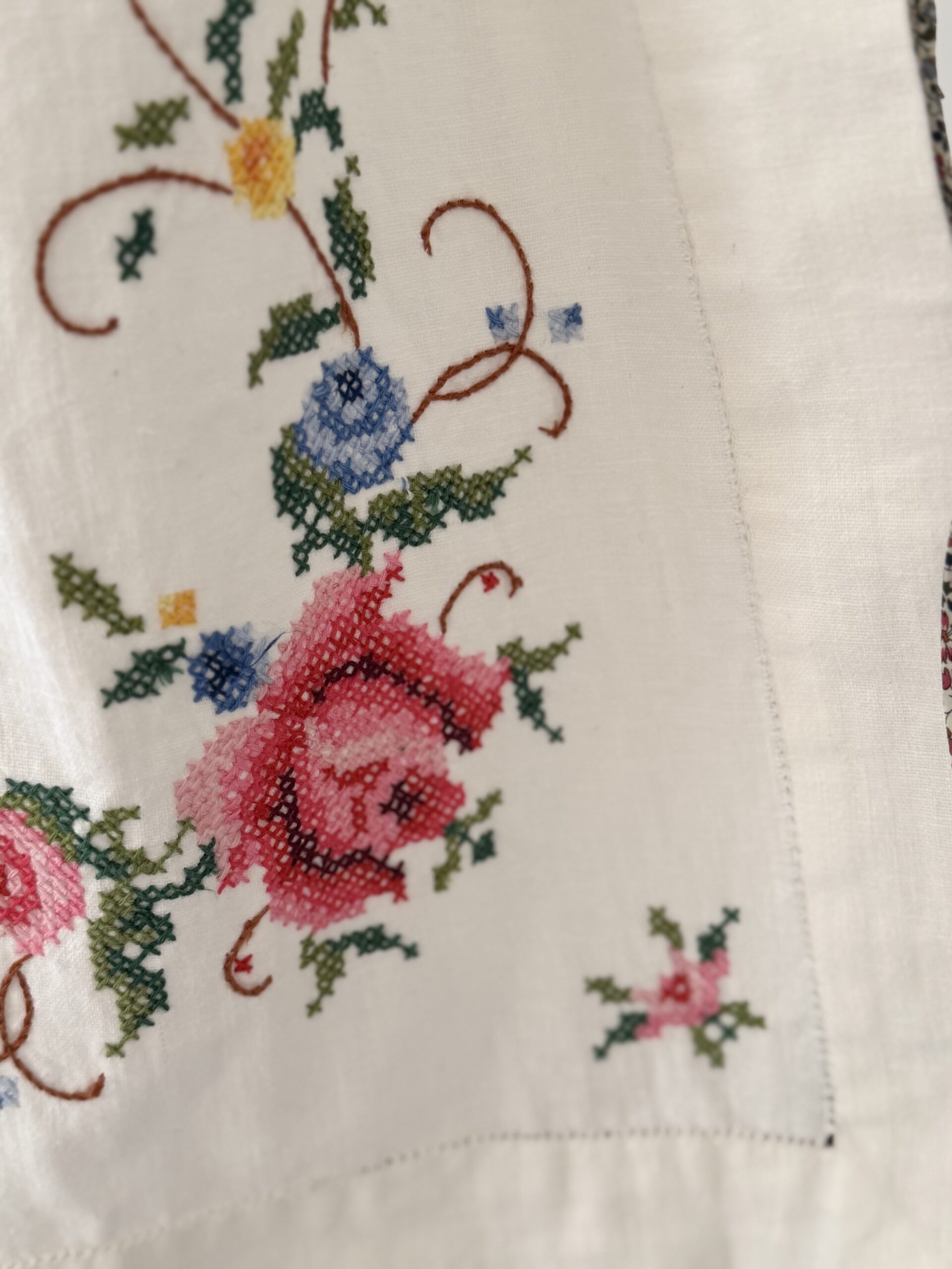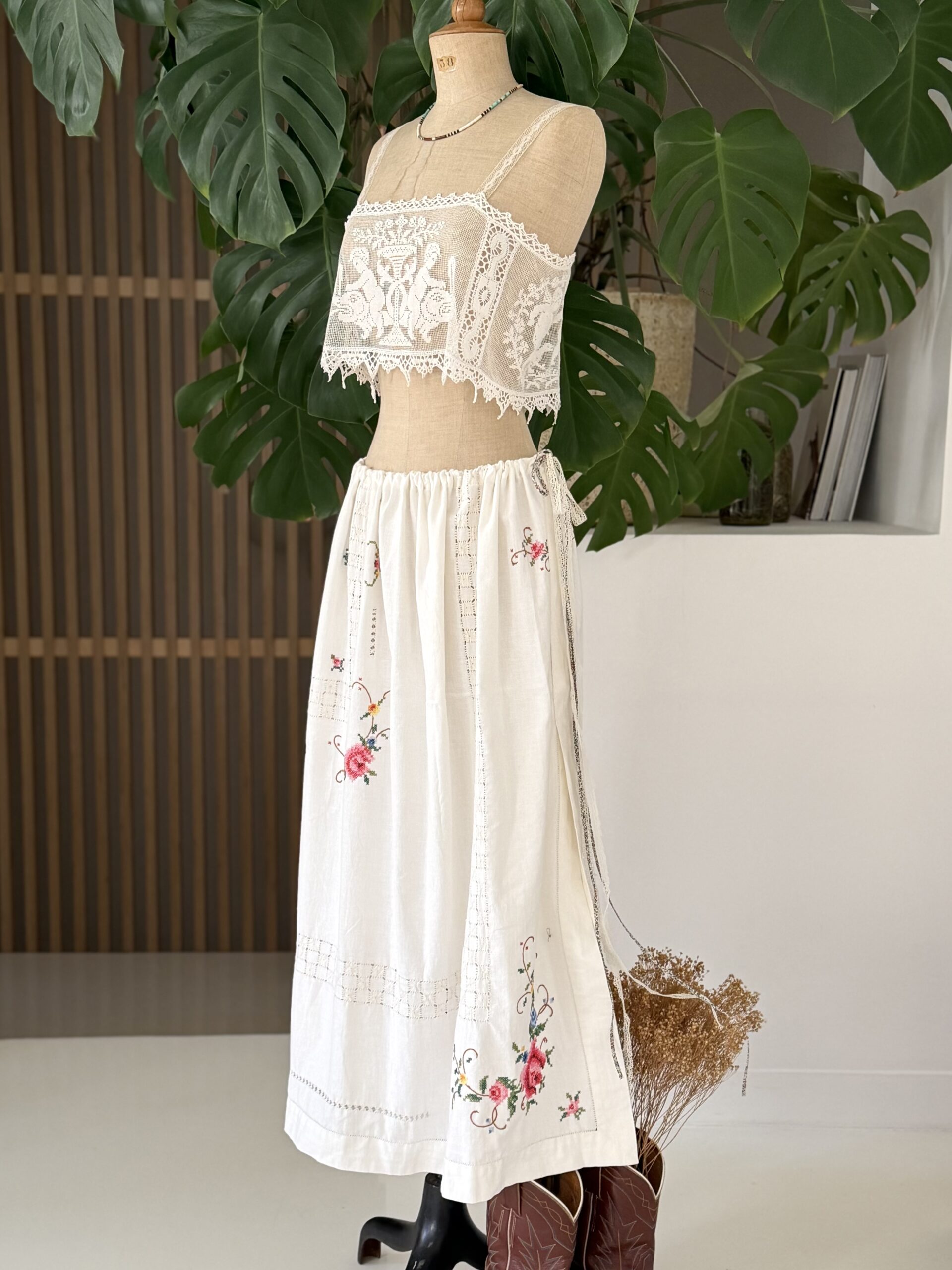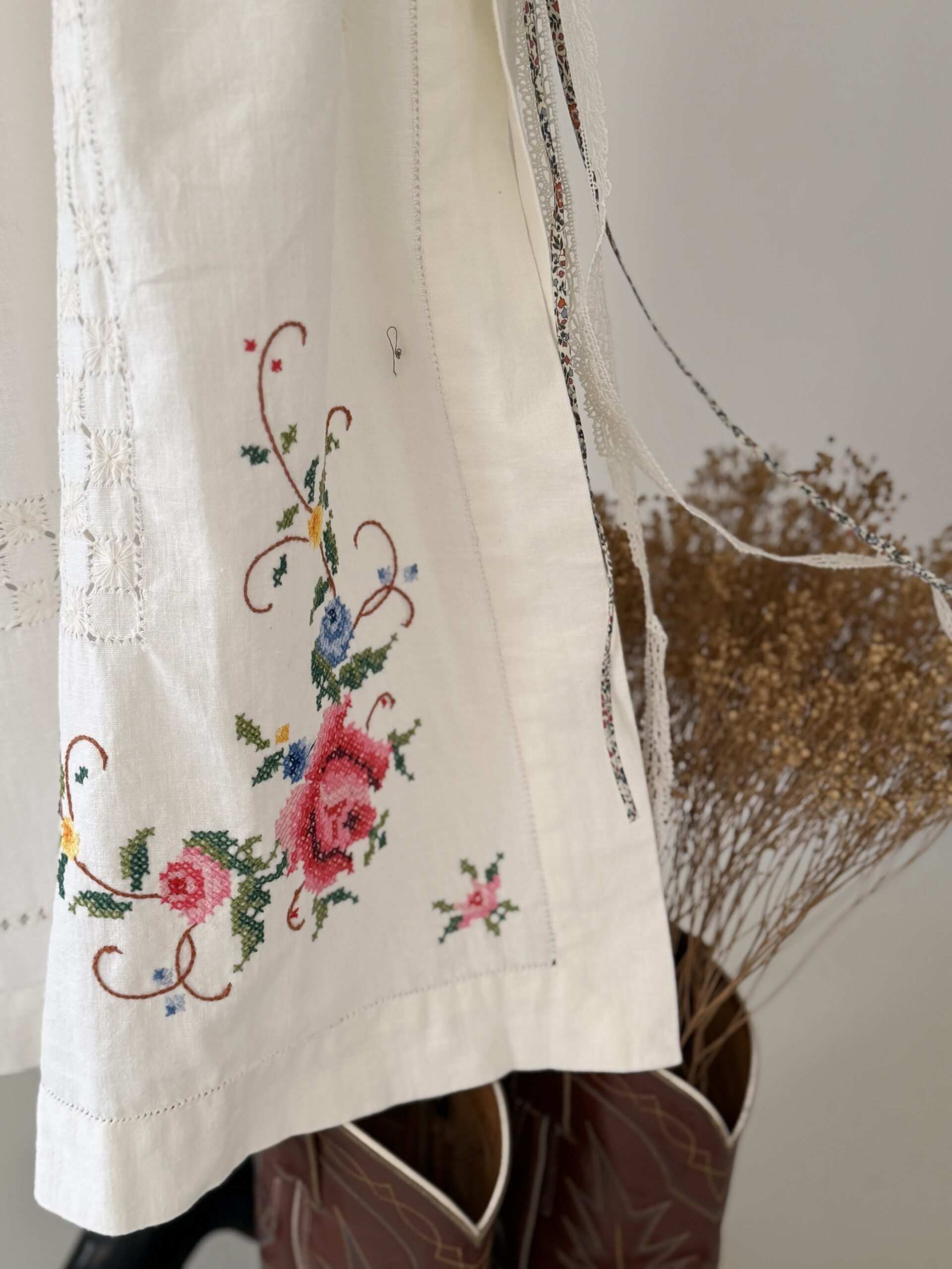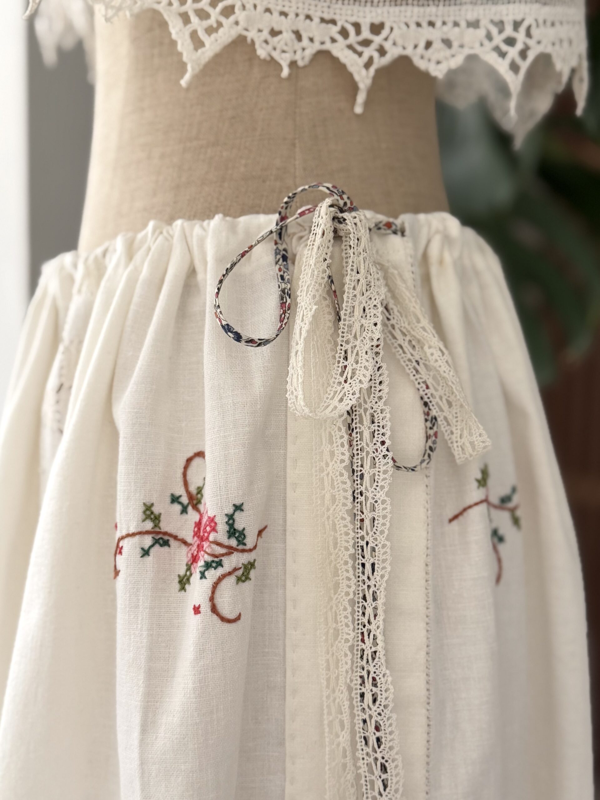 Jupon upcyclé confectionné dans une nappe ancienne datant du 20ème siècle. Placement de broderies colorées au pont de croix & points ajourés piqués main. Liens coulissant à la taille en dentelle et liberty. Une pièce Unique.