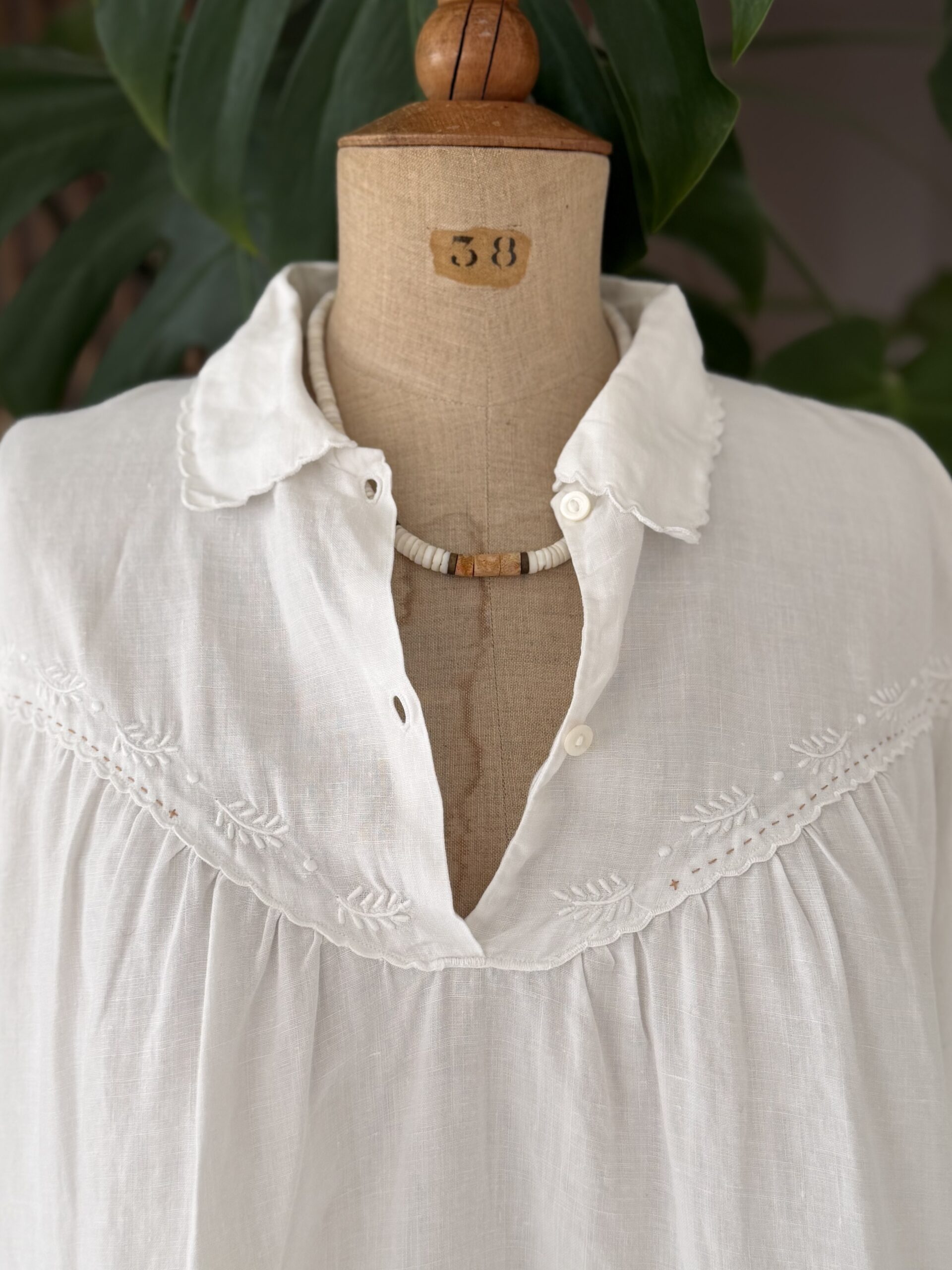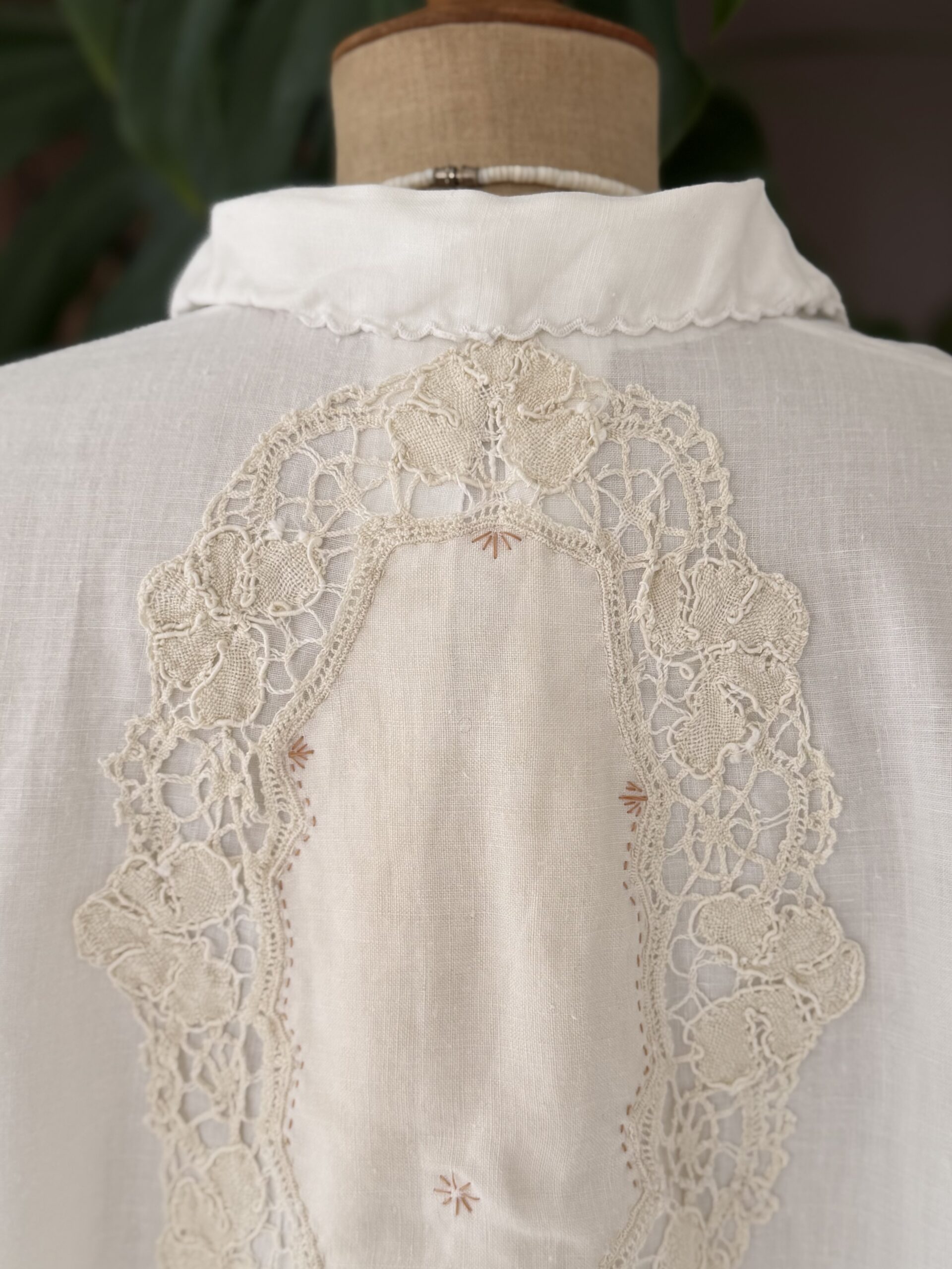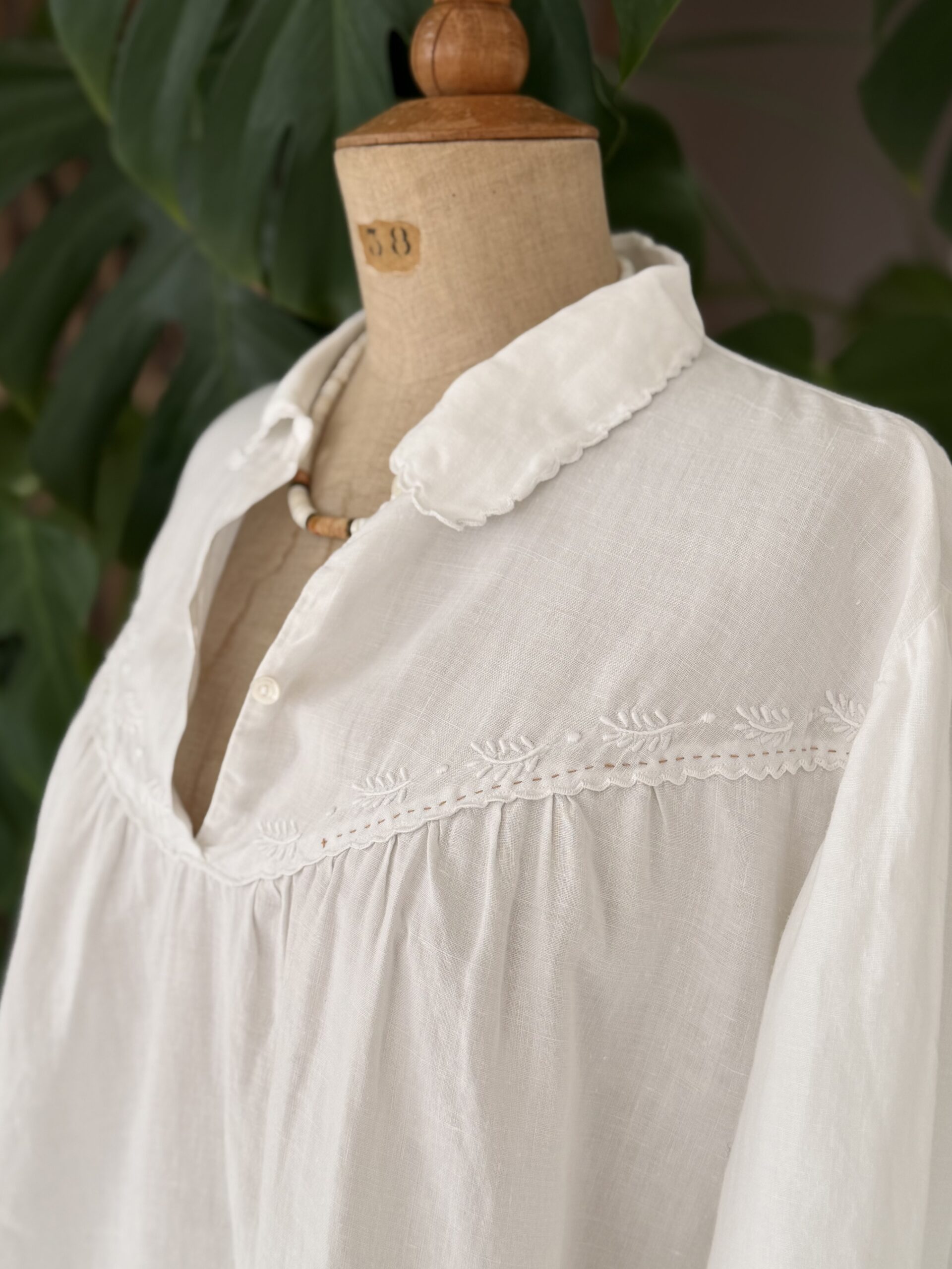 Blouse ancienne upcyclée en lin tissé datant du 20ème, broderies d’époque avec ajout d’un point sellier beige en découpe poitrine, empiècement dos entièrement piqué main. Une pièce Unique.