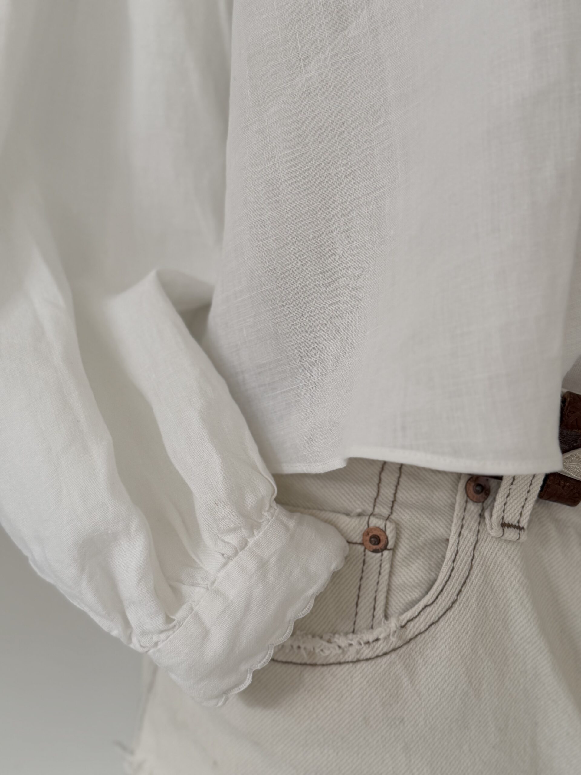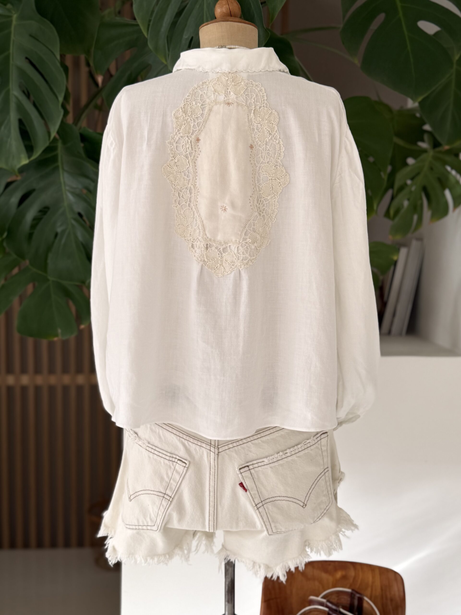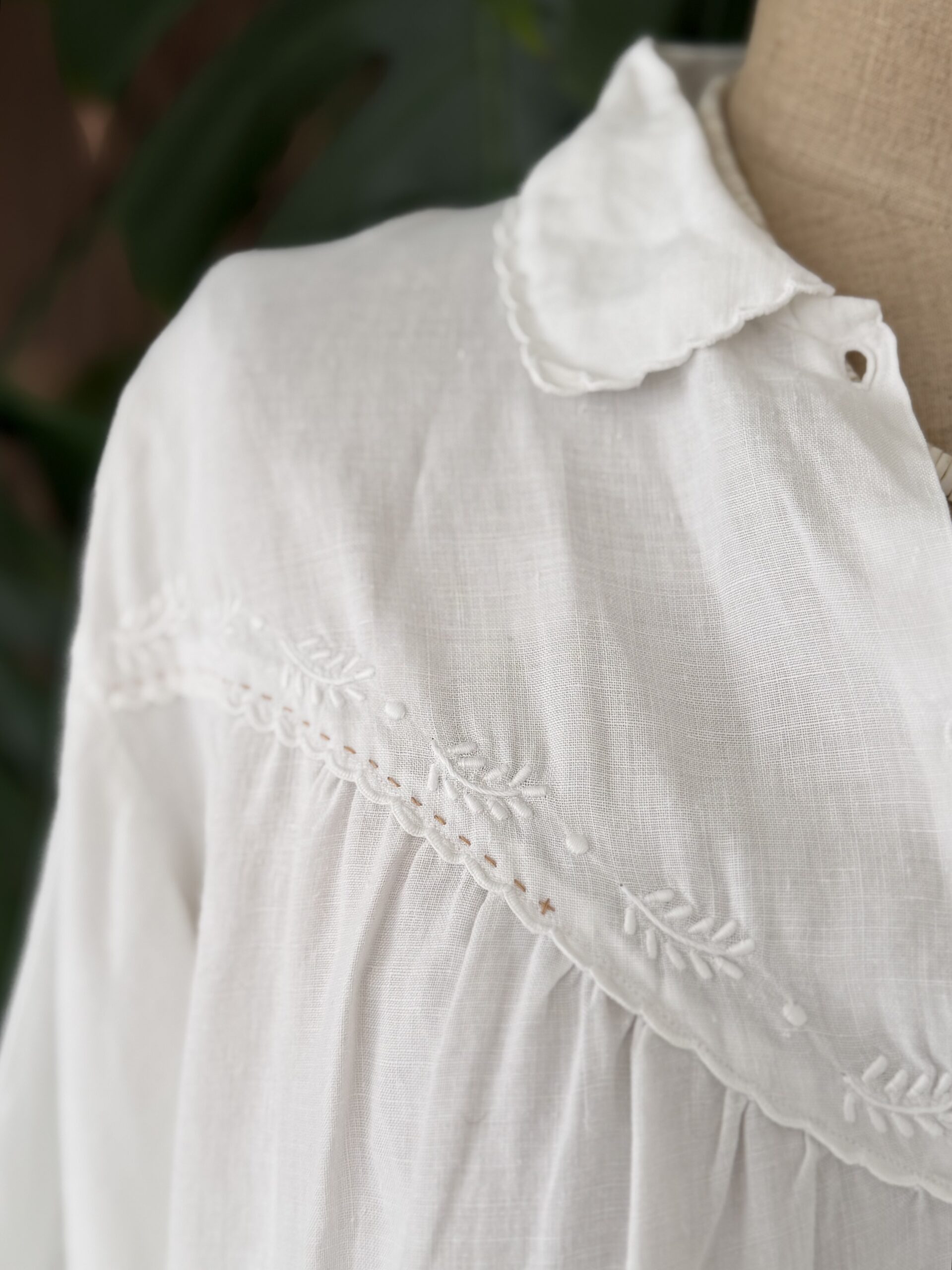 Blouse ancienne upcyclée en lin tissé datant du 20ème, broderies d’époque avec ajout d’un point sellier beige en découpe poitrine, empiècement dos entièrement piqué main. Une pièce Unique.