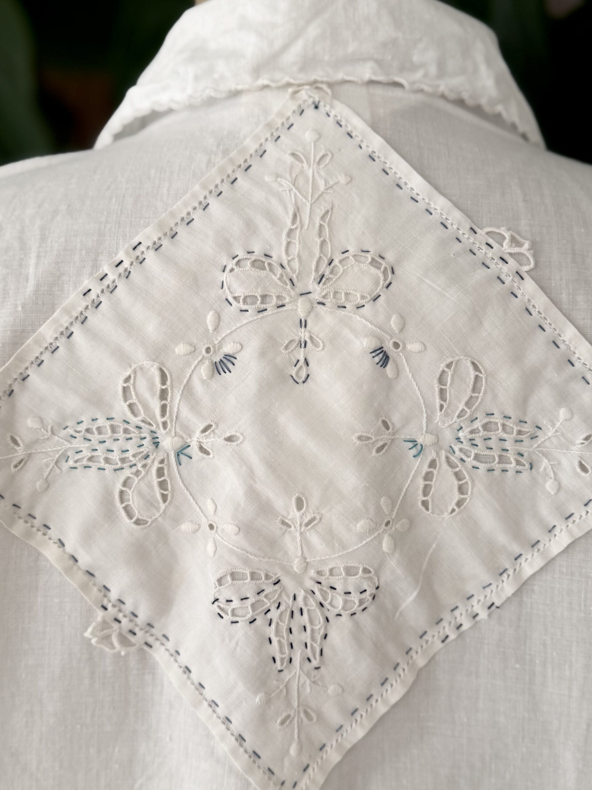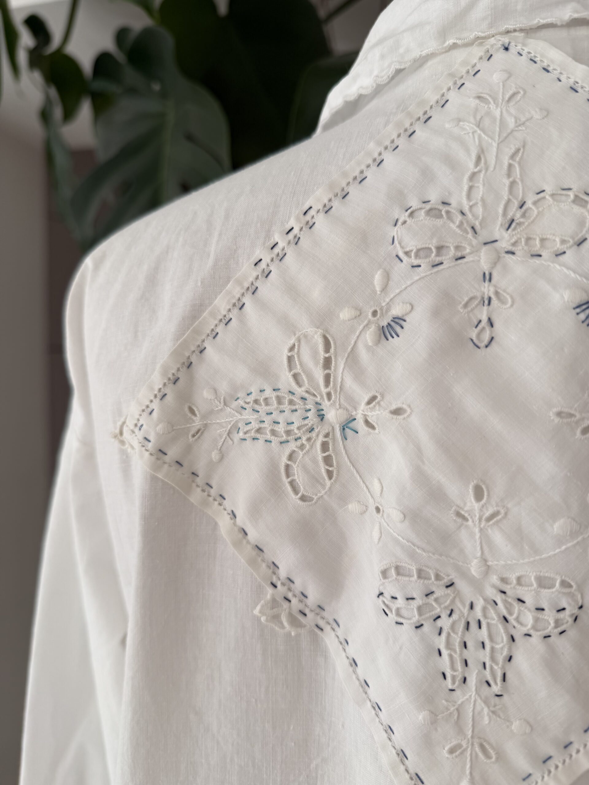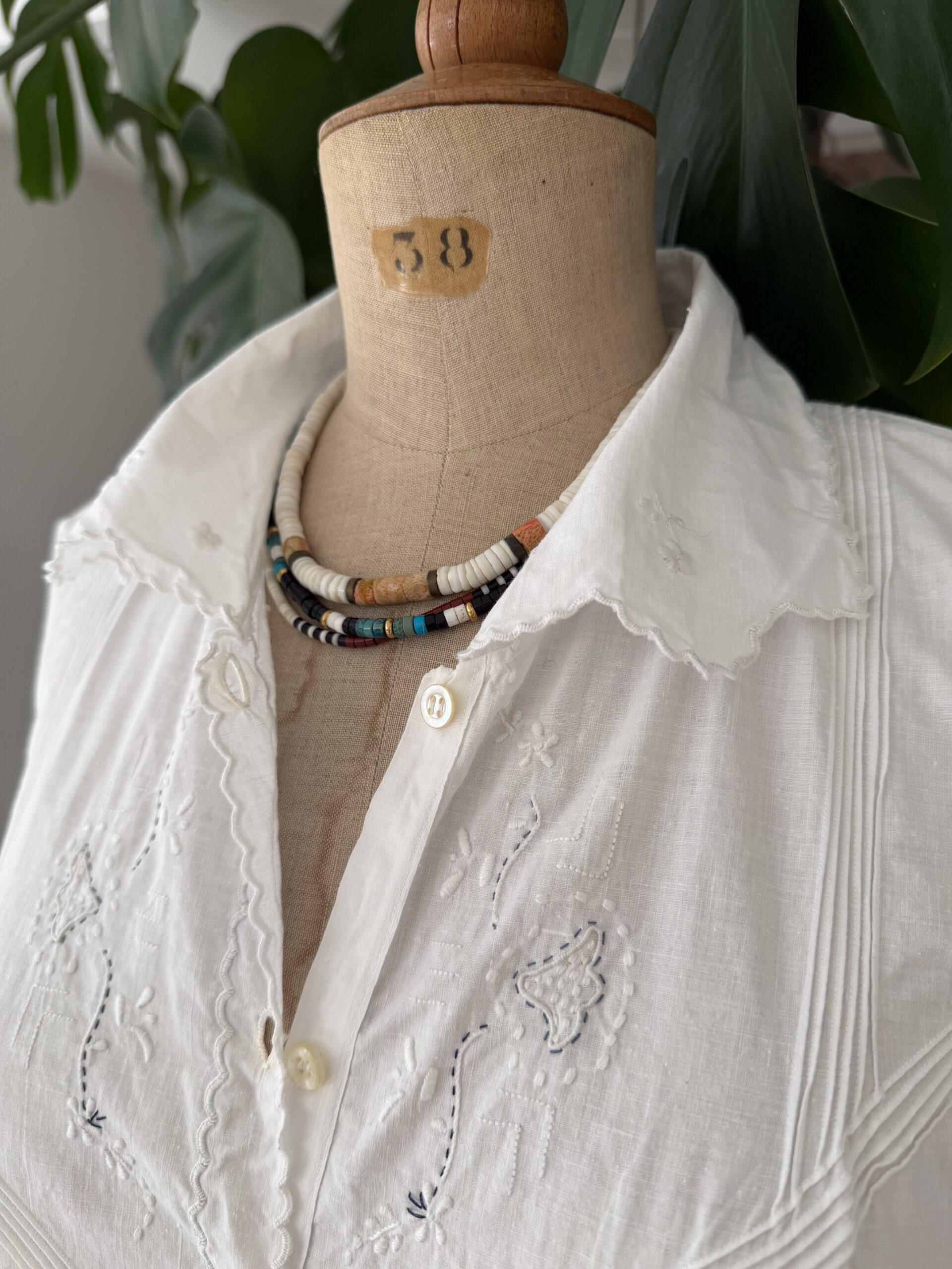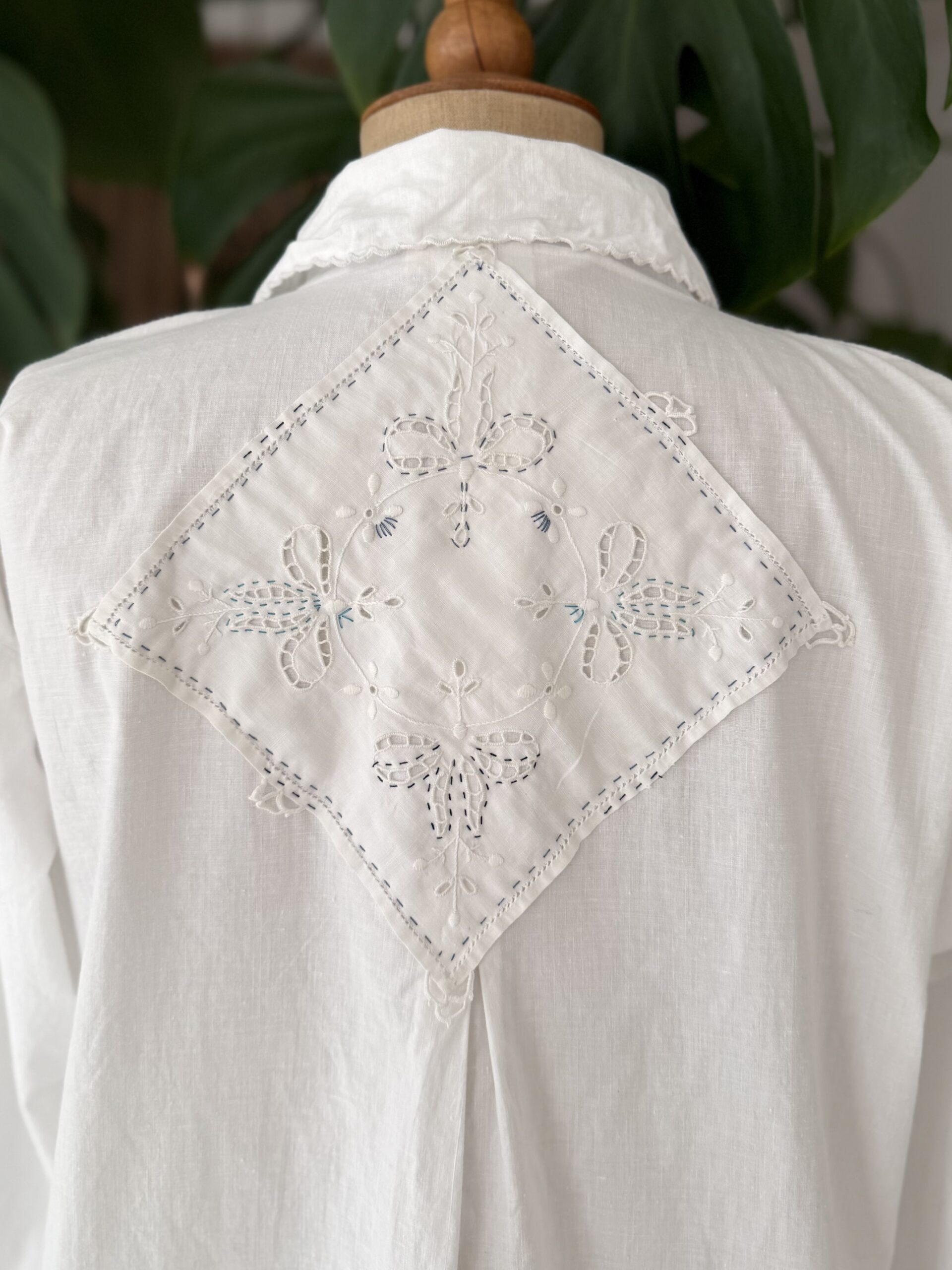 Blouse ancienne upcyclée en popeline de coton tissé datant du 20ème, finition plis nervure et broderie d’époque en carrure. Ajout d’un point sellier contrasté. Empiècement dos entièrement piqué main. Une pièce Unique.