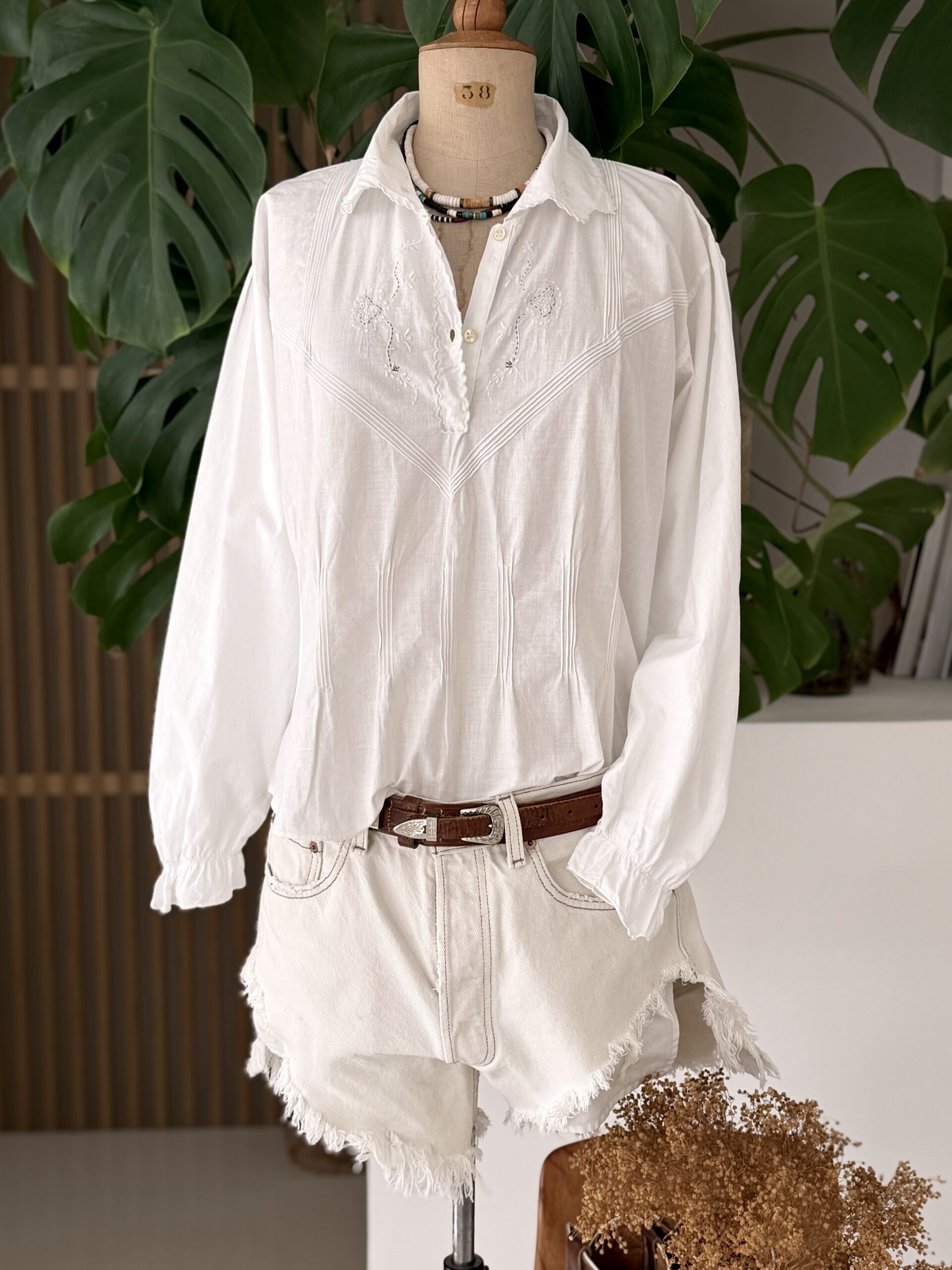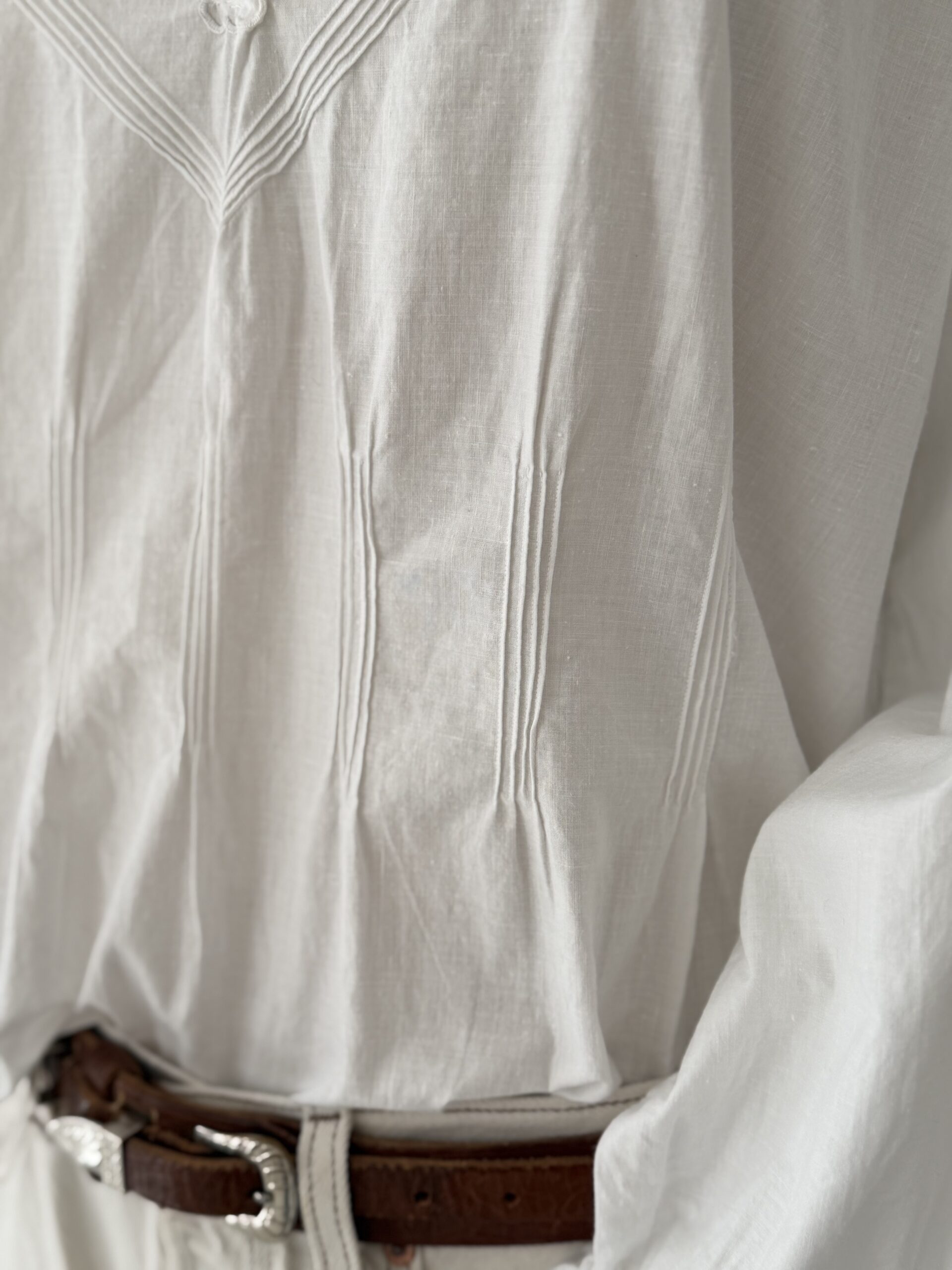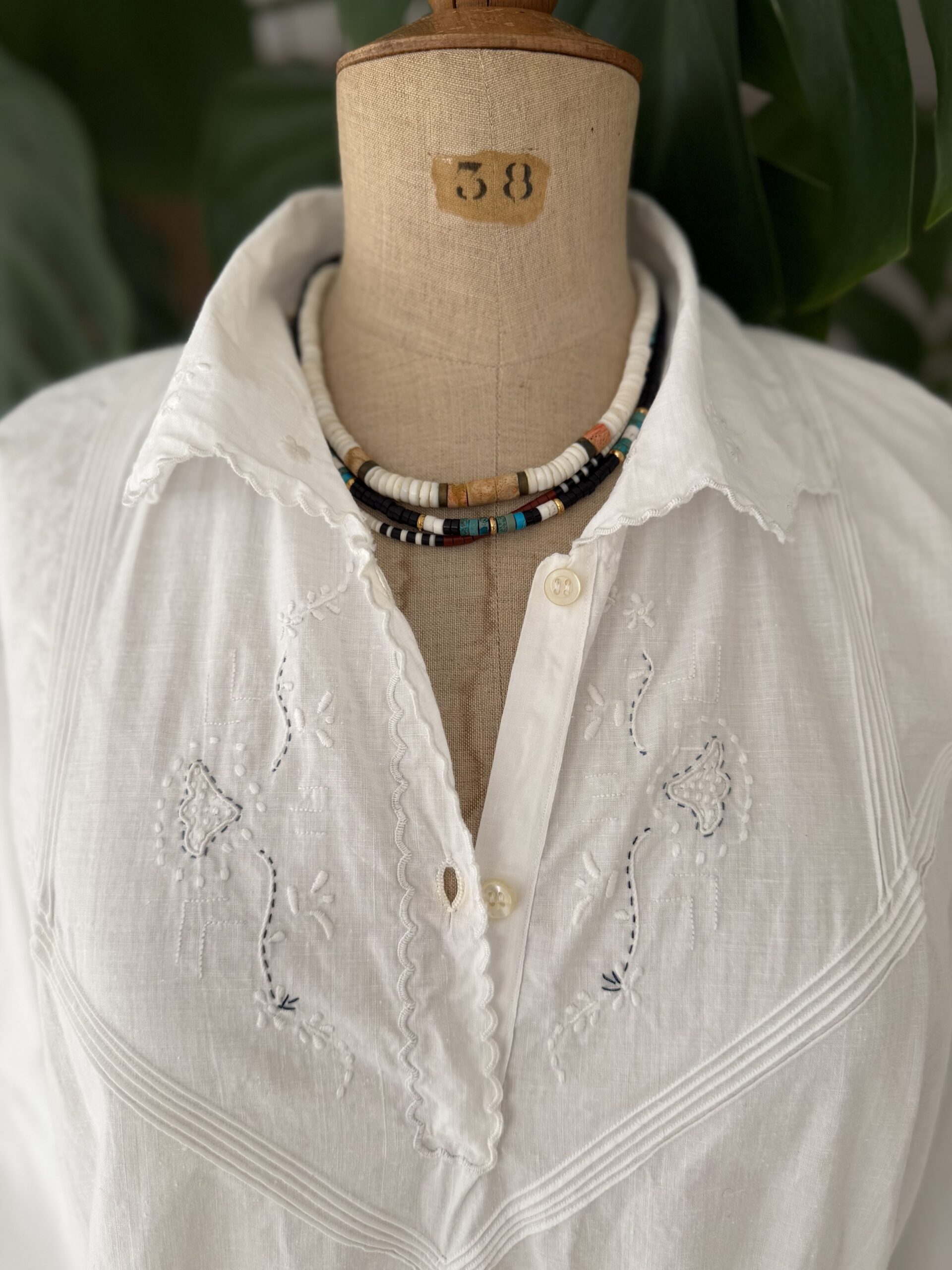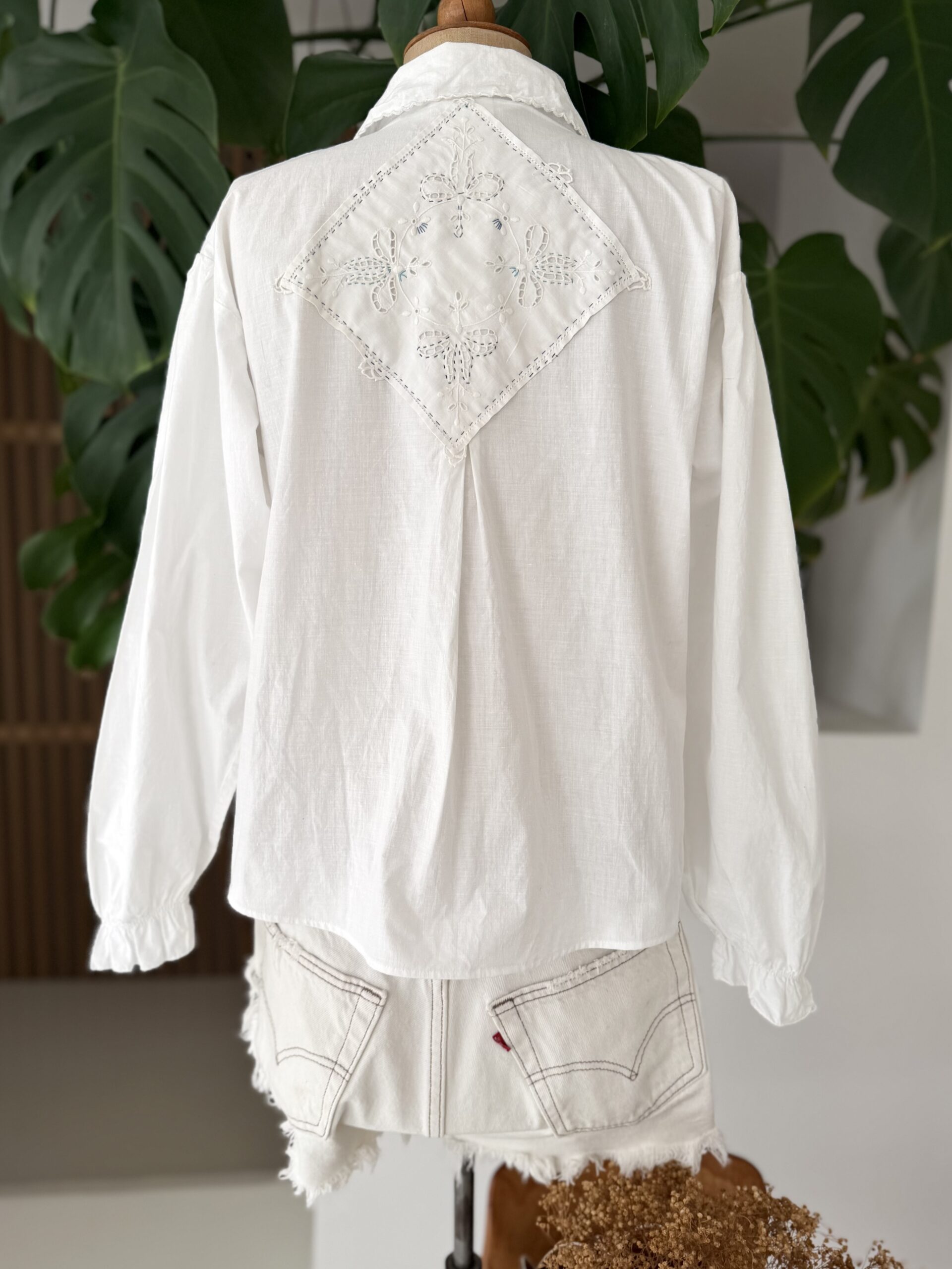 Blouse ancienne upcyclée en popeline de coton tissé datant du 20ème, finition plis nervure et broderie d’époque en carrure. Ajout d’un point sellier contrasté. Empiècement dos entièrement piqué main. Une pièce Unique.
