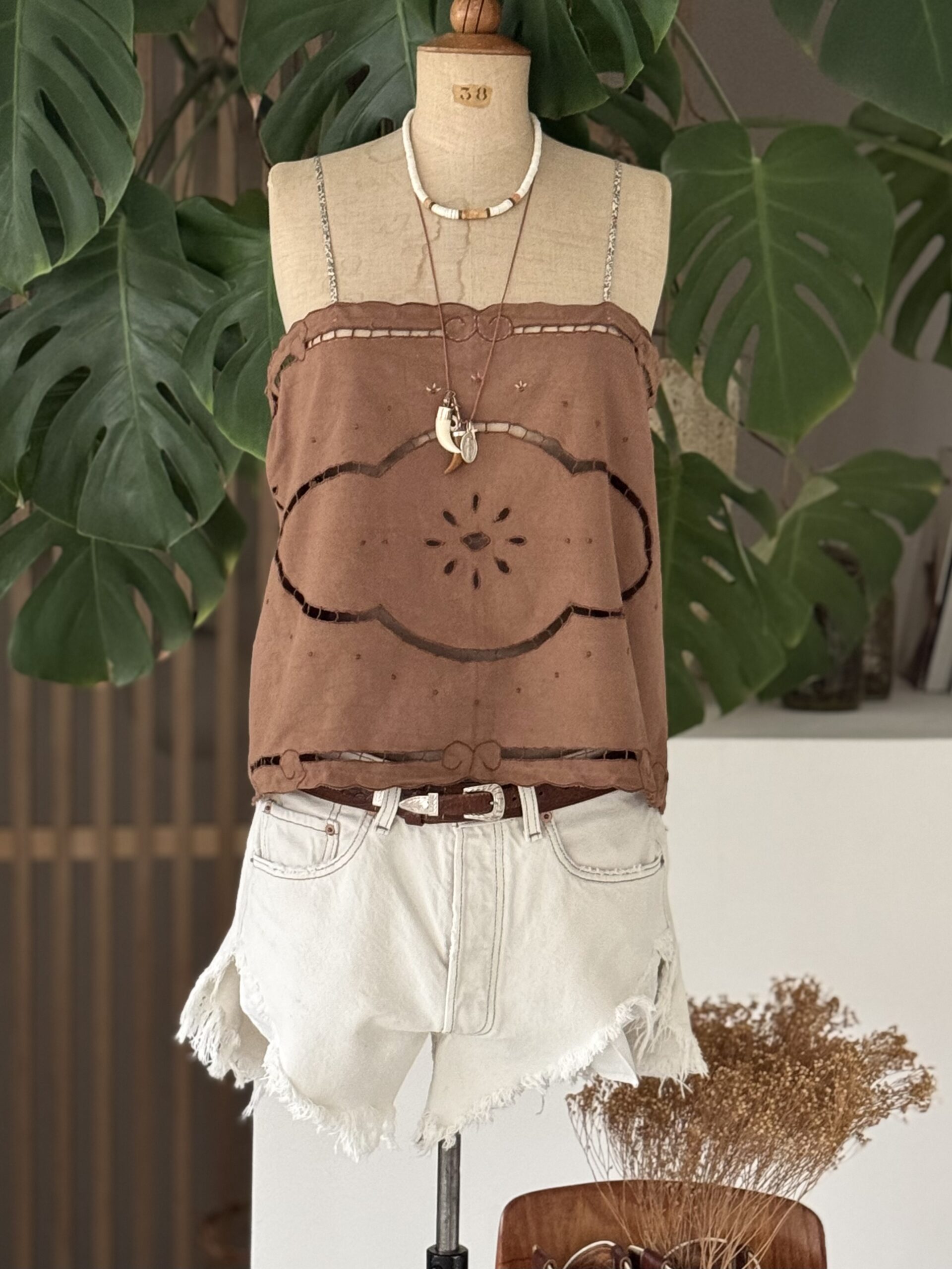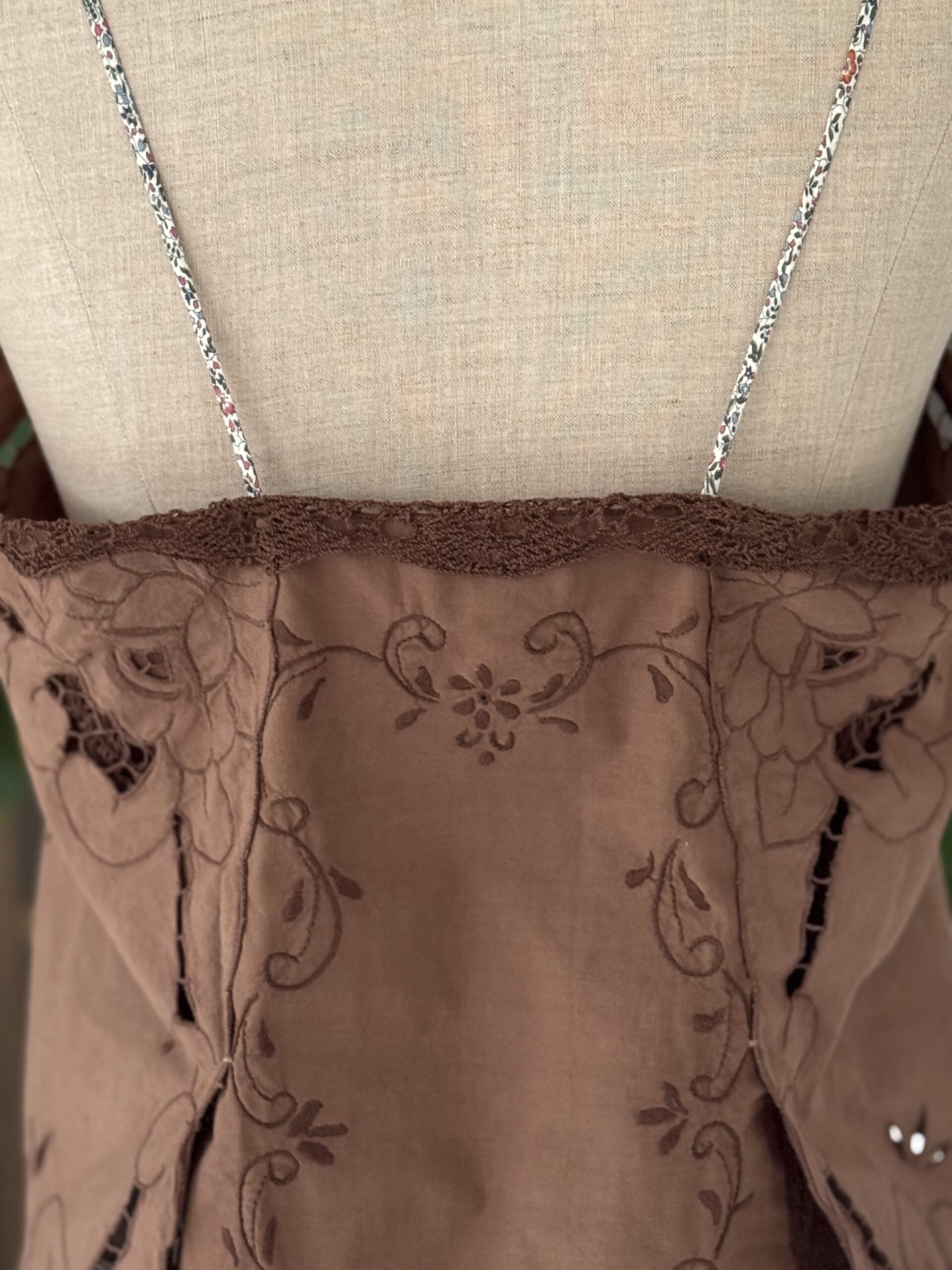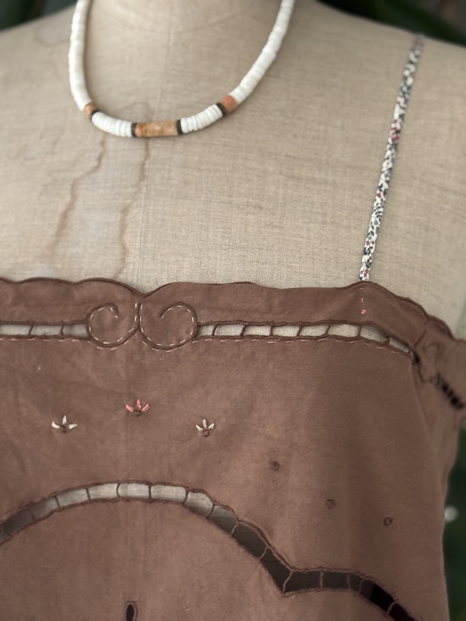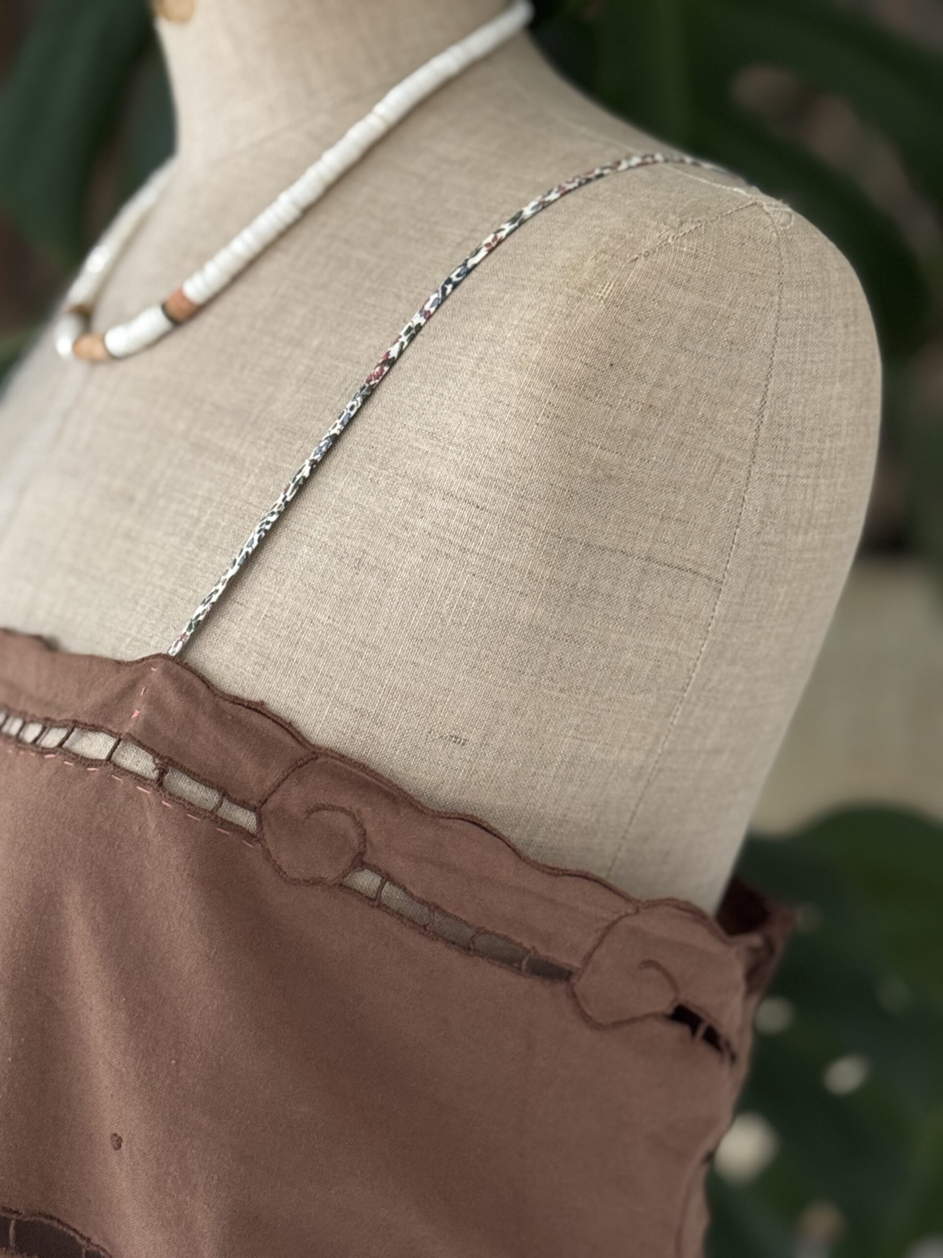 Débardeur upcyclé encoton confectionné dans de l’ancien linge de table teint en Brun Nespresso, bretelles en ruban imprimé Liberty. Une pièce unique!