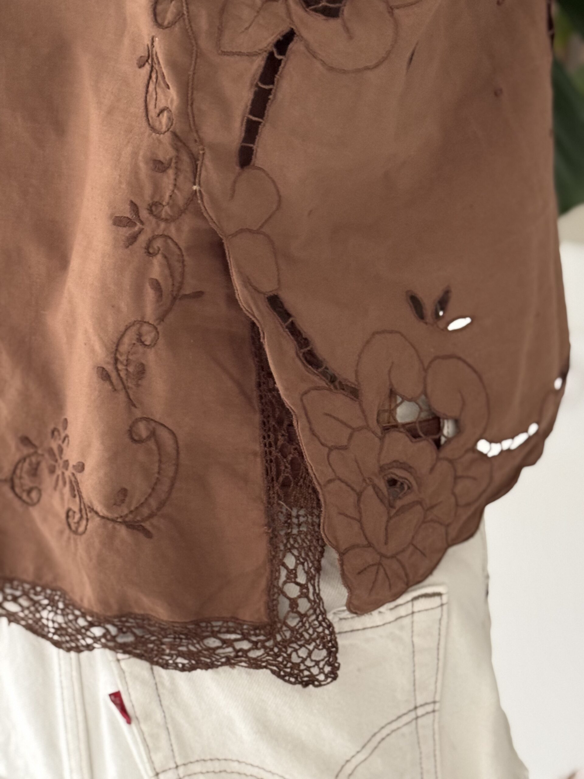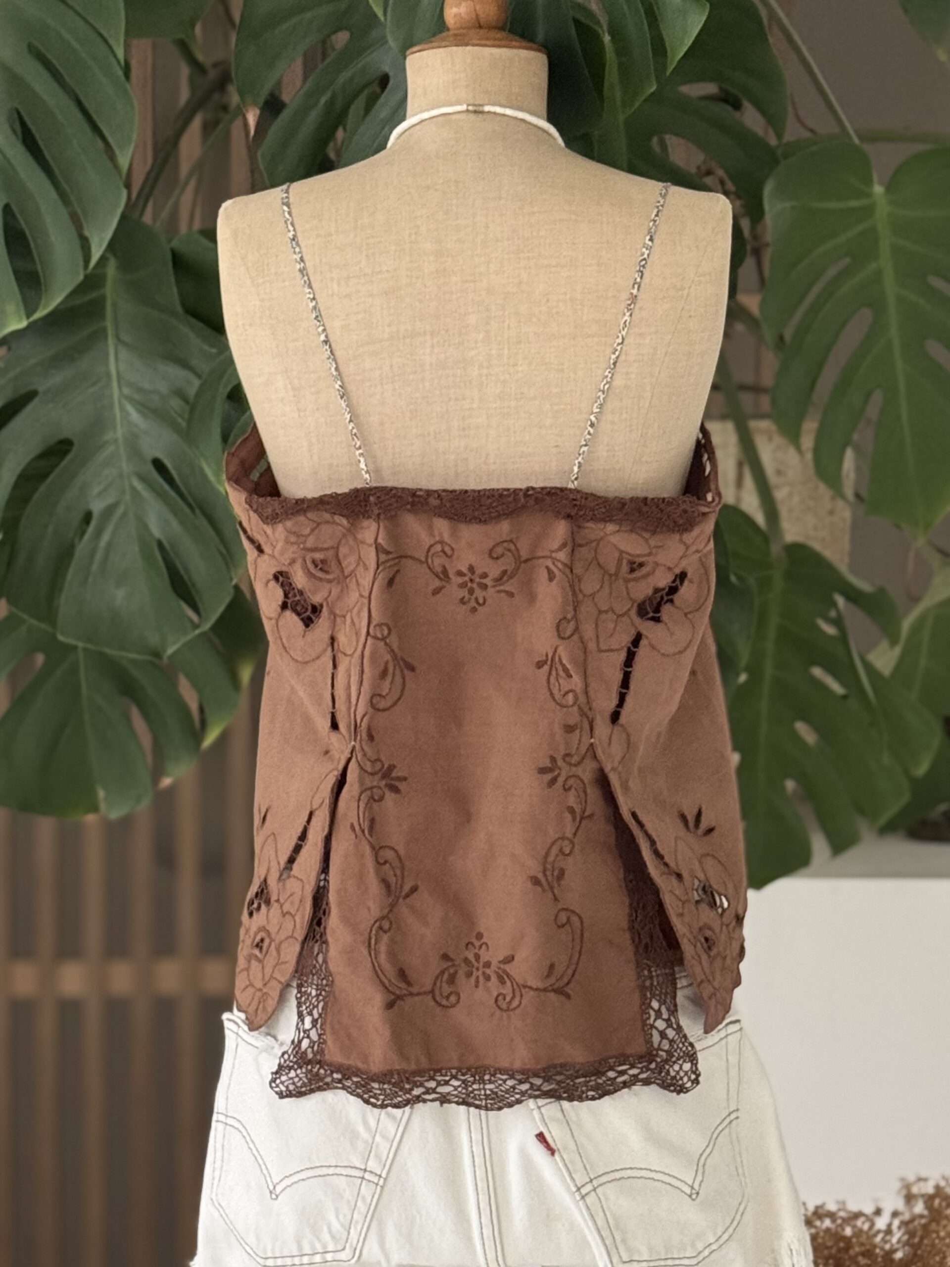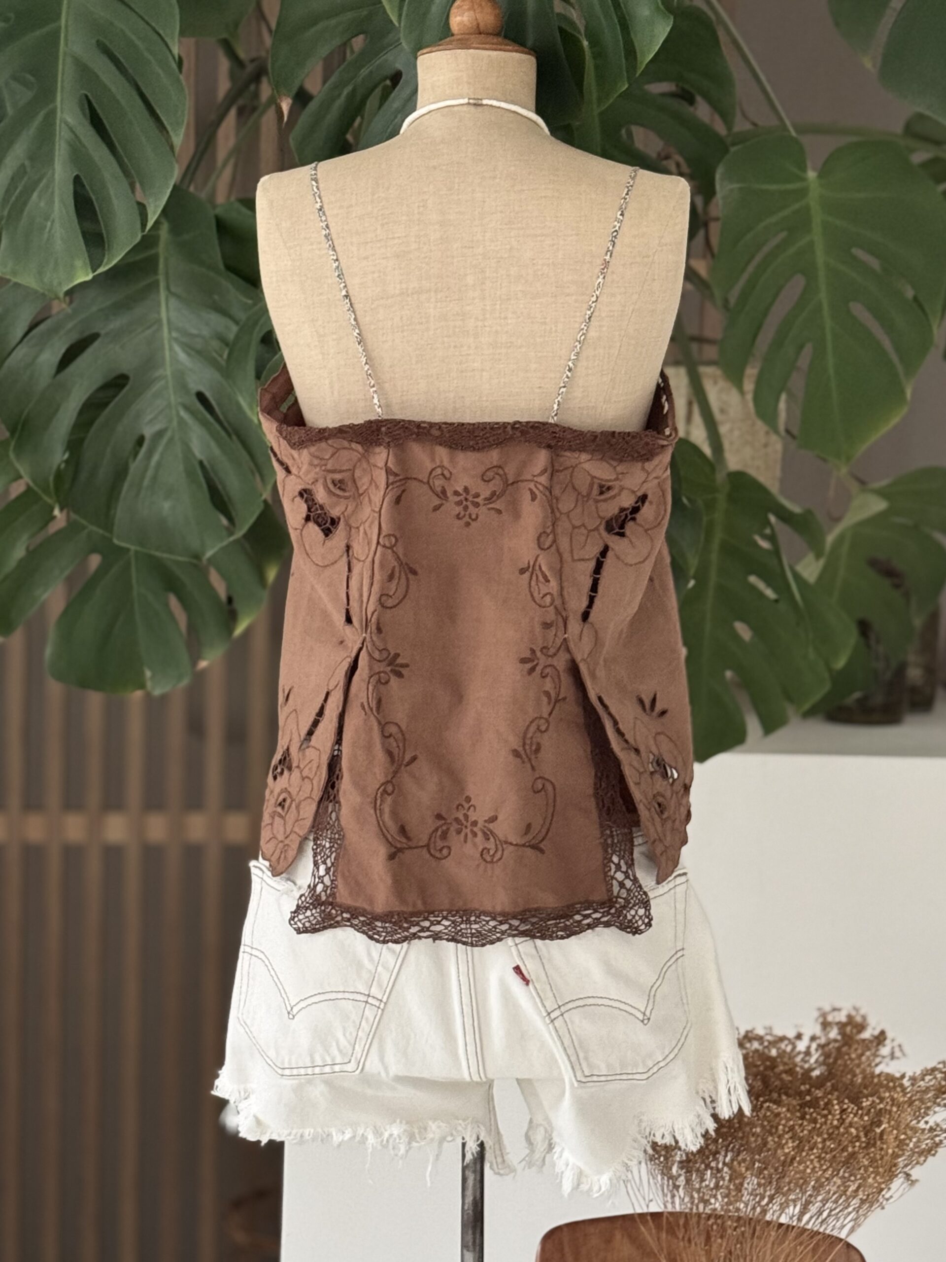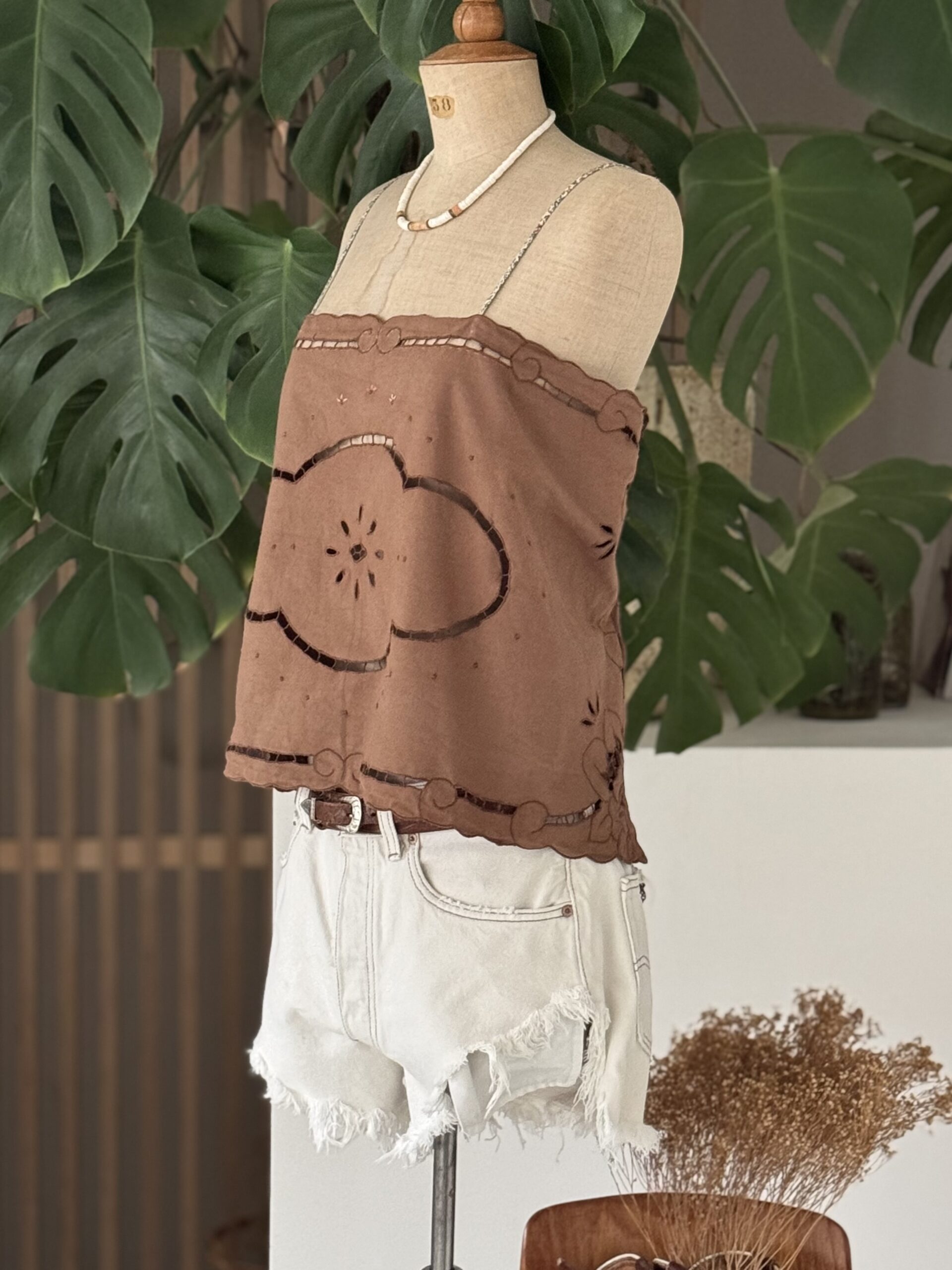 Débardeur upcyclé encoton confectionné dans de l’ancien linge de table teint en Brun Nespresso, bretelles en ruban imprimé Liberty. Une pièce unique!