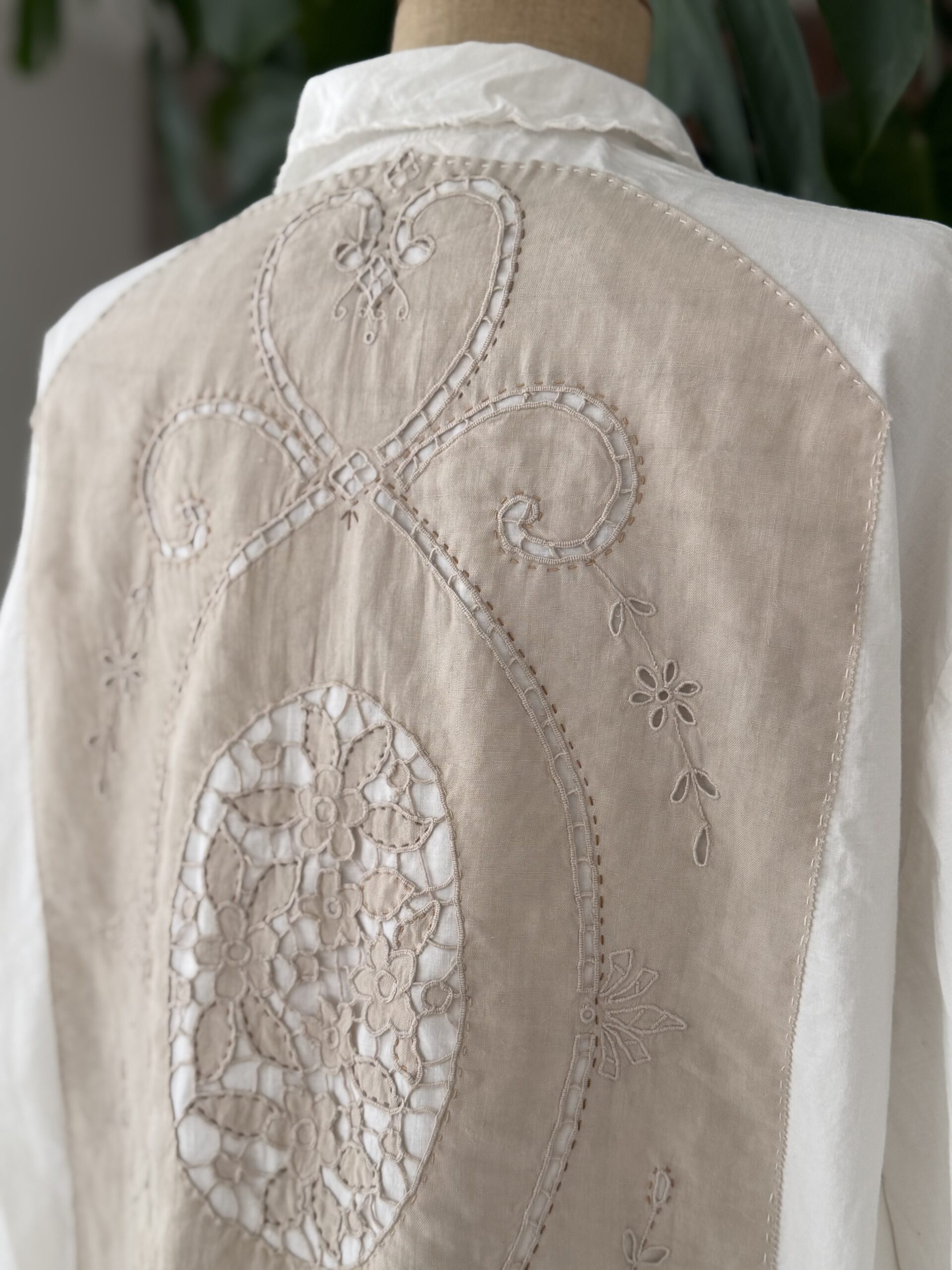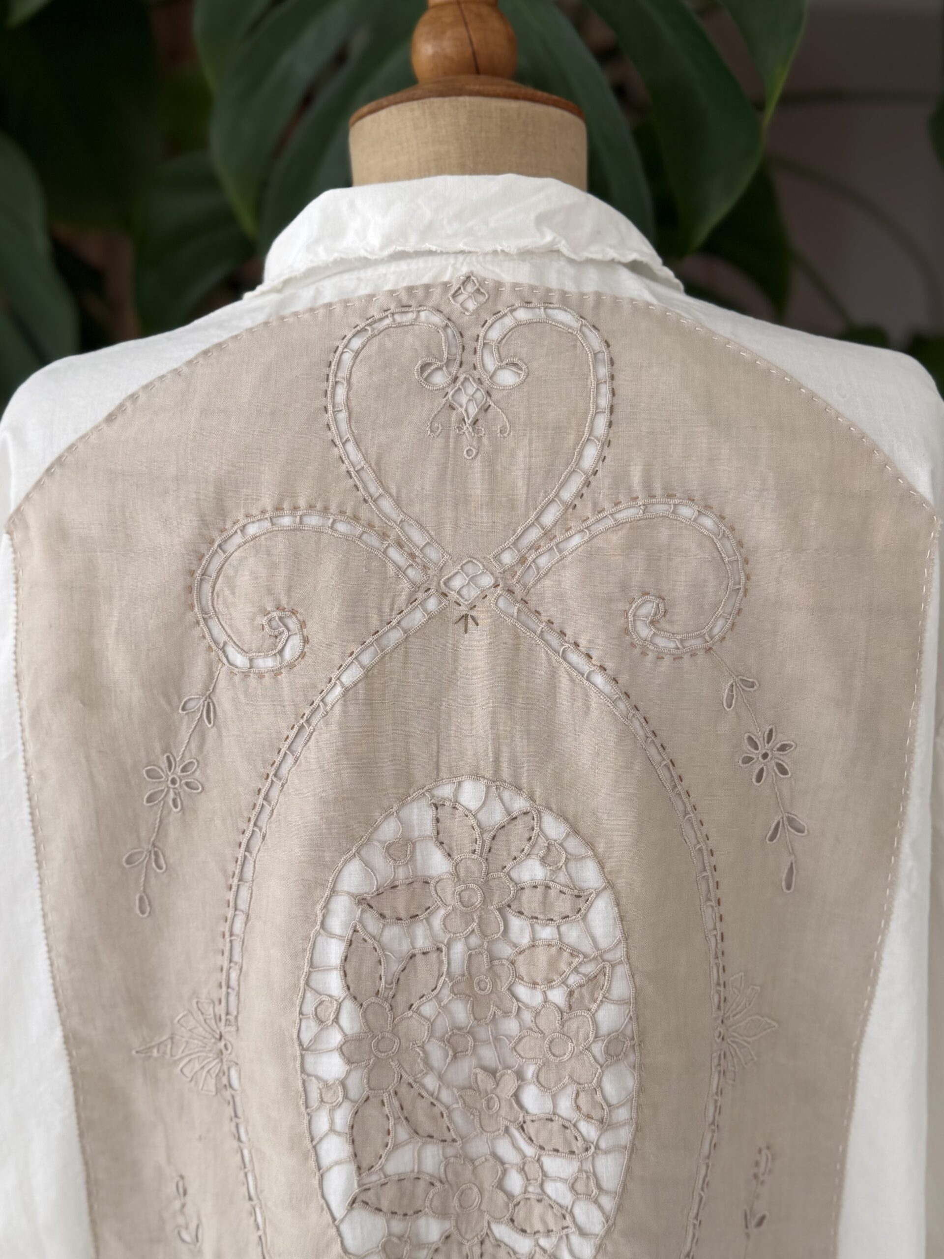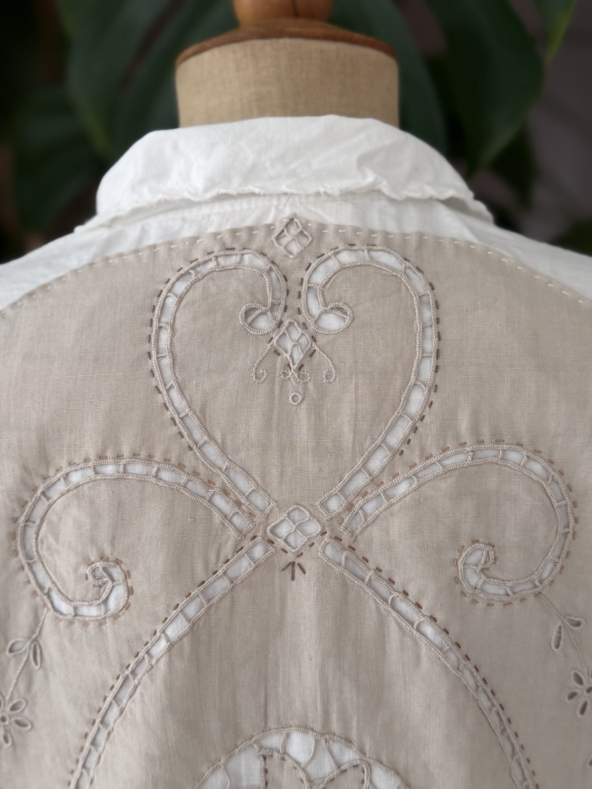 Blouse ancienne upcyclée en coton tissé datant du 20ème, finition broderie d’époque en carrure et au col. Empiècement dos en broderie ajourée coloris gris rosé entièrement piqué main. Finition point sellier contrasté. Une pièce Unique.
