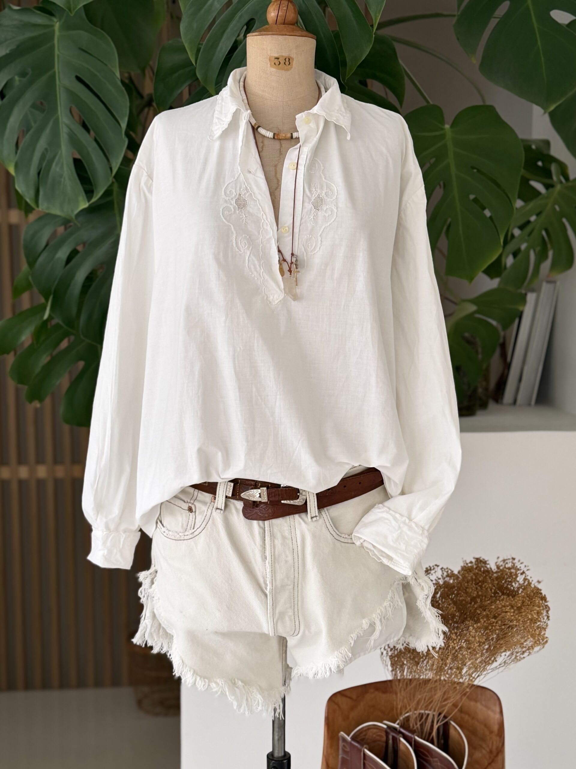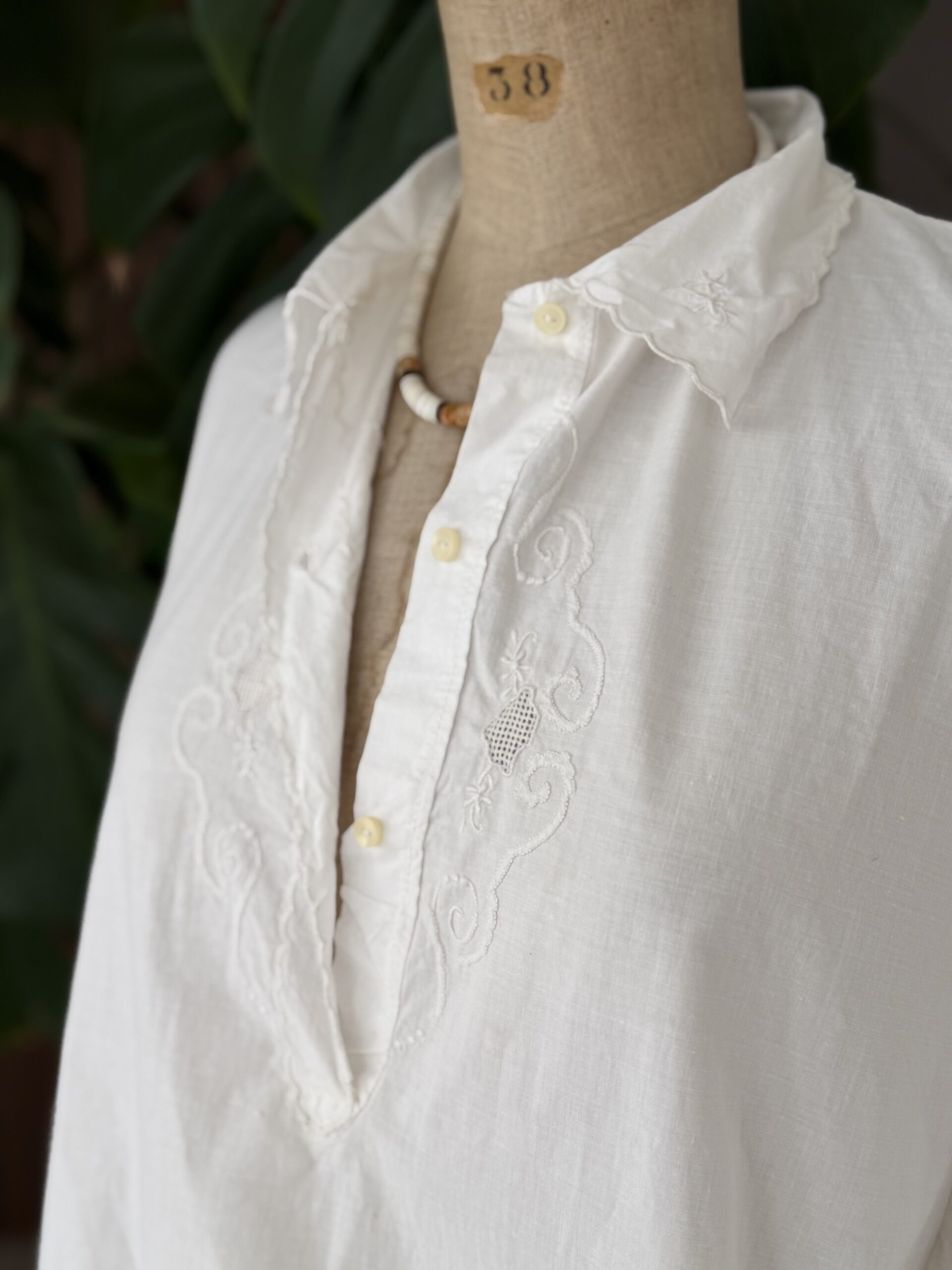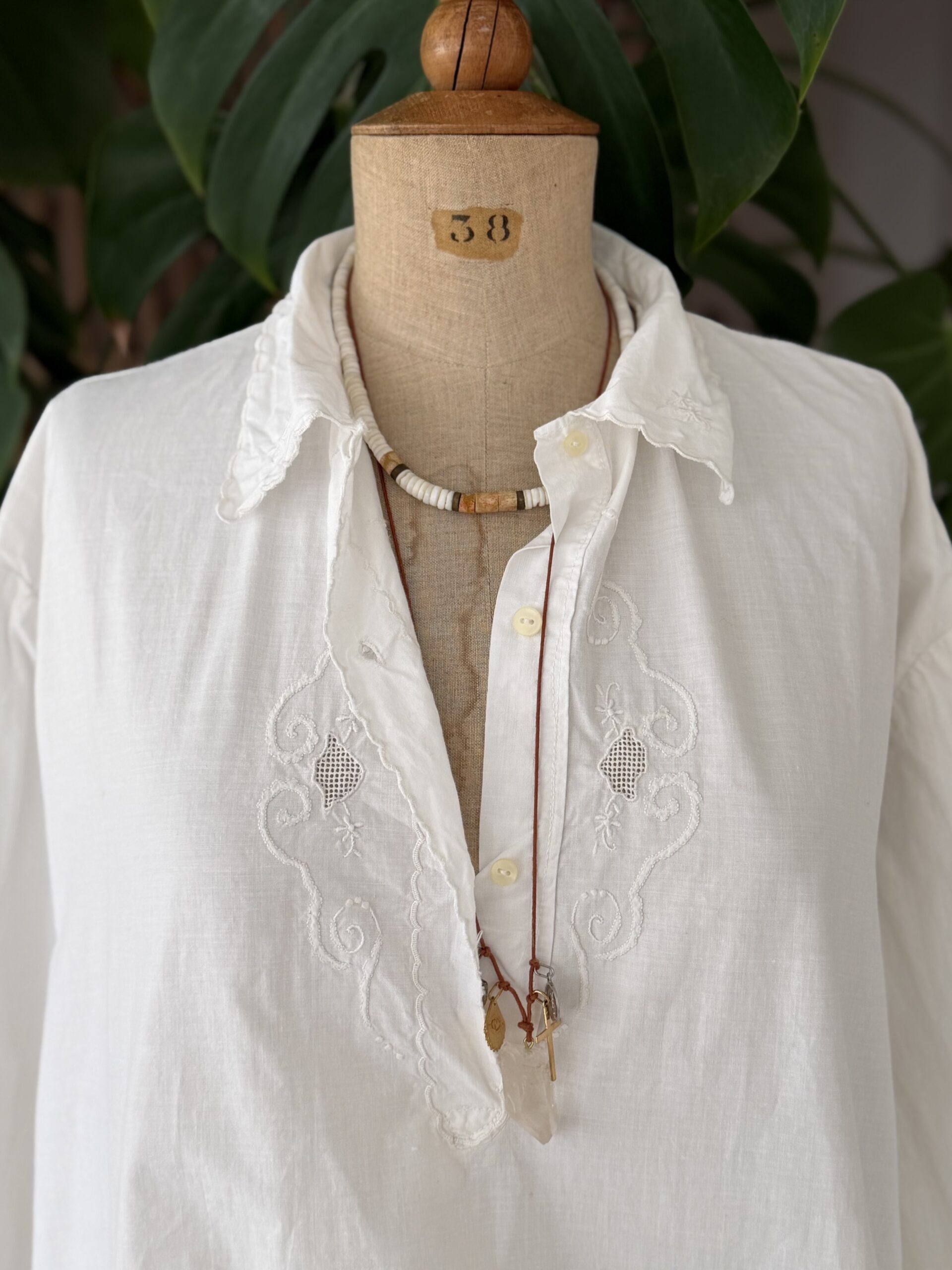 Blouse ancienne upcyclée en coton tissé datant du 20ème, finition broderie d’époque en carrure et au col. Empiècement dos en broderie ajourée coloris gris rosé entièrement piqué main. Finition point sellier contrasté. Une pièce Unique.