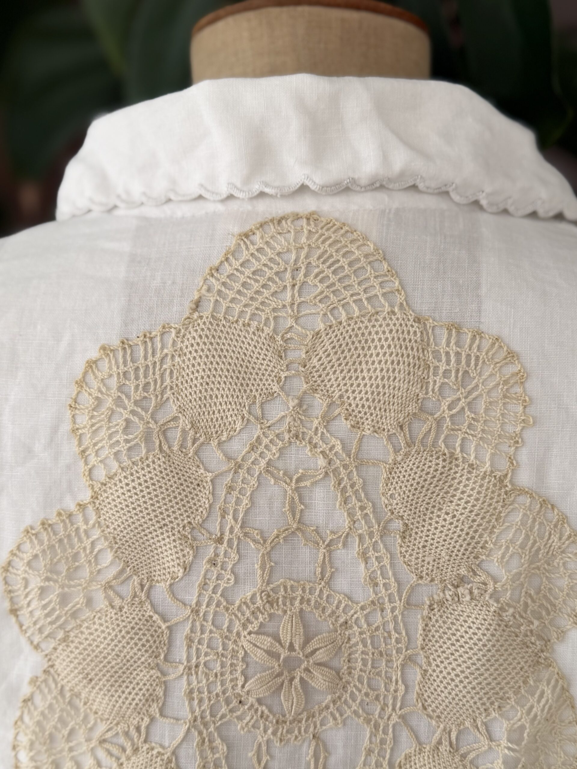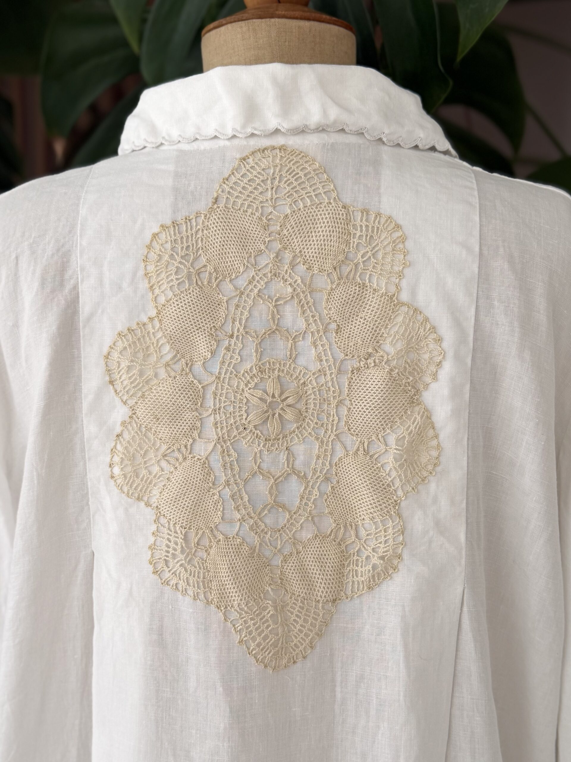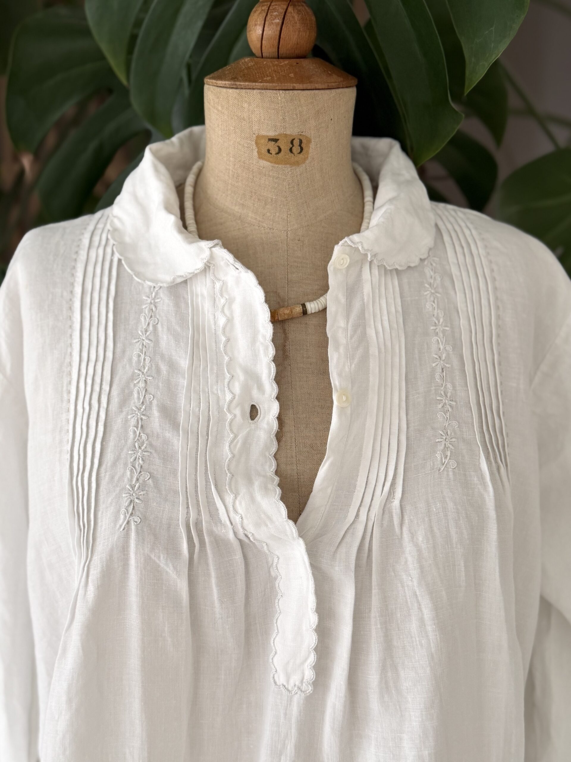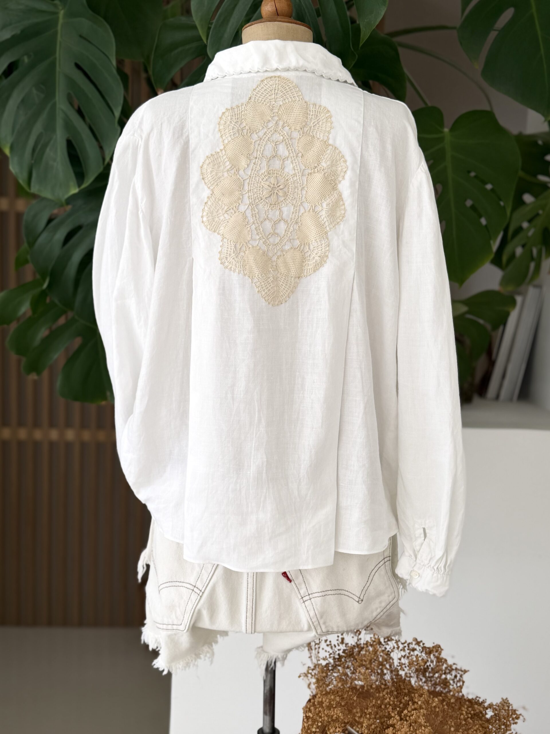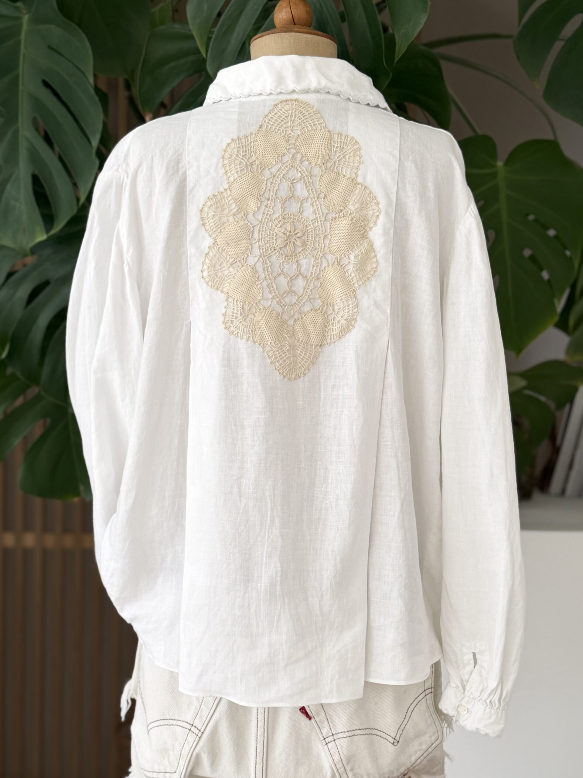 Blouse ancienne upcyclée en lin tissé datant du 20ème, finition plis couchés et broderie d’époque en carrure. Finition point sellier contrasté. Empiècement dos de dentelle. entièrement piqué main. Une pièce Unique.