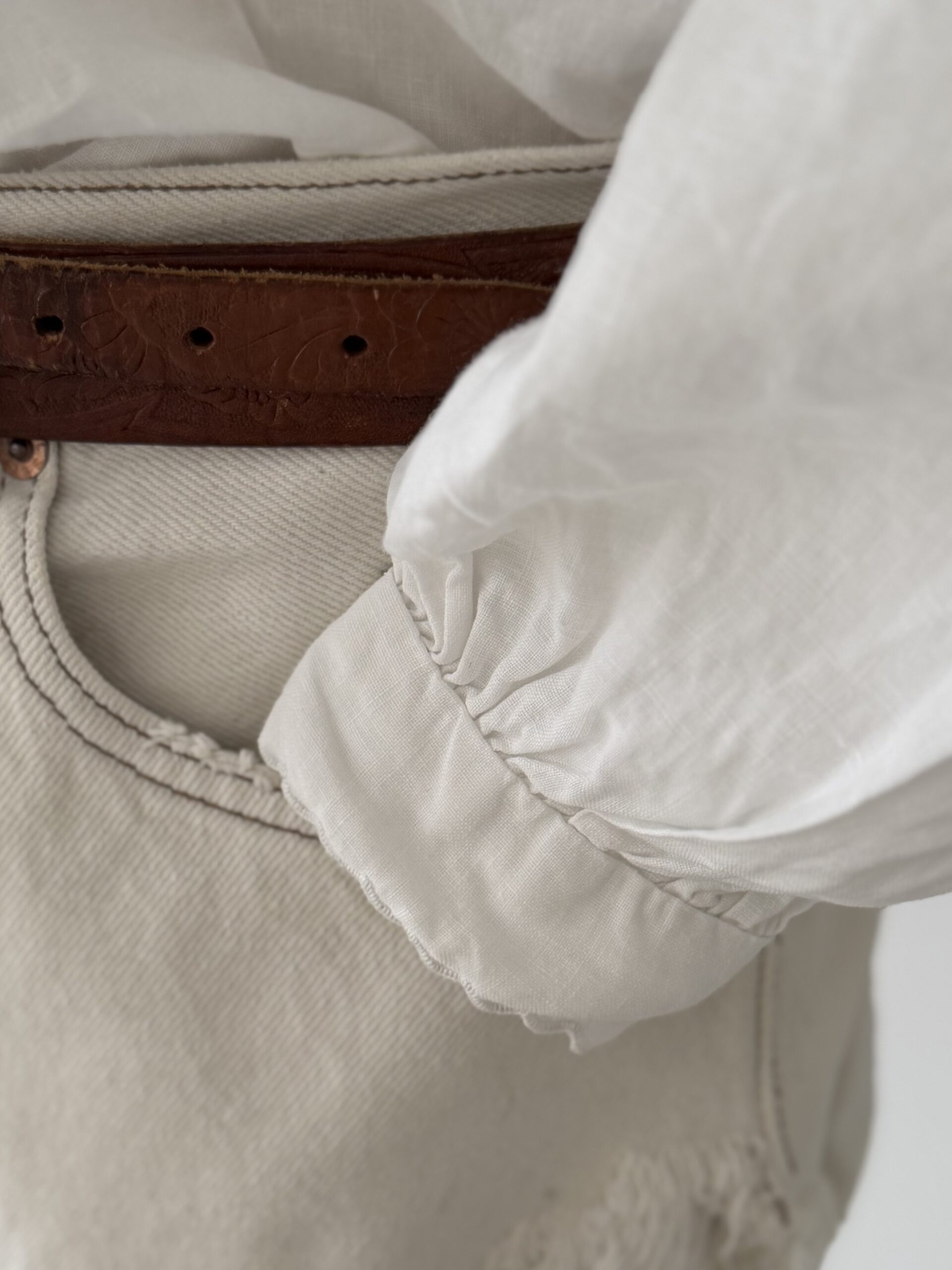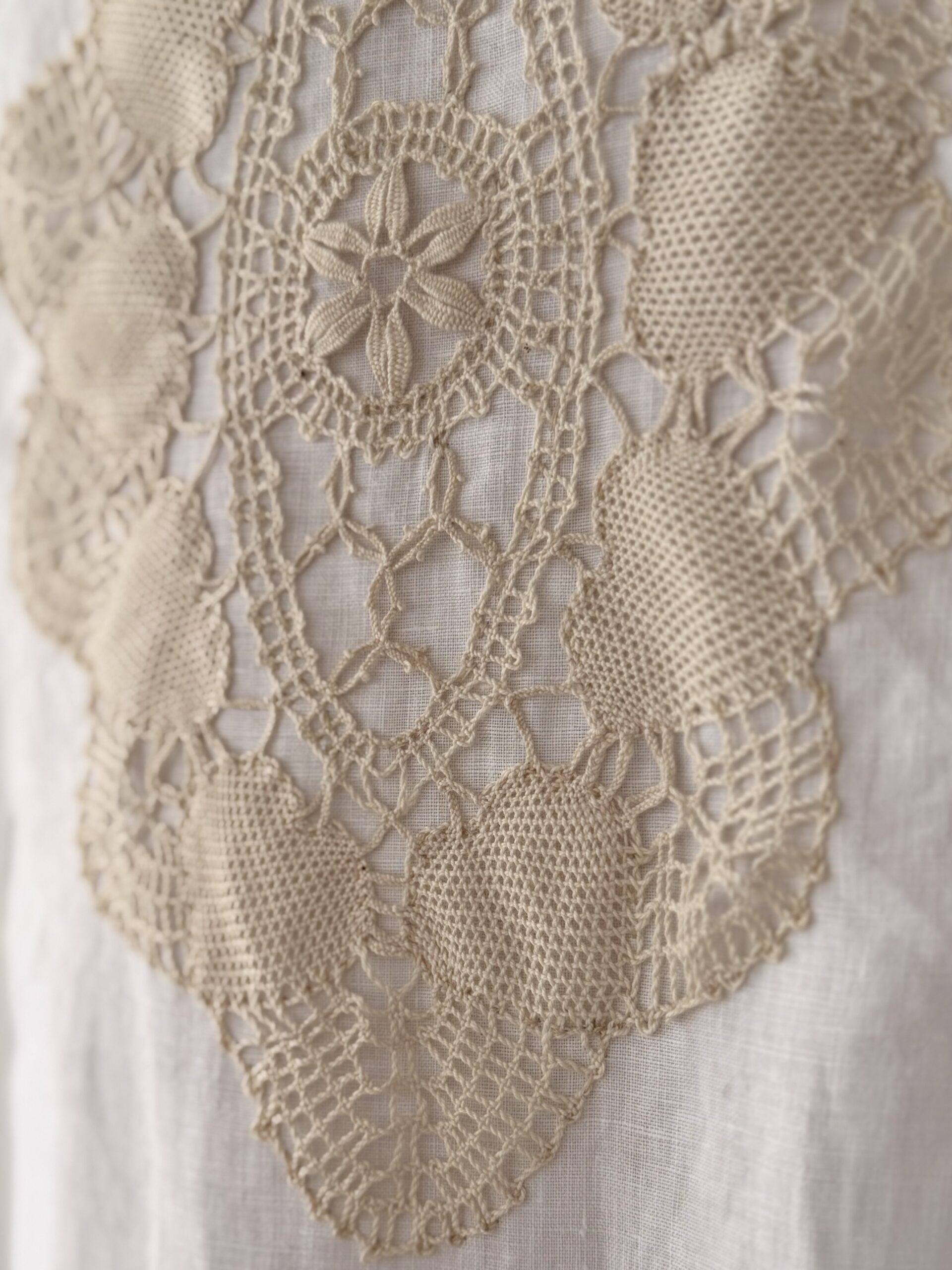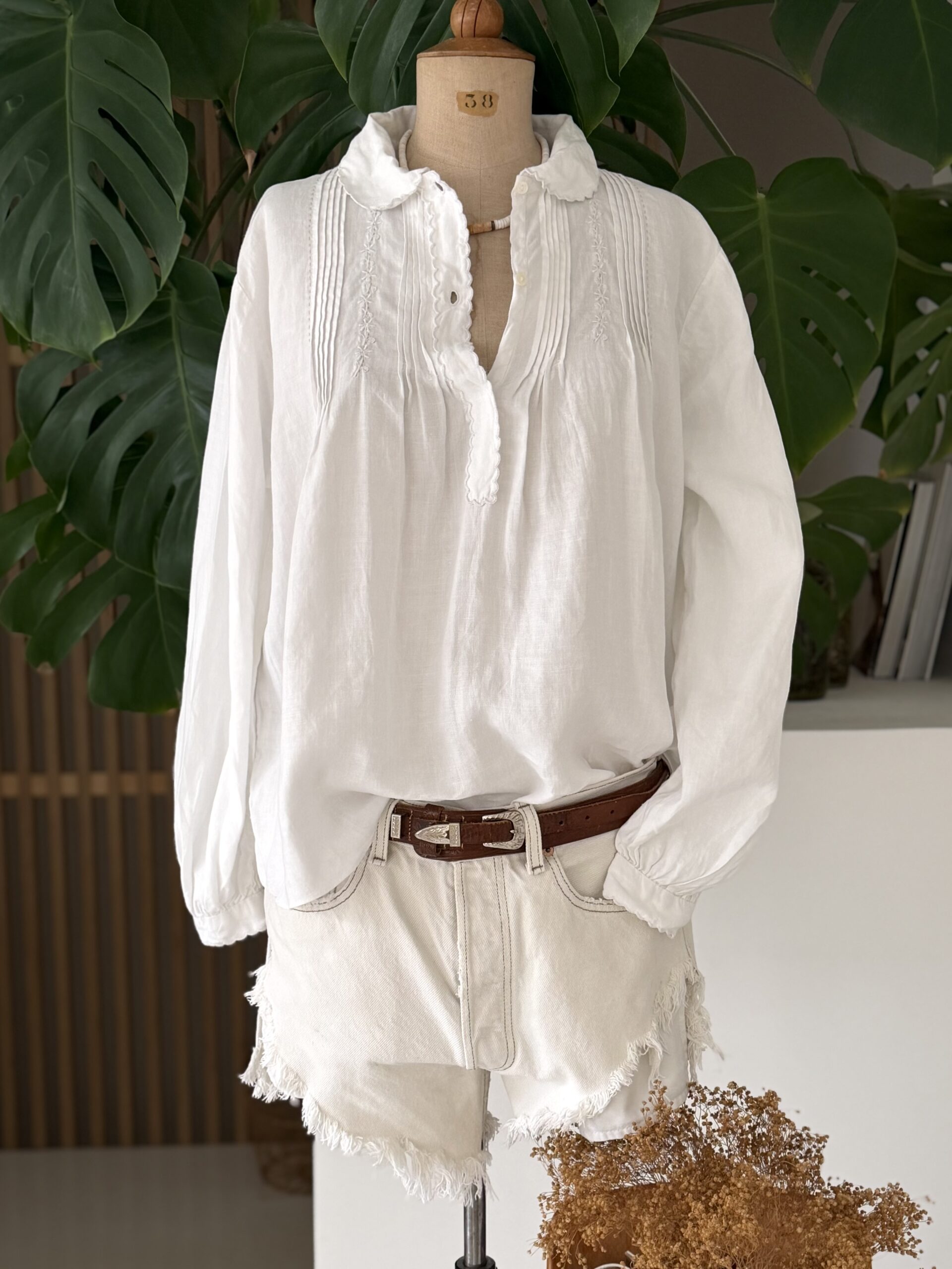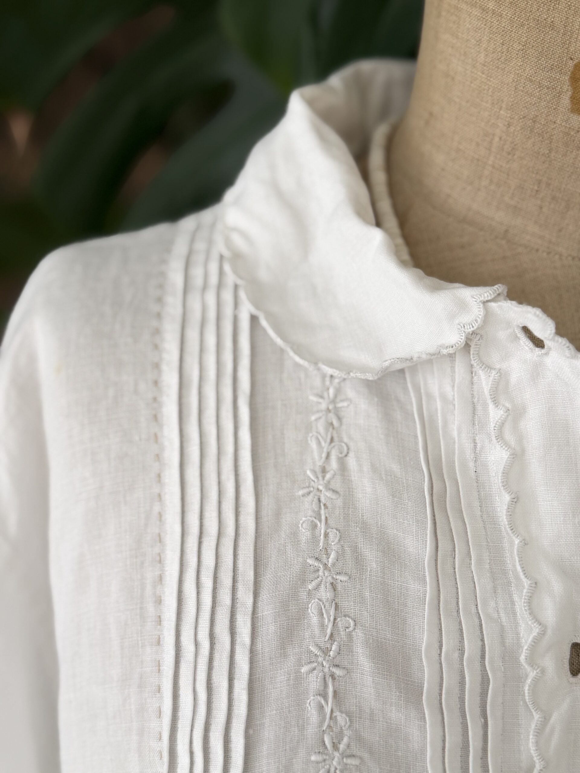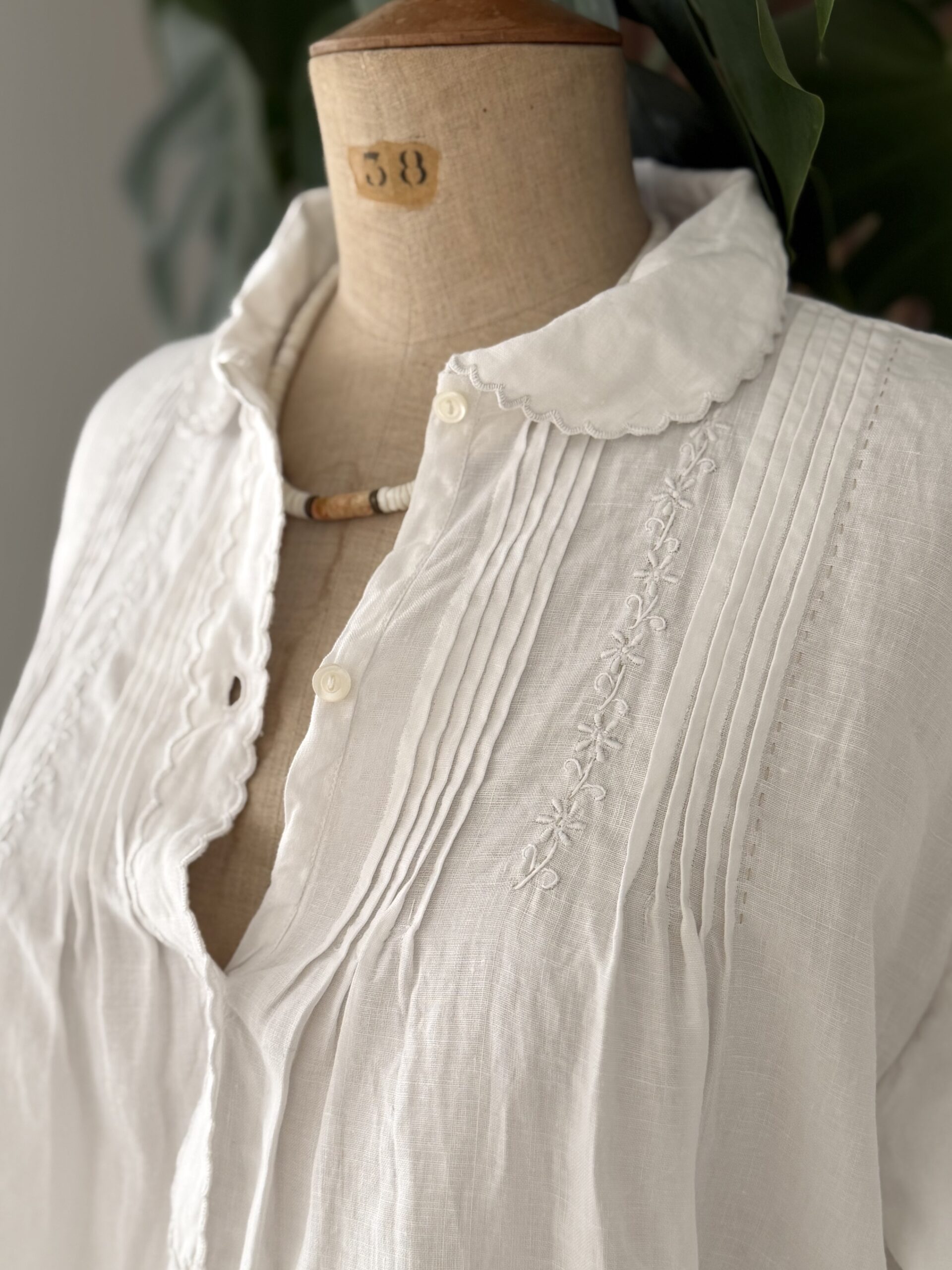 Blouse ancienne upcyclée en lin tissé datant du 20ème, finition plis couchés et broderie d’époque en carrure. Finition point sellier contrasté. Empiècement dos de dentelle. entièrement piqué main. Une pièce Unique.