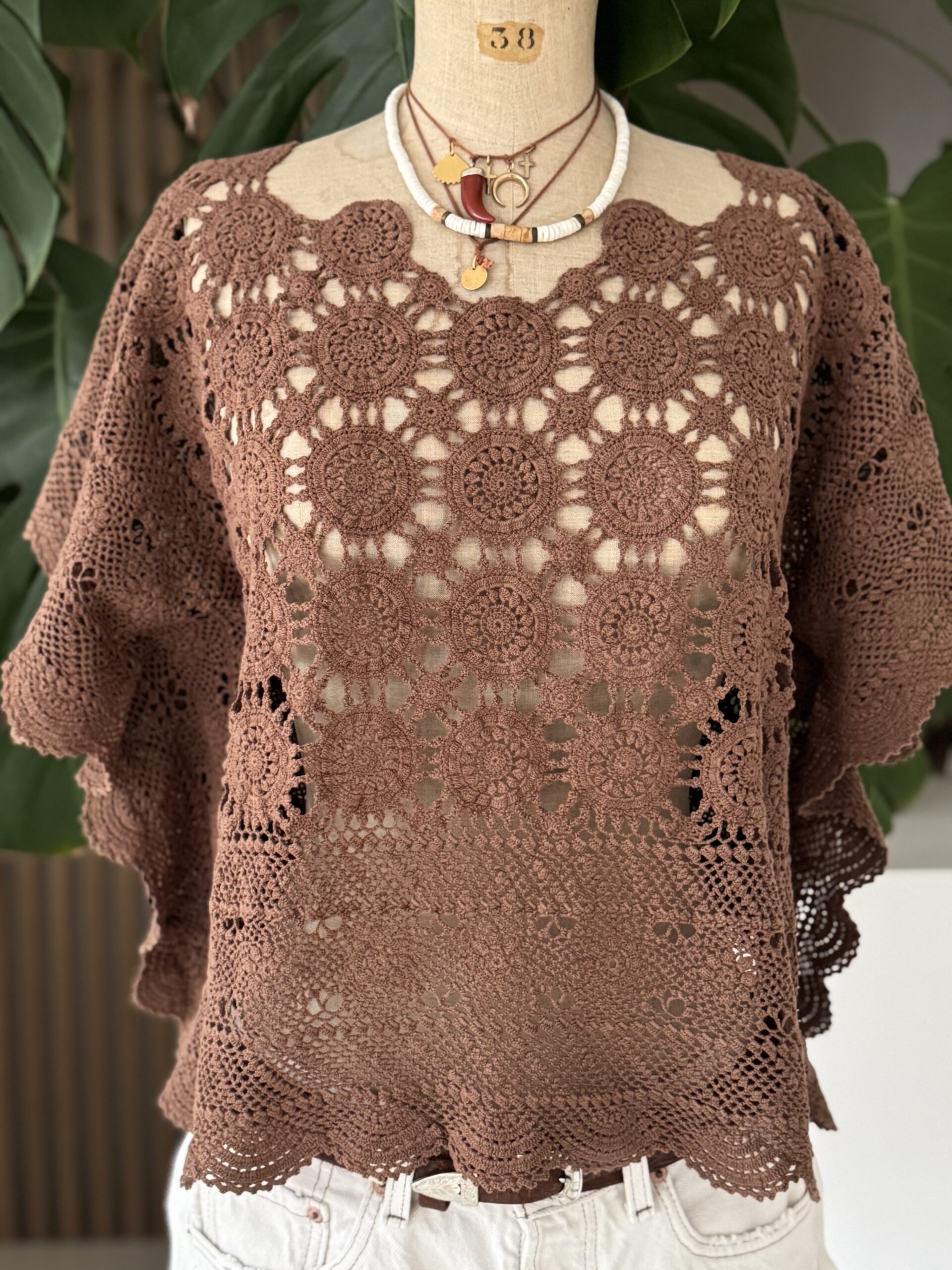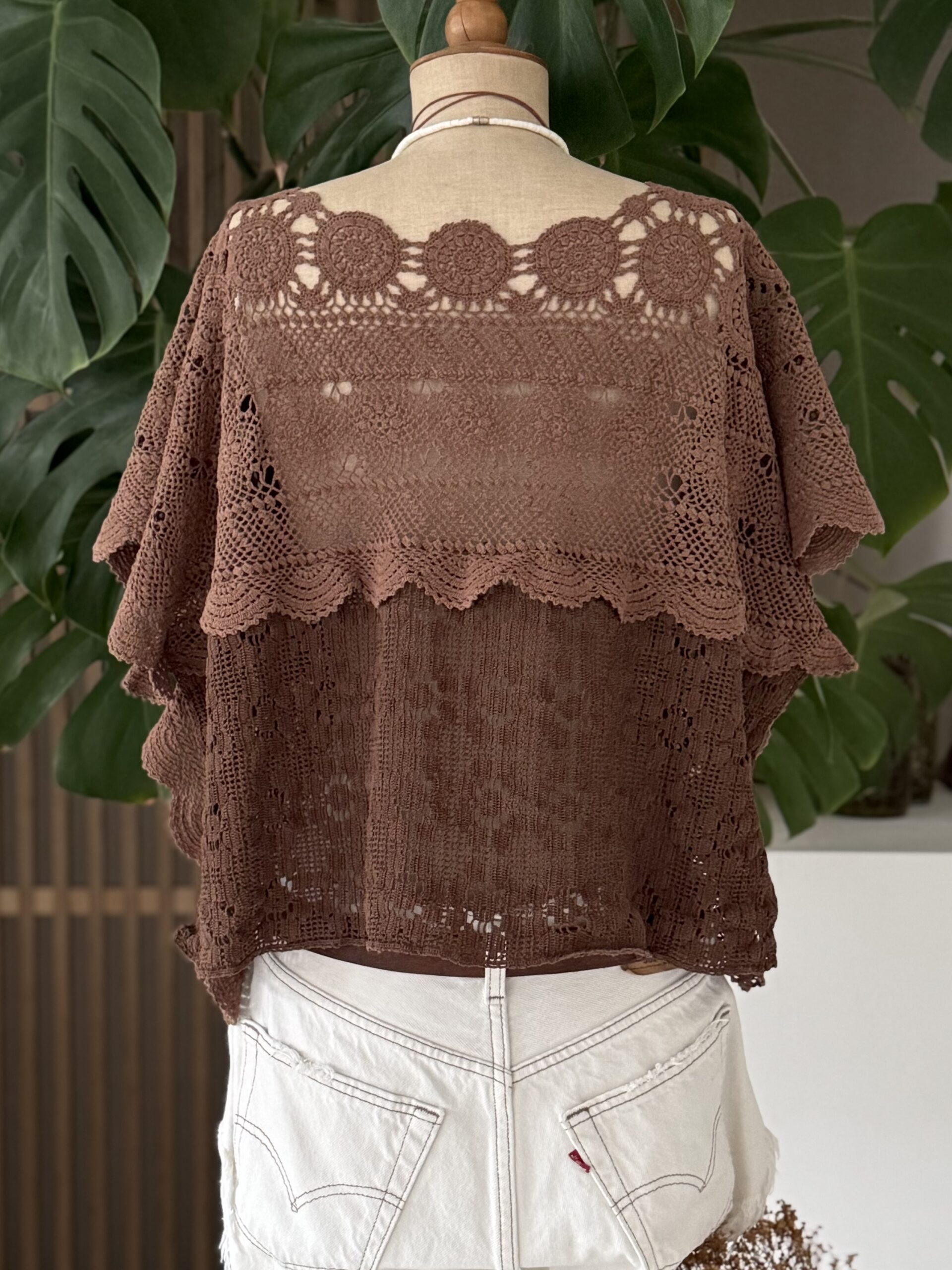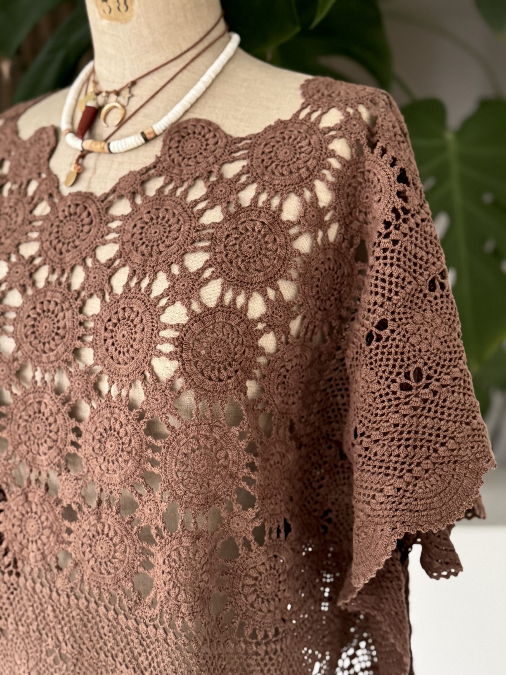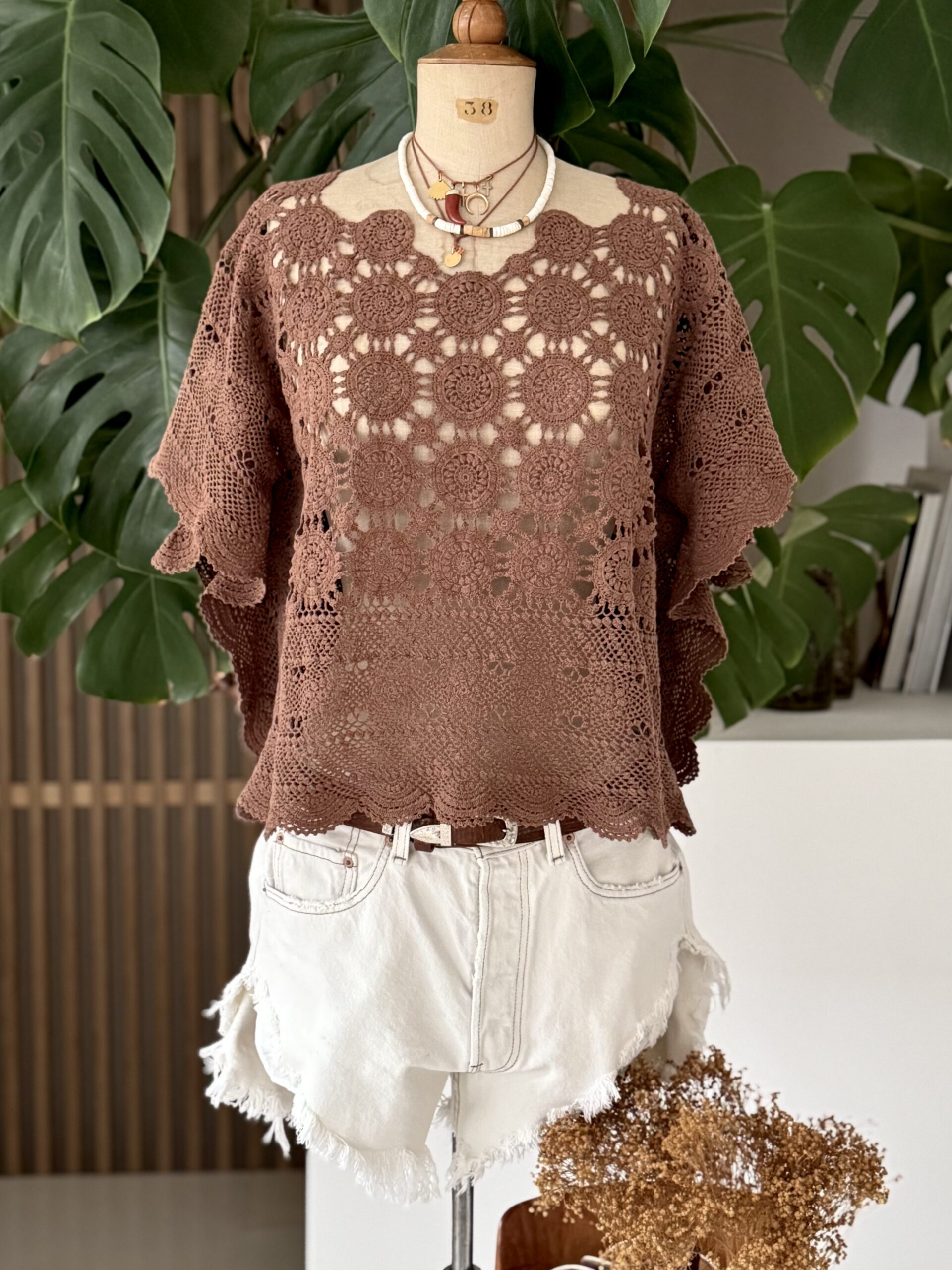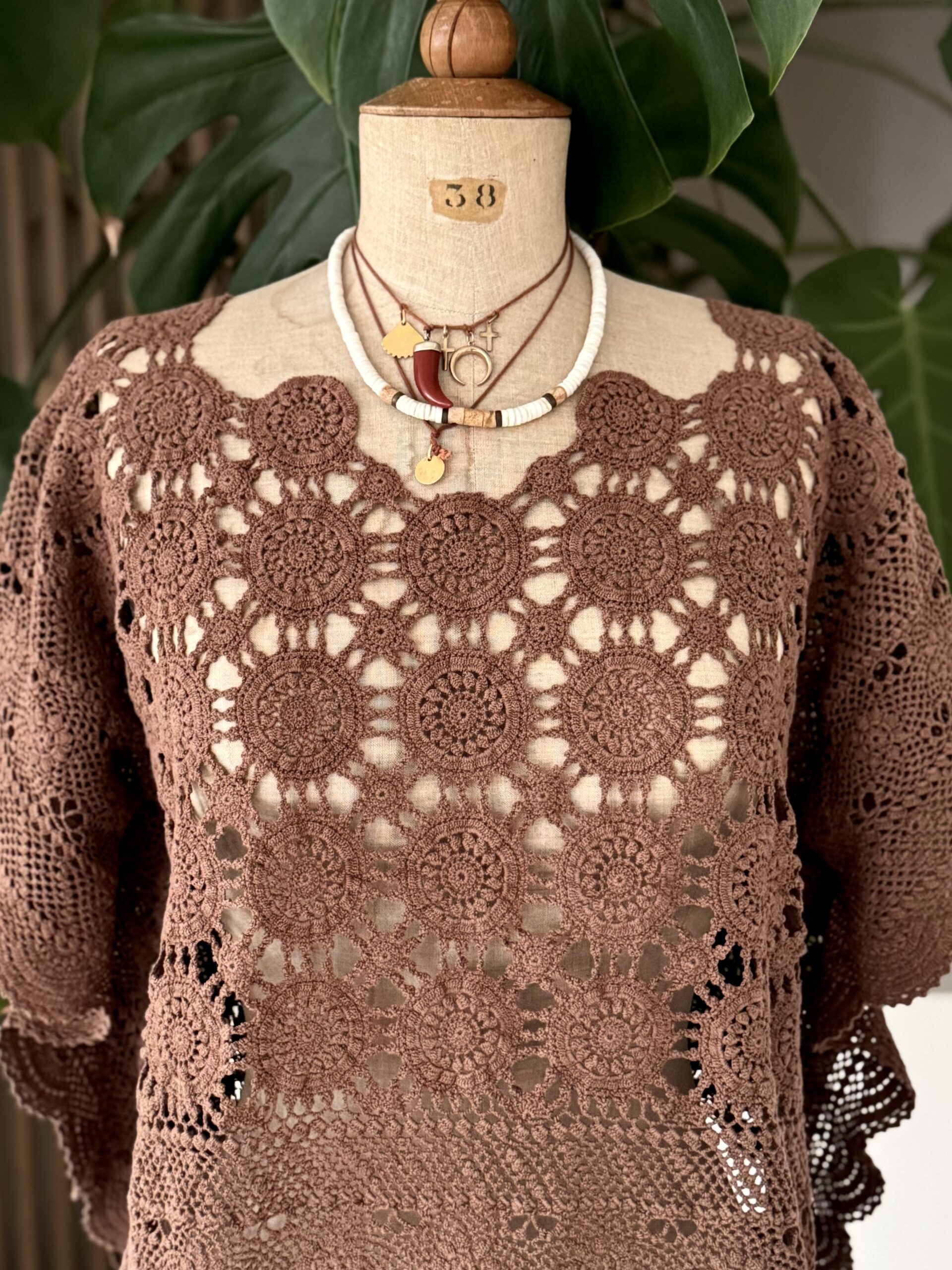 Blouse upcyclée confectionnée dans un travers de table ancien crochète de coton datant du 20ème siècle. Empiècement dos en crochet piqué main. Teinture machine fixée coloris Brun Nespresso.