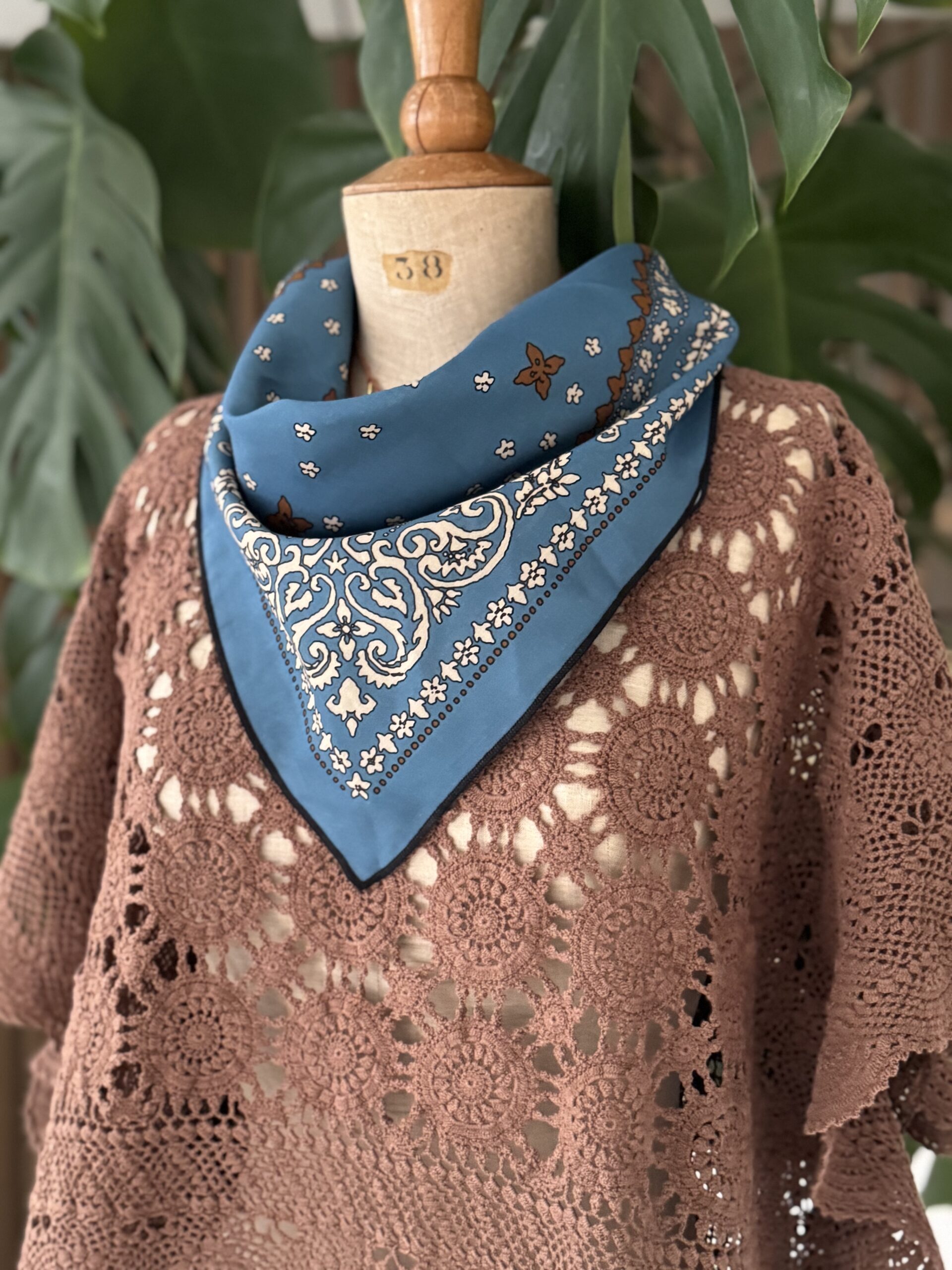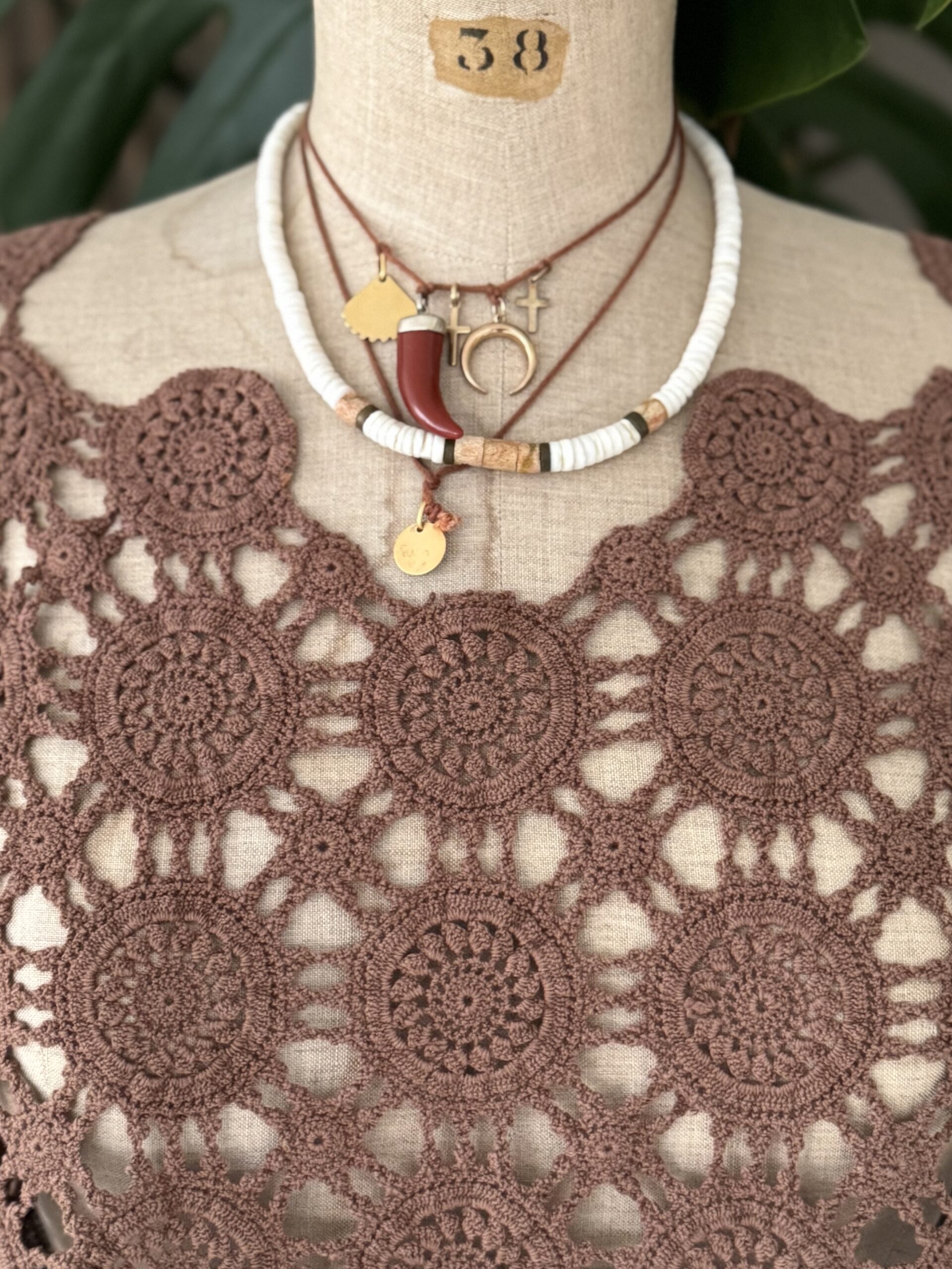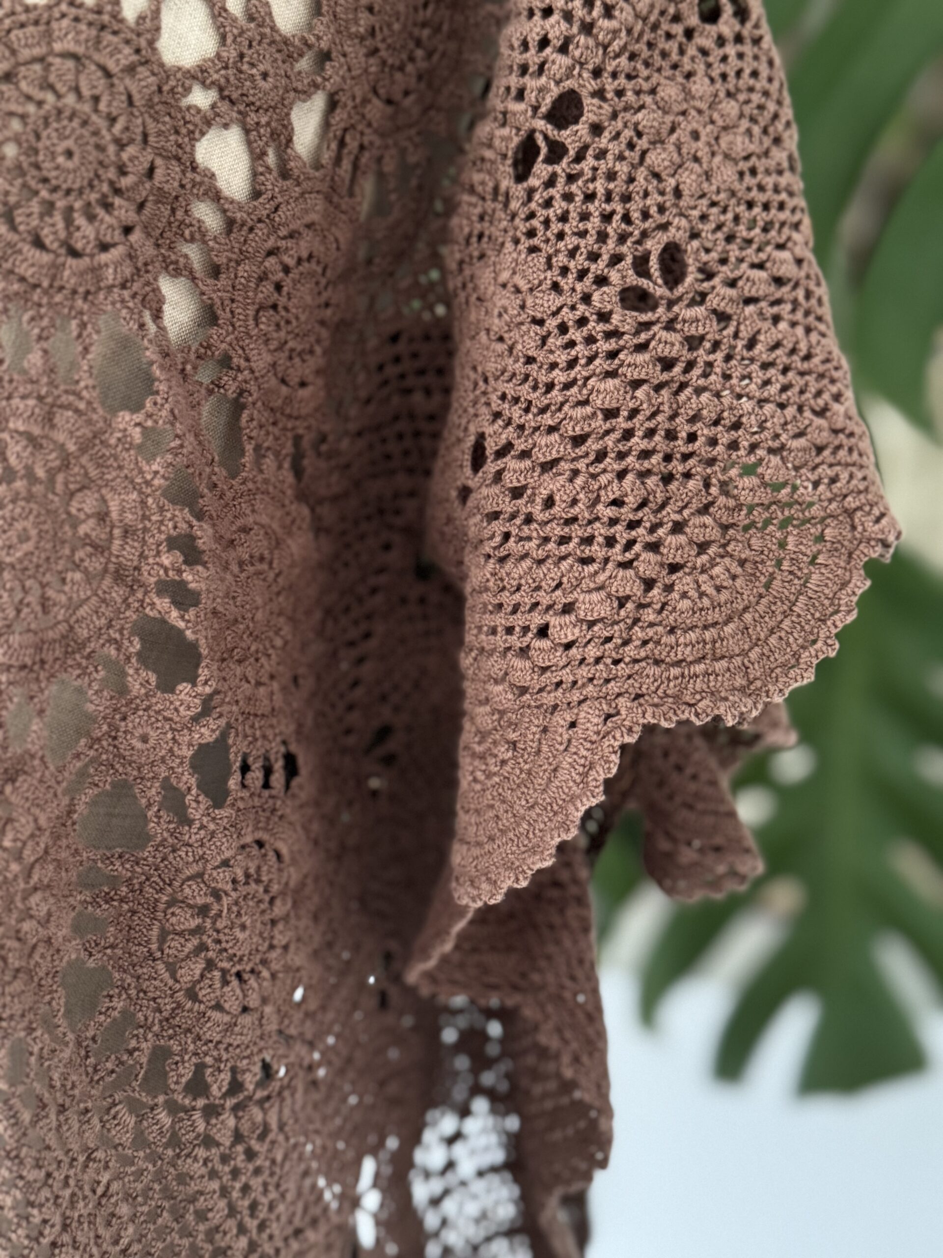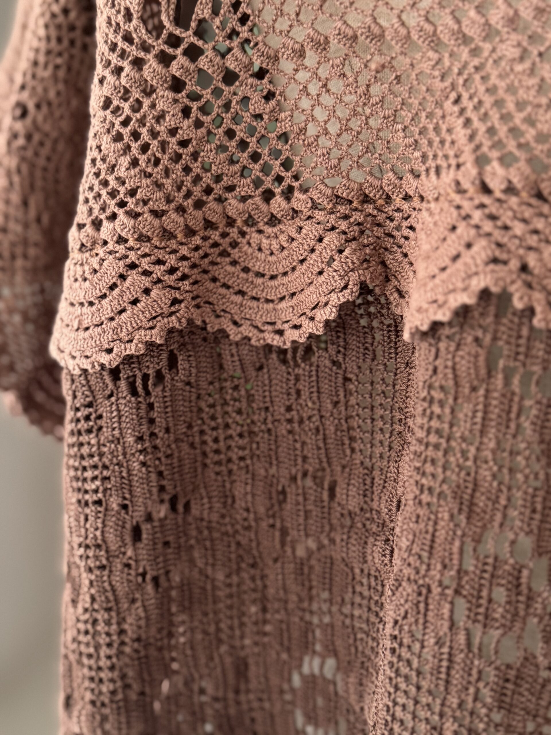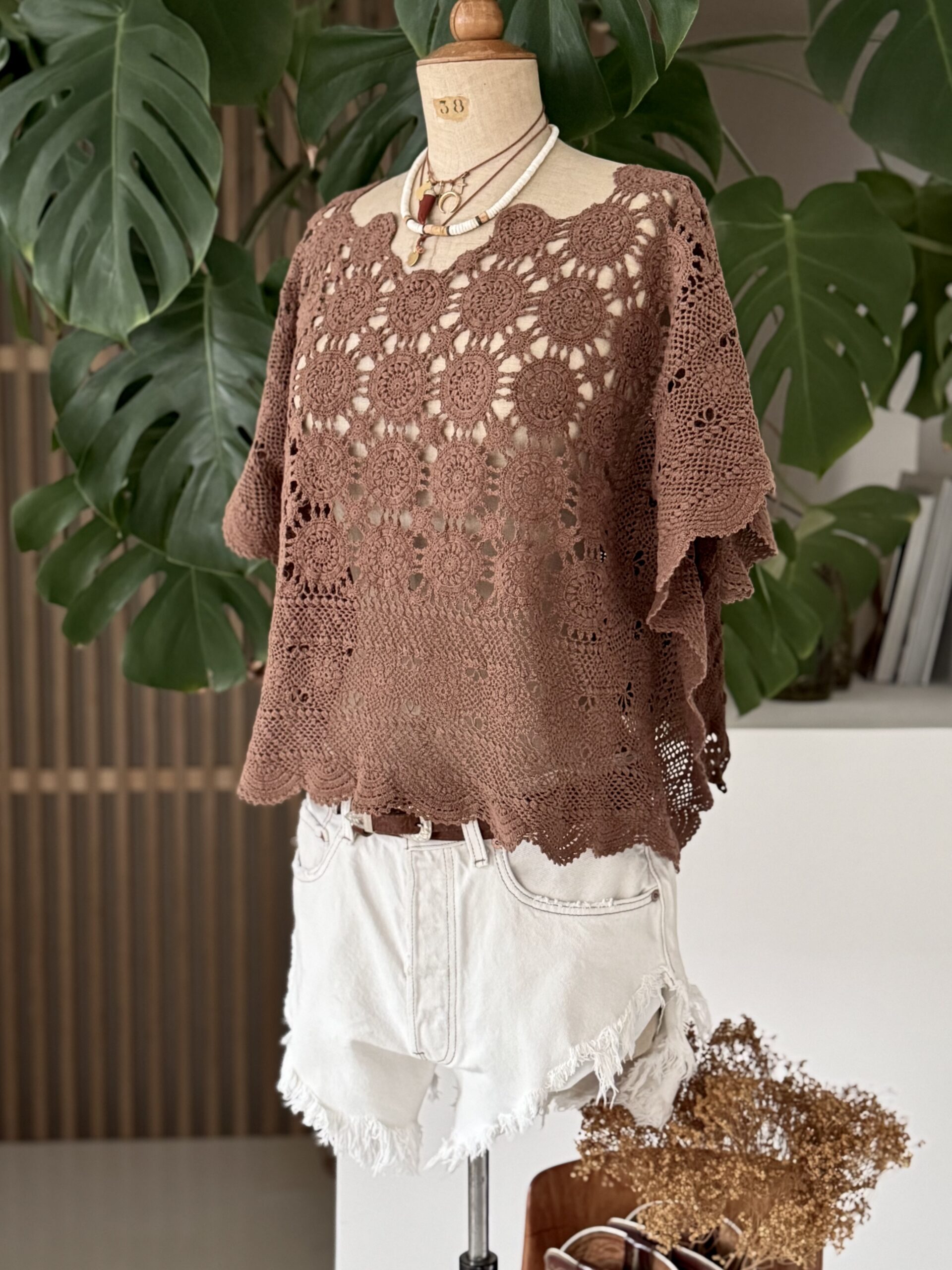 Blouse upcyclée confectionnée dans un travers de table ancien crochète de coton datant du 20ème siècle. Empiècement dos en crochet piqué main. Teinture machine fixée coloris Brun Nespresso.